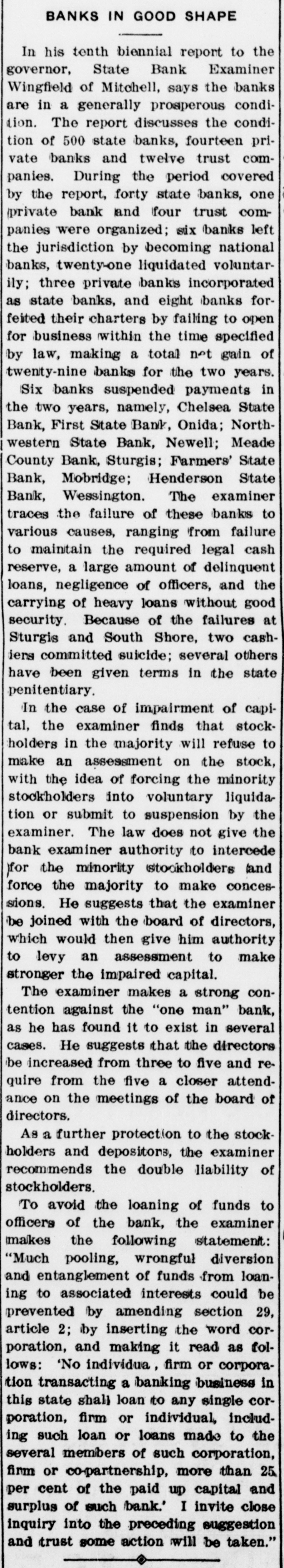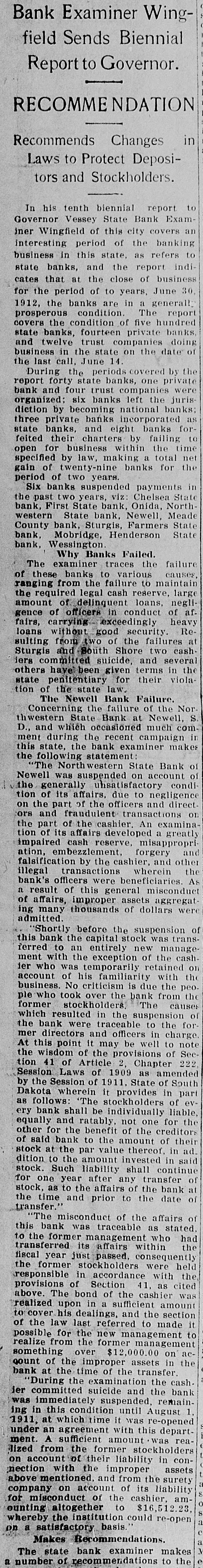 Examiner WingSends Biennial Report to Governor. ECOMME NDATION commends Changes in Laws to Protect Depositors and Stockholders. his tenth biennial report to vernor Vessey State Bank ExamWingfield of this city covers an eresting period of the banking iness in this state, as refers to banks, and the report indithat at the close of business the period of to years, June 30, the banks are in a generally sperous condition. The report the condition of five hundred banks, fourteen private banks, twelve trust companies doing iness in the state on the date of last call, June 14. During the periods covered by the forty state banks, one private and four trust companies were anized: six banks left the jurisby becoming national banks; private banks incorporated as banks, and eight banks fortheir charters by failing to for business within the time ecified by law, making a total net of twenty-nine banks for the of two years. Six banks suspended payments in past two years, viz: Chelsea State First State bank, Onida, Northstern State bank, Newell, Meade bank, Sturgis, Farmers State Mobridge, Henderson State Wessington Why Banks Failed. The examiner traces the failure these banks to various causes, from the failure to maintain required legal cash reserve, large of delinquent loans, negliof officers in conduct of afcarrying exceedingly heavy without good security. Reting from two of the failures at and South Shore two cashcommitted suicide, and several have been given terms in the penitentiary for their violaof the state law. The Newell Bank Failure. Concerning the failure of the Norwestern State Bank at Newell, S. and which occasioned much comduring the recent campaign in state, the bank examiner makes following statement: The Northwestern State Bank of well was suspended on account of generally unsatisfactory condiof its affairs, due to negligence the part of the officers and directand fraudulent transactions on part of the cashier. An examinaof its affairs developed a greatly paired cash reserve, misappropriembezzlement, forgery and Isification by the cashier, and other transactions wherein the officers were beneficiaries. As result of this general misconduct affairs, improper assets aggregatmany thousands of dollars were mitted. 'Shortly before the suspension of bank the capital stock was transto an entirely new managewith the exception of the cashwho was temporarily retained on count of his familiarity with the siness. No criticism is due the peowho took over the bank from the stockholders, The causes resulted in the suspension of bank were traceable to the fordirectors and officers in charge. this point it may be well to note wisdom of the provisions of Sec41 of Article 2, Chapter 222, Laws of 1909 as amended the Session of 1911, State of South wherein it provides in part follows: "The stockholders of evbank shall be individually liable,