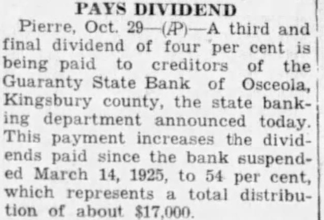 PAYS DIVIDEND Pierre, Oct. third and final dividend of four per cent is being paid creditors of the Guaranty State Bank of Osceola, Kingsbury county, the state banking department announced today. This payment increases the dividends paid since the bank suspended March 14, 1925, to 54 per cent, which represents total distribution of about