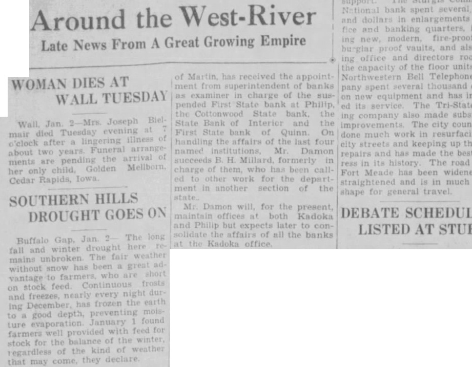Around the West-River Late News From A Great Growing Empire WOMAN DIES AT WALL TUESDAY Wall, Jan Joseph Bielevening at died Tuesday mair illness of after lingering o'clock Funeral about two the arrival of are pending ments her only child Golden Mellborn, Cedar Rapids, Iowa SOUTHERN HILLS DROUGHT GOES ON Jan The Buffalo Gap, fall and winter drought mains unbroken. The fair weather without snow has been great vantage to who are on stock feed frosts and freezes, every night dur ing December has frozen the to good depth, preventing ture January found farmers well provided with feed for stock for the balance of the winter regardless of the kind of weather that may come, they declare of Martin, has received the appoint- Bell Telephone com ment from of banks pany spent several thousand dollars charge of the sus- new equipment and has Increaspended First State bank Philip ed its service The Tri-State Millthe State bank. the ing company also made substantial State Bank of Interior and the improvements The city council has First State bank of Quinn On done much work in resurfacing the handling the affairs of the last four city streets and keeping up the road named Mr Damon repairs and has made the best prog succeeds H. Millard formerly in ress in its history The road out to charge them, has been callFort Meade has been widened and ed other work for the depart straightened and is in much better ment in another section of the shape for general travel. Mr Damon will, for the present, DEBATE SCHEDULE offices at both Kadoka and Philip but expects later to conLISTED AT STURGIS affairs of all the banks the Kadoka office