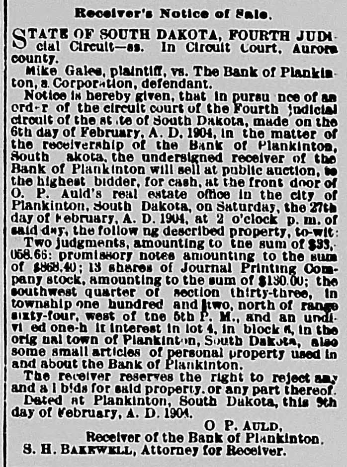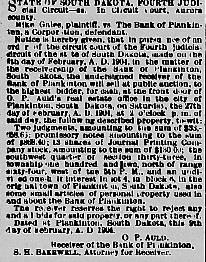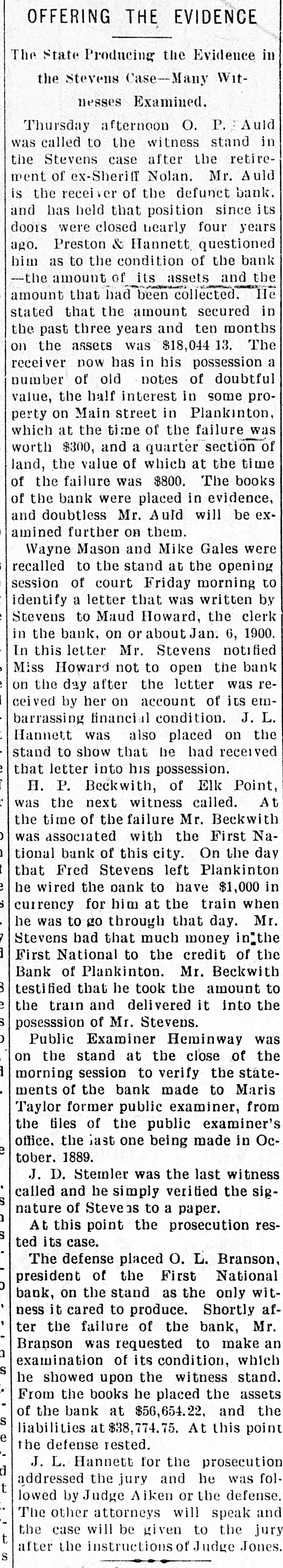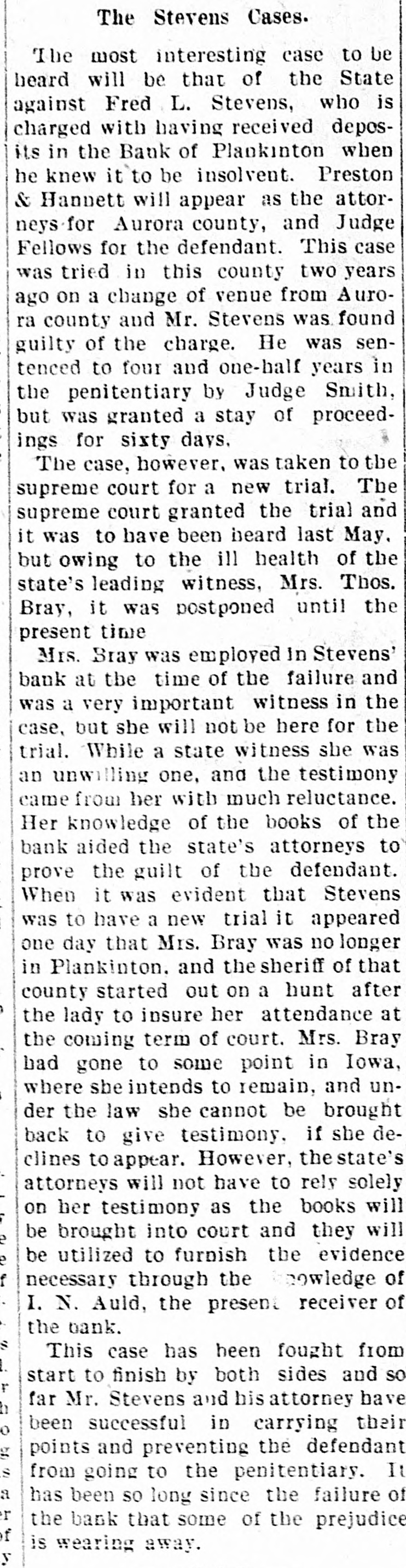 # The Stevens Cases. The most interesting case to be heard will be that of the State against Fred L. Stevens, who is charged with having received deposits in the Bank of Plankinton when he knew it to be insolvent. Preston & Hannett will appear as the attorneys for Aurora county, and Judge Fellows for the defendant. This case was tried in this county two years ago on a change of venue from Aurora county and Mr. Stevens was found guilty of the charge. He was sentenced to four and one-half years in the penitentiary by Judge Smith, but was granted a stay of proceedings for sixty days. The case, however, was taken to the supreme court for a new trial. The supreme court granted the trial and it was to have been heard last May. but owing to the ill health of the state's leading witness, Mrs. Thos. Bray, it was postponed until the present time Mrs. Bray was employed in Stevens' bank at the time of the failure and was a very important witness in the case, but she will not be here for the trial. While a state witness she was an unwilling one, and the testimony came from her with much reluctance. Her knowledge of the books of the bank aided the state's attorneys to prove the guilt of the defendant. When it was evident that Stevens was to have a new trial it appeared one day that Mrs. Bray was no longer in Plankinton, and the sheriff of that county started out on a hunt after the lady to insure her attendance at the coming term of court. Mrs. Bray had gone to some point in Iowa, where she intends to remain, and under the law she cannot be brought back to give testimony, if she declines to appear. However, the state's attorneys will not have to rely solely on her testimony as the books will be brought into court and they will be utilized to furnish the evidence necessary through the cowledge of I. N. Auld, the present receiver of the bank. This case has been fought from start to finish by both sides and so far Mr. Stevens and his attorney have been successful in carrying their points and preventing the defendant from going to the penitentiary. It has been so long since the failure of the bank that some of the prejudice is wearing away.