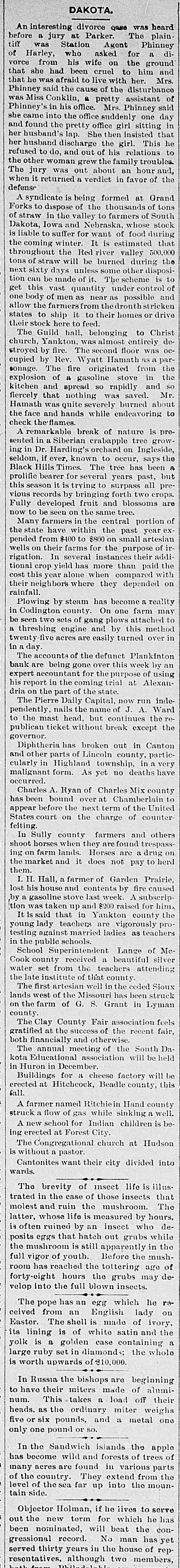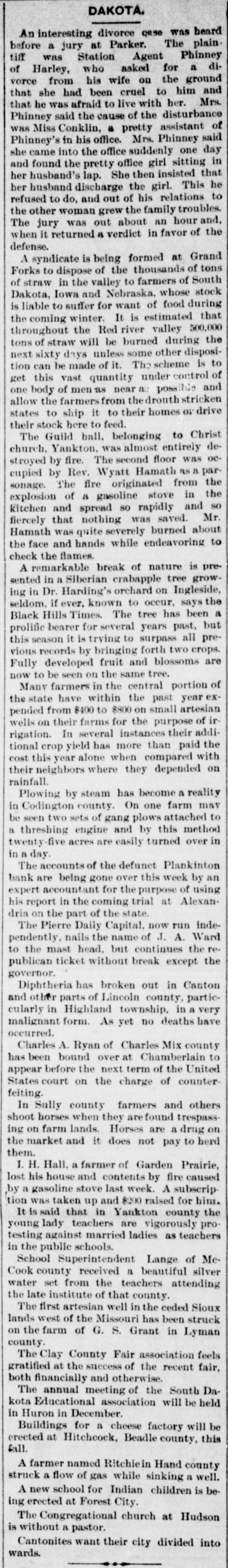 DAKOTA. An interesting divorce case was heard before a jury at Parker. The plain. tiff was Station Agent Phinney of Harley, who asked for a divorce from his wife on the ground that she had been cruel to him and that he was afraid to live with her. Mrs. Phinney said the cause of the disturbance was Miss Conklin, pretty assistant of Phinney's in his office. Mrs. Phinney said she came into the office suddenly one day and found the pretty office girl sitting in her husband's lap. She then insisted that her husband discharge the girl. This he refused to do, and out of his relations to the other woman grew the family troubles. The jury was out about an hour and, when it returned a verdict in favor of the defense. A syndicate is being formed at Grand Forks to dispose of the thousands of tons of straw in the valley to farmers of South Dakota, Iowa and Nebraska. whose stock is liable to suffer for want of food during the coming winter. It is estimated that throughout the Red river valley 500,000 tons of straw will be burned during the next sixty days unless some other disposition can be made of it. The scheme is to get this vast quantity under control of one body of men as near as possible and allow the farmers from the drouth stricken states to ship it to their homes or drive their stock here to feed. The Guild hall. belonging to Christ church, Yankton, was almost entirely destroyed by fire. The second floor was occupied by Rev. Wyatt Hamath as a parsonage. The fire originated from the explosion of a gasoline stove in the Kitchen and spread so rapidly and so fiercely that nothing was saved. Mr. Hamath was quite severely burned about the face and hands while endeavoring to check the flames. A remarkable break of nature is presented in a Siberian crabapple tree growing in Dr. Harding's orchard on Ingleside, seldom. if ever, known to occur, says the Black Hills Times. The tree has been a prolific bearer for several years past, but this season it is trying to surpass all previous records by bringing forth two crops. Fully developed fruit and blossoms are now to be seen on the same tree. Many farmers in the central portion of the state have within the past year expended from $400 to $800 on small artesian wells on their farms for the purpose of irrigation. In several instances their additional crop yield has more than paid the cost this year alone when compared with their neighbors where they depended on rainfall. Plowing by steam has become a reality in Codington county. On one farm may be seen two sets of gang plows attached to , threshing engine and by this method twenty-five acres are easily turned over in Asp B u The accounts of the defunct Plankinton bank are being gone over this week by an expert accountant for the purpose of using his report in the coming trial at AlexanIria on the part of the state. The Pierre Daily Capital, now run independently, nails the name of J. A. Ward o the mast head. but continues the republican ticket without break except the governor. Diphtheria has broken out in Canton and other parts of Lincoln county, particcularly in Highland township. in a very malignant form. As yet no deaths have occurred. Charles A. Ryan of Charles Mix county has been bound over at Chamberlain to appear before the next term of the United States court on the charge of countereiting. In Sully county farmers and others hoot horses when they are found trespassng on farm lands. Horses are a drug on he market and it does not pay to herd hem. I. H. Hall, a farmer of Garden Prairie, ost his house and contents by fire caused y a gasoline stove last week. A subscripfor raised 0008 and ion