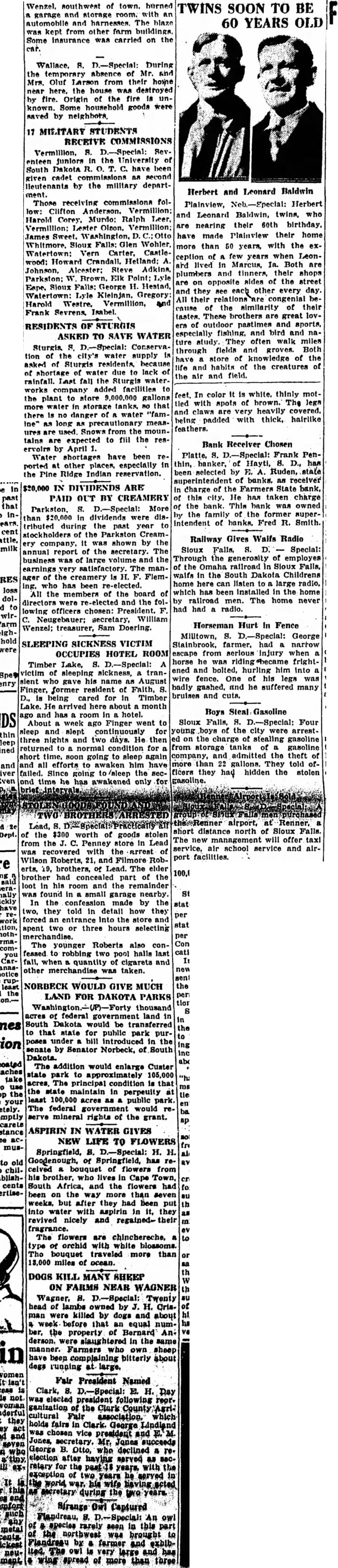 SLEEPING SICKNESS VICTIM OCCUPIES HOTEL ROOM Timber Lake, D.-Special: victim of sleeping sickness, transient gave his name August Finger, former resident of Faith, being cared for In Timber Lake. He here about month ago and has room In hotel. About week ago Finger went to sleep and slept continuously for three nights and days. He then returned to normal condition for short time, going to sleep again and all efforts to awaken him have failed. Since going the second time he has awakened only for Lead, S. the $300 worth of goods stolen from the Penney store In Lead recovered with the arrest of Wilson Roberts, and Filmore Roberts, 19, brothers, of Lead. The elder brother had concealed part of the loot in his room and the remainder found In small garage nearby. In the confession made by the they told in detail how they forced an entrance Into the store spent two or three hours selecting merchandise. The younger Roberts also confessed to robbing two pool halls last fall, when quantity of cigarets and other merchandise was taken.