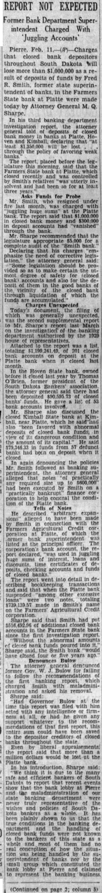 Bank Receiver Chosen Platte, Frank Penthin, of Hayti, D., has been selected by FL. Ruden, state superintendent of banks, as receiver In of the Farmers State this city. He has taken charge the bank. This bank owned the family of the former Intendent of hanks, Fred R. Smith.
