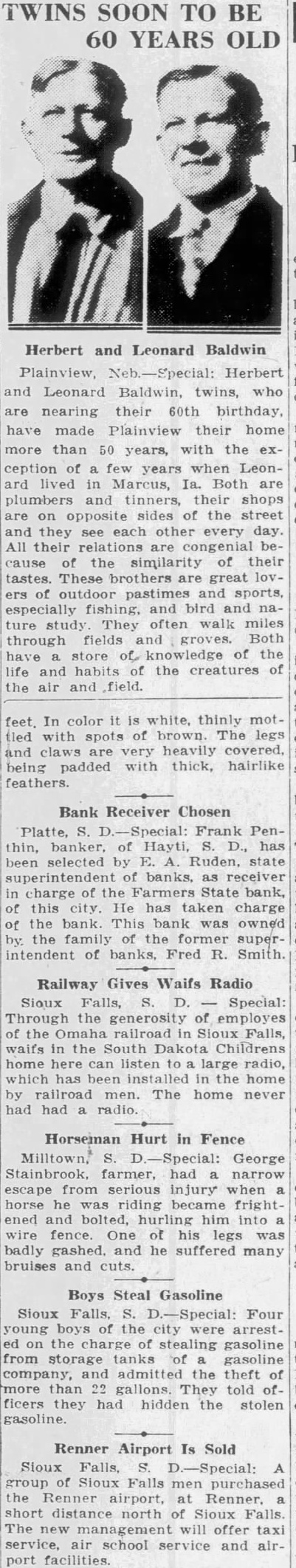 Plainview, Herbert and Leonard Baldwin, who are nearing their 60th have made Plainview their home more than 50 years, with the exception of few years when Leonlived Marcus, Ia. Both are plumbers and tinners, their shops on opposite sides of the street and they see each other every day. All their congenial because the similarity of their tastes. These brothers are great lovers outdoor pastimes and sports, especially fishing. and bird and na. ture study. They often walk miles through fields and groves. Both have store of knowledge of the life and habits the creatures of the air and field. feet. In color It is white. thinly mottied with spots of brown. The and claws very heavily covered. padded with thick, hairlike feathers.