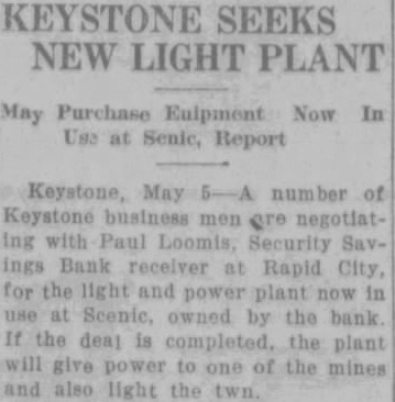 KEYSTONE SEEKS NEW LIGHT PLANT May Purchase Eulpment Now In Use at Senic, Report Keystone, 5-A number of Keystone business men are negotiatIng with Paul Loomis, Security Savings Bank receiver at Rapid City, for the light and power plant now in use at Scenic, owned by the bank If the deal is completed. the plant will give power to one of the mines and also light the twn.