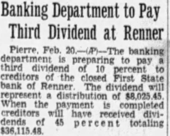 OCR is poor but the article headline and text indicate the First State Bank of Renner was closed and the state Banking Department is paying a third dividend — implying the bank was suspended/closed and in receivership. No mention of a depositor run. Dates taken from the newspaper publication (1934-02-20); actual suspension likely earlier but not specified in the text.