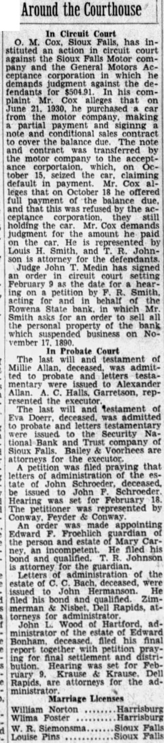 Around the Courthouse In Circuit Court O. M. Cox, Sioux Falls, has instituted an action circuit court against the Sioux Falls Motor company and the General Motors Acceptance corporation which he demands judgment the defendants $504.91 his plaint Mr Cox alleges that on June 1930, he purchased car from the motor company. making partial payment and siginng note and conditional contract the balance due The note and contract was by the motor company to the acceptcorportaion, which, on Oc15. seized the car, claiming default in Mr. Cox alleges that on October he offered full payment of the due, and that this was by the acceptance they still holding the car. Mr. Cox demands judgment for the amount he paid on the car. He is by Louis H. Smith. and R. Johnson is attorney the defendants. Judge John Medin has signed order in circuit court setting February the date for hearing on petition R. Smith. acting for behalf the Rowena bank in which Mr Smith asks for an order to sell all the personal property of the bank which business on November In Probate Court The last will and testament of Millie Allan, deceased. was admitted to probate and letters testamentary were issued Allan. C. Halls. Garretson, repthe The last will and testament of Eva Doerr, deceased. was admitted to probate and letters testamentary to the Security National Bank and Trust company of Sioux Falls. & Voorhees are attorneys for the was filed praving that letters administration of the esJohn issued to John Schroeder Hearing set for February was represented by Feyder & Conway An was made appointing Edward F. Froehlich guardian of the and estate Mary Car ney. an filed his bond and qualified. is attorney for the guardian. Letters of administration of the estate of C. C. Bach. deceased, were issued to John Hermanson. He filed his bond and qualified. Zimmerman & Nisbet. Dell Rapids, attorneys for John Wood of Hartford. administrator the estate of Bonham. filed his final report with praying for final settlement and bution. Hearing was set for February Krause Krause, Dell Rapids. are attorneys for the administrator Marriage Licenses William Norton Harrisburg Wlima Foster Harrisburg W. R. Siemonsma Sioux Falls Louise Pins Sioux Falls