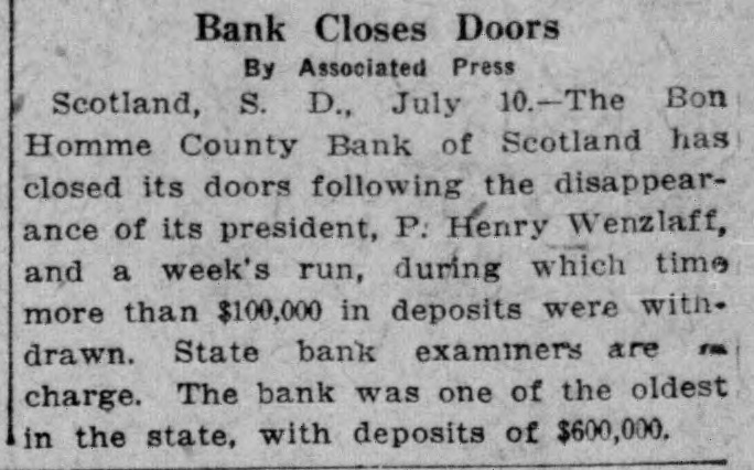Bank Closes Doors By Associated Press Scotland, S. D., July 0.-The Bon Homme County Bank of Scotland has closed its doors following the disappearance of its president, P: Henry Wenzlaff, and a week's run, during which time more than $100,000 in deposits were with. drawn. State bank examiners are 10% charge. The bank was one of the oldest in the state, with deposits of $600,000.