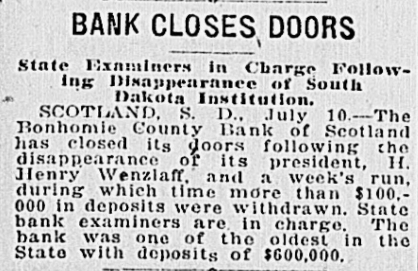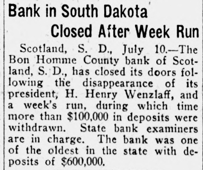 Bank in South Dakota Closed After Week Run Scotland, S. D., July 10.-The Bon Homme County bank of Scotland, S. D., has closed its doors following the disappearance of its president, H. Henry Wenzlaff, and a week's run, during which time more than $100,000 in deposits were withdrawn. State bank examiners are in charge. The bank was one of the oldest in the state with deposits of $600,000.