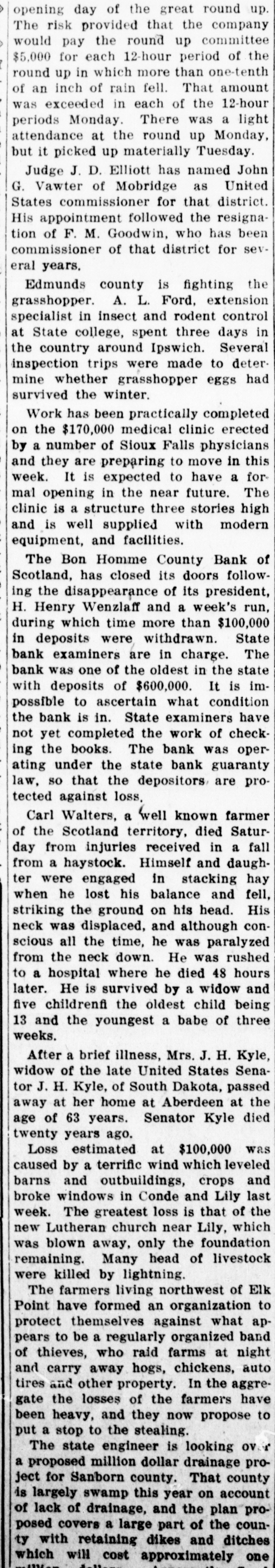States commissioner for that district. His appointment followed the resignation of F. M. Goodwin, who has been commissioner of that district for several years. Edmunds county is fighting the grasshopper. A. L. Ford, extension specialist in insect and rodent control at State college, spent three days in the country around Ipswich. Several inspection trips were made to determine whether grasshopper eggs had survived the winter. Work has been practically completed on the $170,000 medical clinic erected by a number of Sioux Falls physicians and they are preparing to move in this week. It is expected to have a formal opening in the near future. The clinic is a structure three stories high and is well supplied with modern equipment, and facilities. The Bon Homme County Bank of Scotland, has closed its doors following the disappearance of its president, H. Henry Wenzlaff and a week's run, during which time more than $100,000 in deposits were withdrawn. State bank examiners are in charge. The bank was one of the oldest in the state with deposits of $600,000. It is impossible to ascertain what condition the bank is in. State examiners have not yet completed the work of checking the books. The bank was operating under the state bank guaranty law, so that the depositors are protected against loss, Carl Walters, a well known farmer of the Scotland territory, died Saturday from injuries received in a fall from a haystock. Himself and daughter were engaged in stacking hay when he lost his balance and fell, striking the ground on his head. His neck was displaced, and although conscious all the time, he was paralyzed from the neck down. He was rushed to a hospital where he died 48 hours later. He is survived by a widow and five childrenfi the oldest child being 13 and the youngest a babe of three weeks. After a brief illness, Mrs. J. H. Kyle, widow of the late United States Senator J. H. Kyle, of South Dakota, passed away at her home at Aberdeen at the age of 63 years. Senator Kyle died twenty years ago. Loss estimated at $100,000 was caused by a terrific wind which leveled barns and outbuildings, crops and broke windows in Conde and Lily last week. The greatest loss is that of the new Lutheran church near Lily, which was blown away, only the foundation remaining. Many head of livestock were killed by lightning. The farmers living northwest of Elk Point have formed an organization to protect themselves against what appears to be a regularly organized band of thieves, who raid farms at night and carry away hogs, chickens, auto tires and other property. In the aggregate the losses of the farmers have been heavy, and they now propose to put a stop to the stealing. The state engineer is looking OV. a proposed million dollar drainage project for Sanborn county. That county is largely swamp this year on account of lack of drainage, and the plan proposed covers a large nart of the coun.