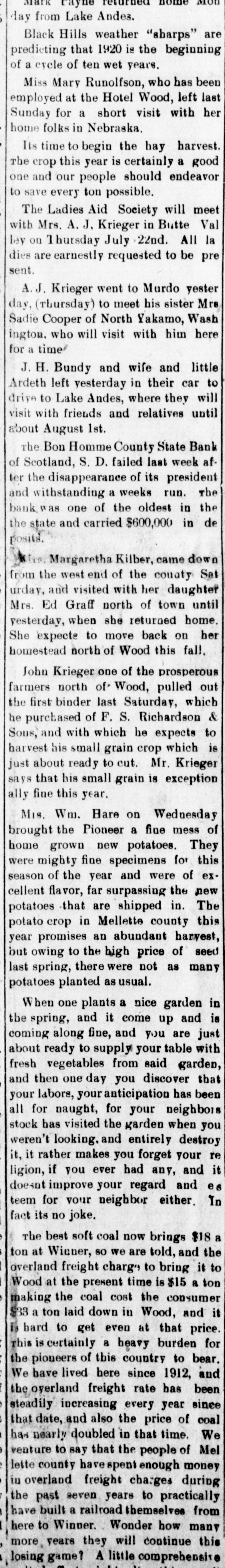 MOD Mark returned nome day from Lake Andes. Black Hills weather "gharps" are predicting that 1920 is the beginning of a cycle of ten wet years. Miss Mary Runolfson, who has been employed at the Hotel Wood, left last her Sunday for a short visit with home folks in Nebraska. Its time to begin the hay harvest. The crop this year is certainly a good one and our people should endeavor to save every ton possible. The Ladies Aid Society will meet Val with Mrs. A. J. Krieger in Butte la ley on Thursday July 22nd. All dies are earnestly requested to be pre sent. A.J. Krieger went to Murdo yester Mrs (rhursday) to meet his sister day, Sadie Cooper of North Yakamo, Wash here ington. who will visit with him for a time J.H. Bundy and wife and little to Ardeth left yesterday in their car will driya to Lake Andes, where they visit with friends and relatives until about August 1st. the Bon Homme County State Bank afScotland, S. D. failed last week of disappearance of its president a weeks run. ter and the withstanding in the the bank was one of the oldest de the state and carried $600,000 in posits. Margaretha Kilber, came down Sat States. the west end of the couaty from and visited with her daughter until urday, Ed Graff north of town home. yesterday, Mrs. when she returned her expecte to move back on fall. homestead She north of Wood this John Krieger one of the prosperous out north of' Wood, pulled which farmers first binder last Saturday, & the purchased of F. S. Richardson to he and with which he expects which is harvest Sons, his small grain crop about ready to cut. Mr. Krieger says just that his small grain is exception ally fine this year. Mis. Wm. Hare on Wednesday of the Pioneer a fiue mess They brought grown new potatoes. this fine specimens of the year and were home were mighty the for of new exseason flavor, far surpassing The cellent that are shipped in. this in Mellette county an year to the high potato potatoes owing promises crop abundant price of harvest, many seed but last spring, there were not as potatoes planted as usual. When one plants a nice garden in is spring, and it come up and just the along fine, and you are with coming to supply your table from said that then one day you and about fresh ready vegetables discover has garden, been labors, your anticipation your for naught, for your neighbors you all has visited the garden when stock looking. and entirely destroy re weren't rather makes you forget your and it it, it if you ever had any, and es ligion, improve your regard In doesnt teem for your neighbor either. fact its no joke. best soft coal now brings $18 the The Wiener, so we are told, and it to ton at freight charg' to bring a ton overland at the present time is consumer $15 Wood the coal cost the and it making laid down in Wood, a to get even at $33 bard ton burden that price. for is certainly a heavy bear. This pioneers of this country to and the here since 1912, We freight rate increasing every year of coal steadily the have lived oyerland price has since been date, and also the time. We that doubled in that of that the ave spent enough venture has nearly county to say people during money Mel lette overland freight charges practically in seven years to from the a railroad have Winner. Wonder past built themselves how many this here to they will continue more, losing game? years A little comprehensive