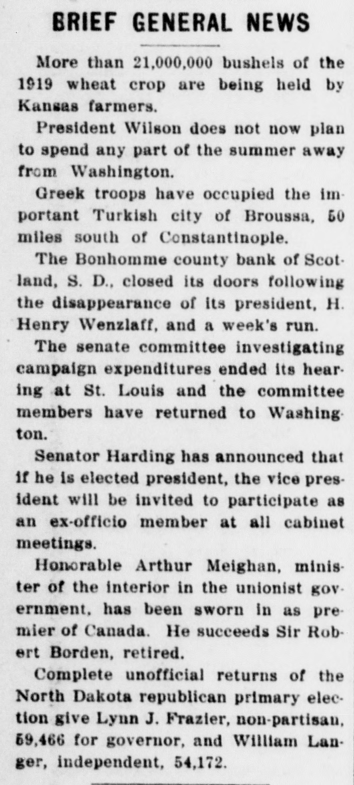 BRIEF GENERAL NEWS More than 21,000,000 bushels of the 1919 wheat crop are being held by Kansas farmers. President Wilson does not now plan to spend any part of the summer away from Washington. Greek troops have occupied the important Turkish city of Broussa, 50 miles south of Constantinople. The Bonhomme county bank of Scotland, S. D., closed its doors following the disappearance of its president, H. Henry Wenzlaff, and a week's run. The senate committee investigating campaign expenditures ended its hearing at St. Louis and the committee members have returned to Washing ton. Senator Harding has announced that if he is elected president, the vice president will be invited to participate as an ex-officio member at all cabinet meetings. Honorable Arthur Meighan, minister of the interior in the unionist government, has been sworn in as premier of Canada. He succeeds Sir Robert Borden, retired. Complete unofficial returns of the North Dakota republican primary election give Lynn J. Frazier, non-partisan, 59,466 for governor, and William Langer, independent, 54,172.
