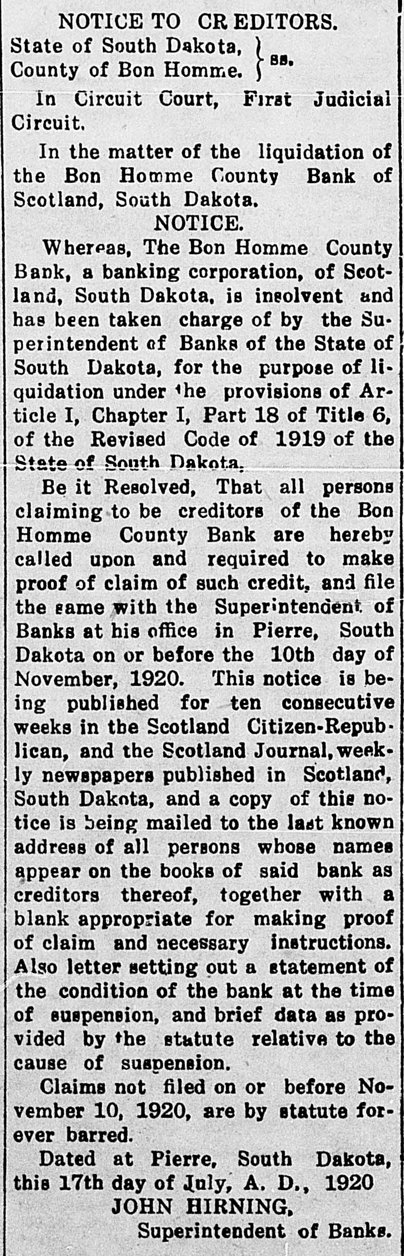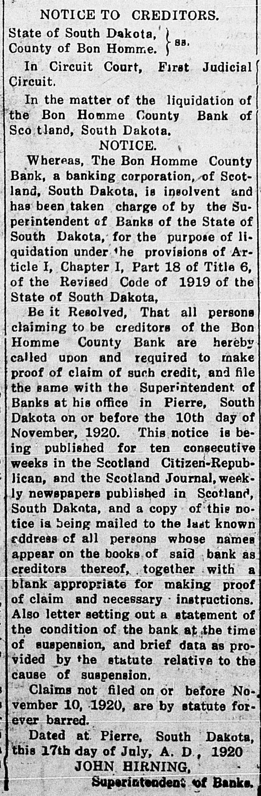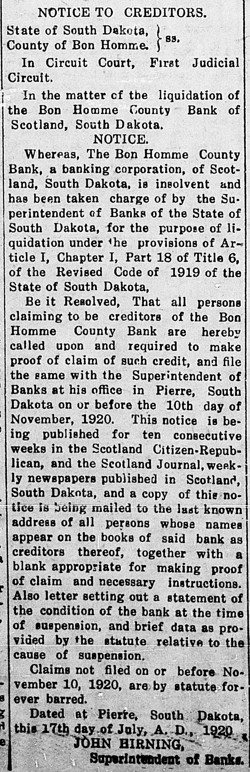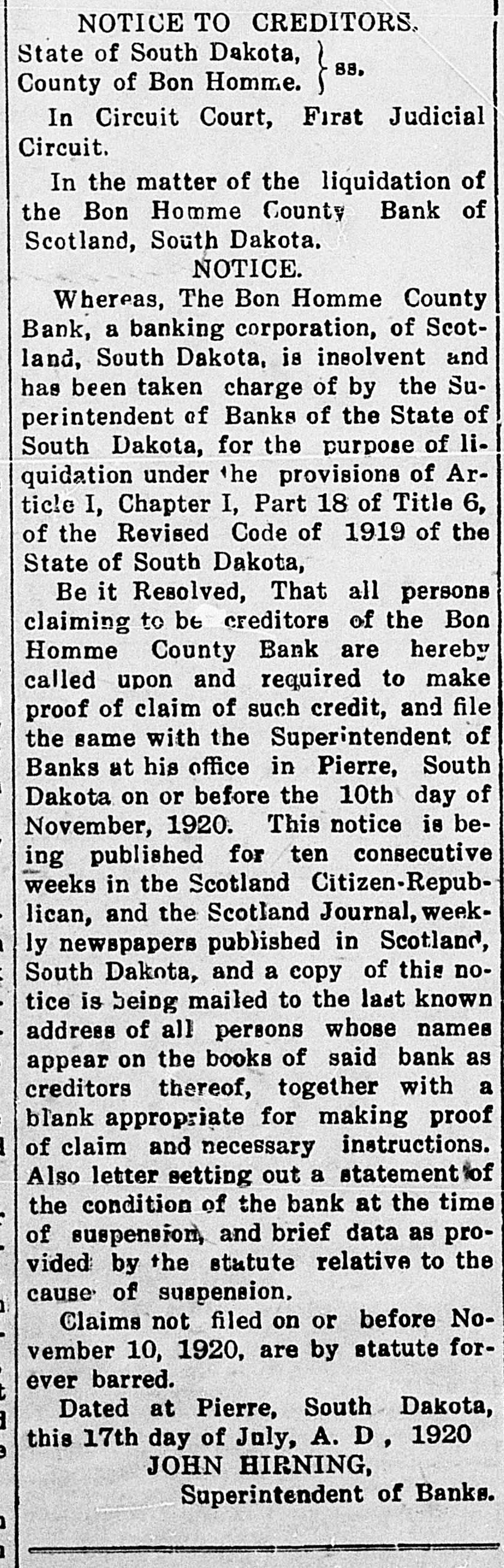 NOTICE TO CREDITORS. State of South Dakota, 88, County of Bon Homme. ~~~~~~~~~~~~~~~~~~~~~~~~~ In Circuit Court, First Judicial Circuit. In the matter of the liquidation of the Bon Homme County Bank of Scotland, South Dakota. NOTICE. Whereas, The Bon Homme County Bank, a banking corporation, of Scotland, South Dakota, is insolvent and has been taken charge of by the Superintendent of Banks of the State of South Dakota, for the purpose of liquidation under the provisions of Article I, Chapter I, Part 18 of Title 6, of the Revised Code of 1919 of the State of South Dakota, Be it Resolved, That all persons claiming to be creditors of the Bon Homme County Bank are hereby called upon and required to make proof of claim of such credit, and file the same with the Superintendent of Banks at his office in Pierre, South Dakota on or before the 10th day of November, 1920. This notice is being published for ten consecutive weeks in the Scotland Citizen-Republican, and the Scotland Journal, weekly newspapers published in Scotland, South Dakota, and a copy of this notice is being mailed to the last known address of all persons whose names appear on the books of said bank as creditors thereof, together with a blank appropriate for making proof of claim and necessary instructions. Also letter setting out a statement of the condition of the bank at the time of suspension, and brief data as provided by the statute relative to the cause of suspension, Claims not filed on or before November 10, 1920, are by statute forever barred. Dated at Pierre, South Dakota, this 17th day of July, A. D, 1920 JOHN HIRNING, Superintendent of Banks.