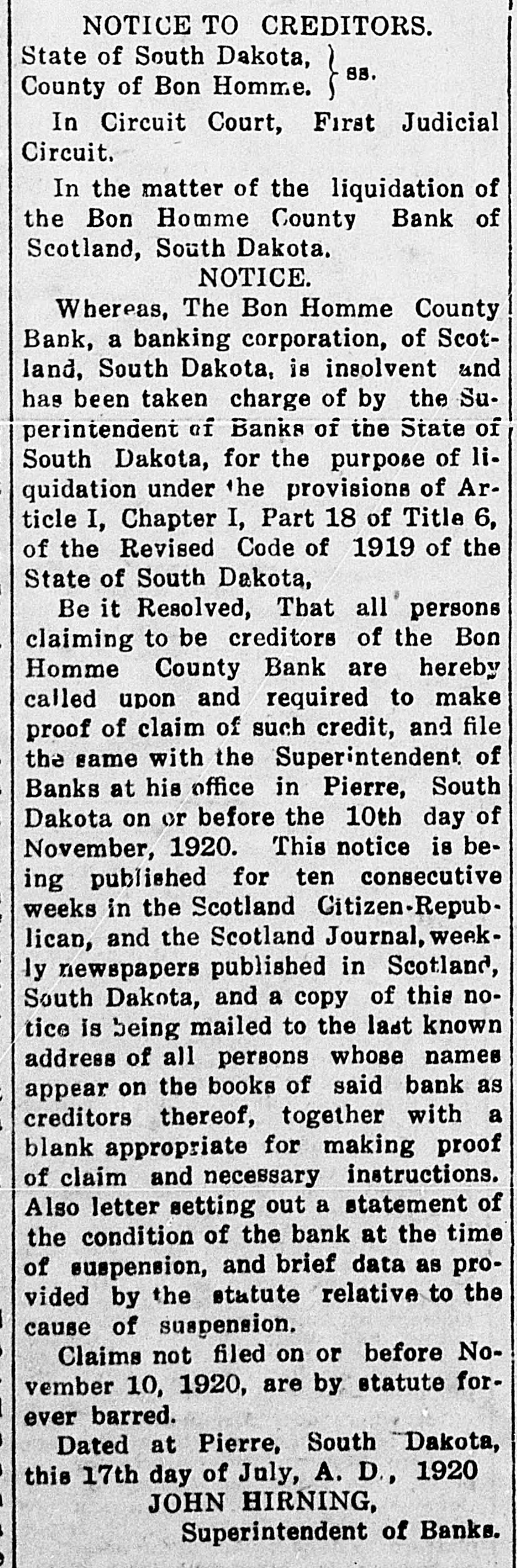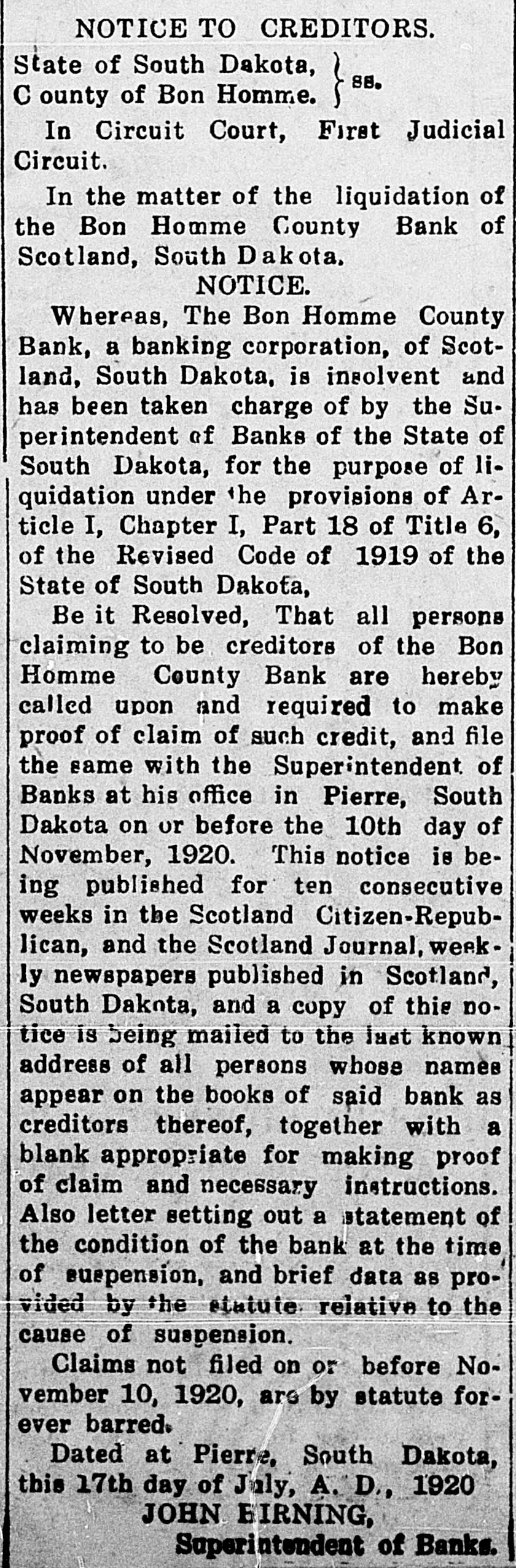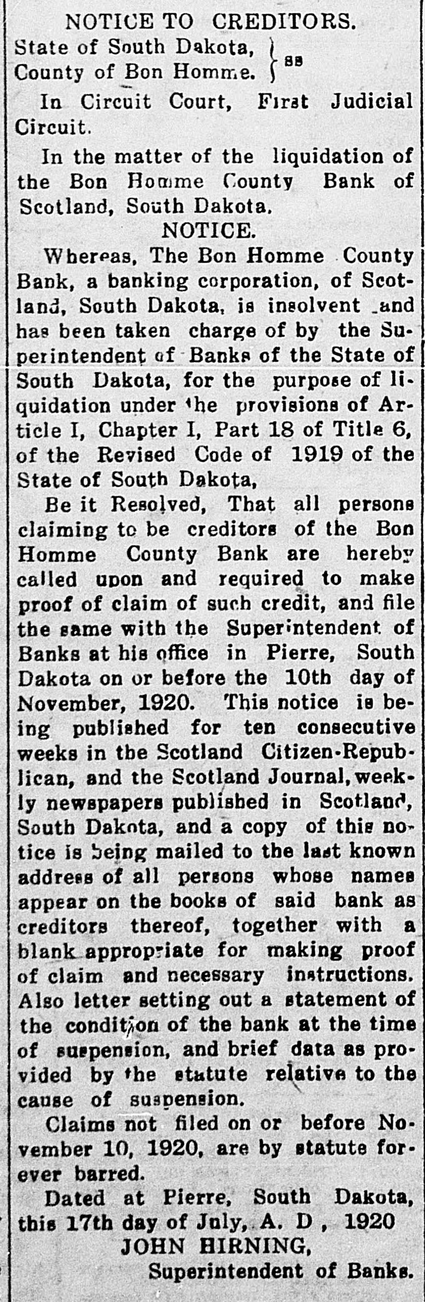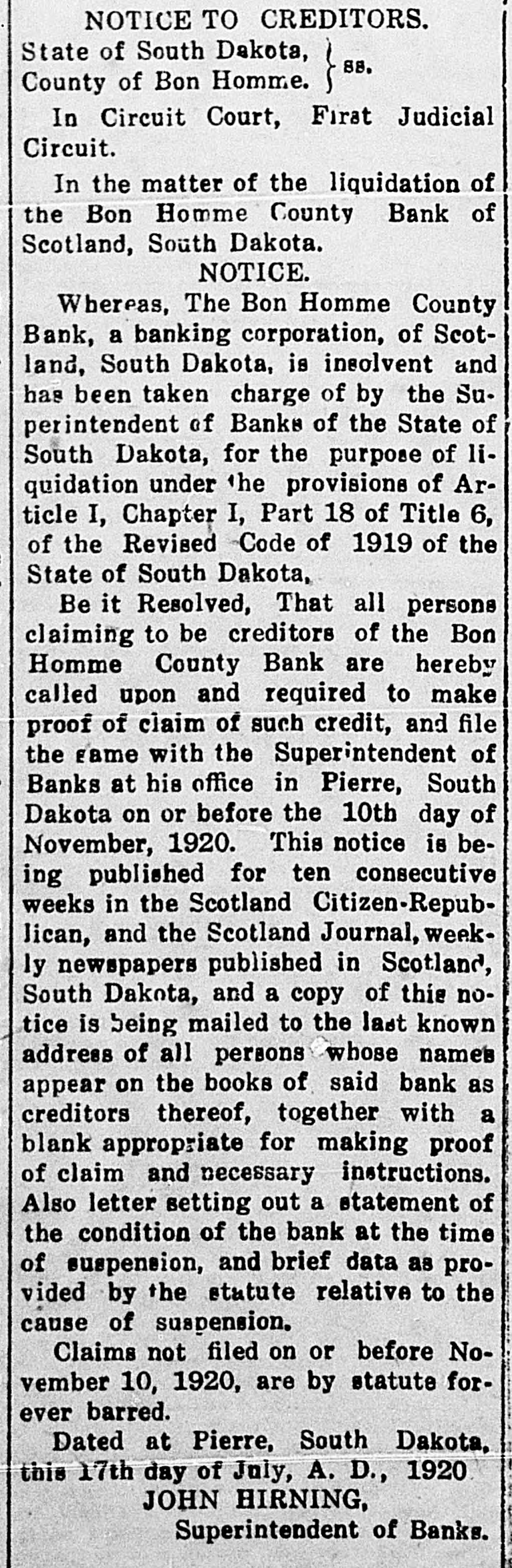NOTICE TO CREDITORS. State of South Dakota, 88, County of Bon Homme. ~~~~~~~~~~~~~~~~~~~~~~~~~ In Circuit Court, First Judicial Circuit. In the matter of the liquidation of the Bon Homme County Bank of Scotland, South Dakota. NOTICE. Whereas, The Bon Homme County Bank, a banking corporation, of Scotland, South Dakota, is insolvent and has been taken charge of by the Superintendent of Banks of the State of South Dakota, for the purpose of liquidation under the provisions of Article I, Chapter I, Part 18 of Title 6, of the Revised Code of 1919 of the State of South Dakota, Be it Resolved, That all persons claiming to be creditors of the Bon Homme County Bank are hereby called upon and required to make proof of claim of such credit, and file the same with the Superintendent of Banks at his office in Pierre, South Dakota on or before the 10th day of November, 1920. This notice is being published for ten consecutive weeks in the Scotland Citizen-Republican, and the Scotland Journal, weekly newspapers published in Scotland, South Dakota, and a copy of this notice is being mailed to the last known address of all persons whose names appear on the books of said bank as creditors thereof, together with a blank appropriate for making proof of claim and necessary instructions. Also letter setting out a statement of the condition of the bank at the time of suspension, and brief data as provided by the statute relative to the cause of suspension, Claims not filed on or before November 10, 1920, are by statute forever barred. Dated at Pierre, South Dakota, this 17th day of July, A. D, 1920 JOHN HIRNING, Superintendent of Banks.