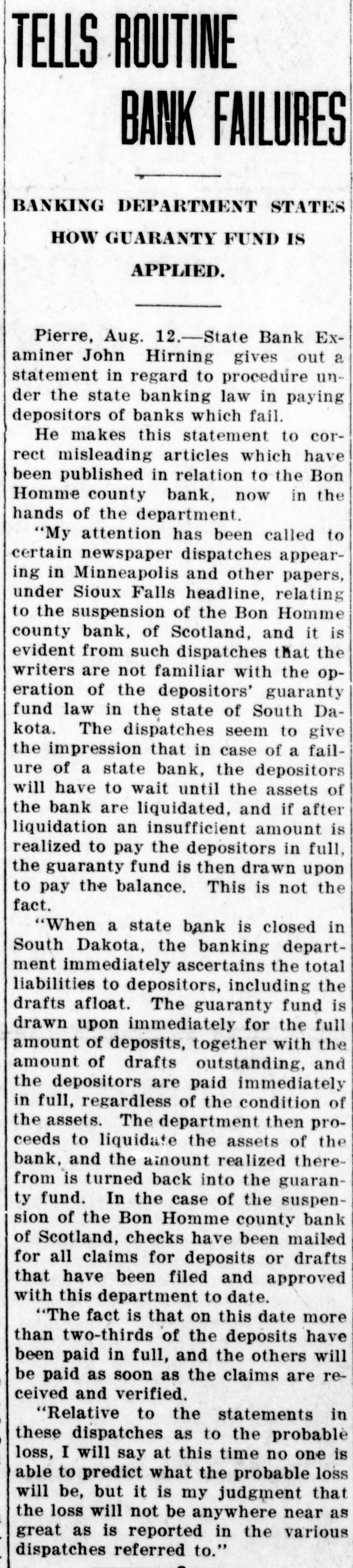 TELLS ROUTINE BANK FAILURES BANKING DEPARTMENT STATES HOW GUARANTY FUND IS APPLIED. Pierre, Aug. 12.-State Bank Examiner John Hirning gives out a statement in regard to procedure under the state banking law in paying depositors of banks which fail. He makes this statement to correct misleading articles which have been published in relation to the Bon Homme county bank, now in the hands of the department. "My attention has been called to certain newspaper dispatches appearing in Minneapolis and other papers, under Sioux Falls headline, relating to the suspension of the Bon Homme county bank, of Scotland, and it is evident from such dispatches that the writers are not familiar with the operation of the depositors' guaranty fund law in the state of South Dakota. The dispatches seem to give the impression that in case of a failure of a state bank, the depositors will have to wait until the assets of the bank are liquidated, and if after liquidation an insufficient amount is realized to pay the depositors in full, the guaranty fund is then drawn upon to pay the balance. This is not the fact. "When a state bank is closed in South Dakota, the banking department immediately ascertains the total liabilities to depositors, including the drafts afloat. The guaranty fund is drawn upon immediately for the full amount of deposits, together with the amount of drafts outstanding, and the depositors are paid immediately in full, regardless of the condition of the assets. The department then proceeds to liquidate the assets of the bank, and the amount realized therefrom is turned back into the guaranty fund. In the case of the suspension of the Bon Homme county bank of Scotland, checks have been mailed for all claims for deposits or drafts that have been filed and approved with this department to date. "The fact is that on this date more than two-thirds of the deposits have been paid in full, and the others will be paid as soon as the claims are received and verified. "Relative to the statements in these dispatches as to the probable loss, I will say at this time no one is able to predict what the probable loss will be, but it is my judgment that the loss will not be anywhere near as great as is reported in the various dispatches referred to."