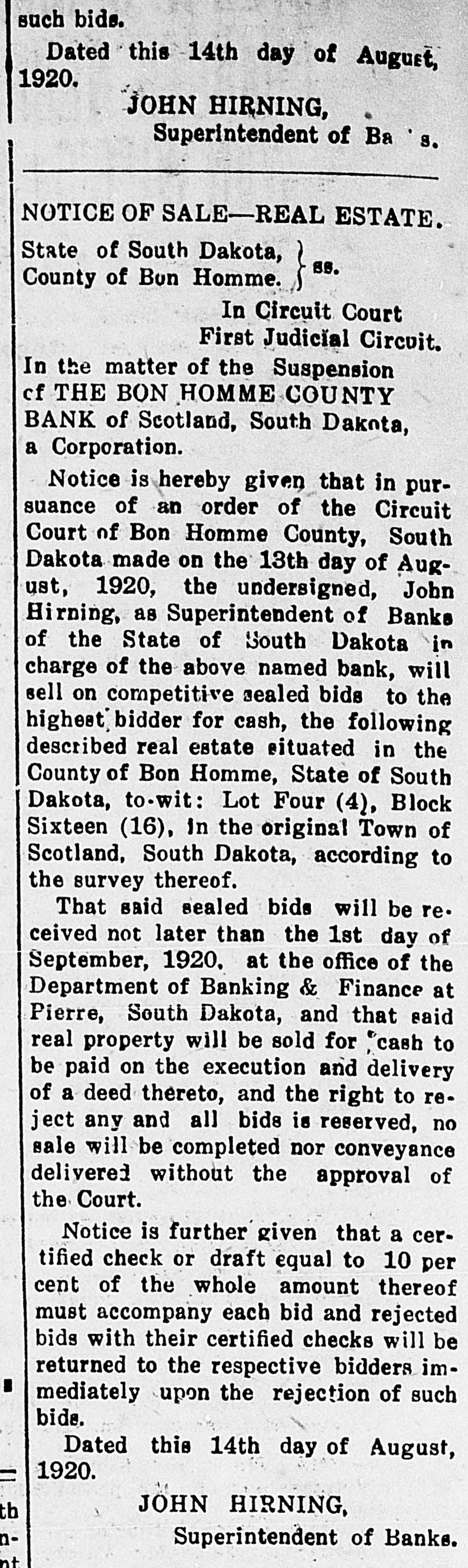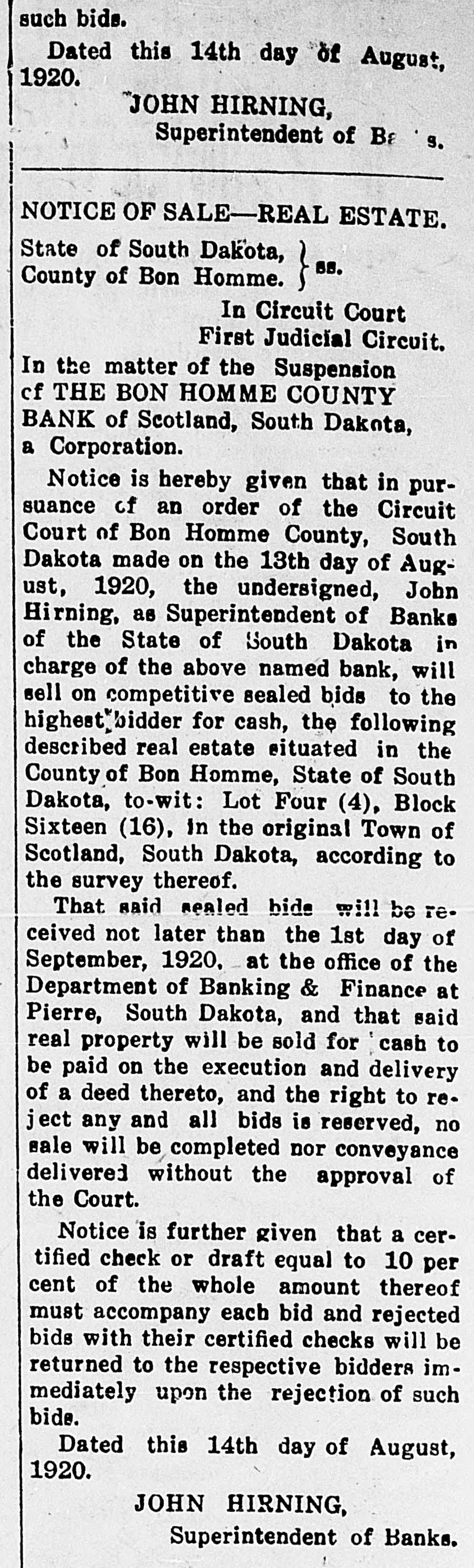 such bids. Dated this 14th day of August, 1920. JOHN HIRNING, Superintendent of Ba S. NOTICE OF SALE-REAL ESTATE. State of South Dakota, SS. County of Bon Homme. ~ In Circuit Court First Judicial Circuit. In the matter of the Suspension cf THE BON HOMME COUNTY BANK of Scotland, South Dakota, a Corporation. Notice is hereby given that in pursuance of an order of the Circuit Court of Bon Homme County, South Dakota made on the 13th day of August, 1920, the undersigned, John Hirning, as Superintendent of Banks of the State of South Dakota in charge of the above named bank, will sell on competitive sealed bids to the highest bidder for cash, the following described real estate situated in the County of Bon Homme, State of South Dakota, to-wit: Lot Four (4), Block Sixteen (16), in the original Town of Scotland, South Dakota, according to the survey thereof. That said sealed bide will be received not later than the 1st day of September, 1920, at the office of the Department of Banking & Finance at Pierre, South Dakota, and that said real property will be sold for cash to be paid on the execution and delivery of a deed thereto, and the right to reject any and all bids is reserved, no sale will be completed nor conveyance delivered without the approval of the Court. Notice is further given that a certified check or draft equal to 10 per cent of the whole amount thereof must accompany each bid and rejected bids with their certified checks will be returned to the respective bidders immediately upon the rejection of such bide. Dated this 14th day of August, 1920. JOHN HIRNING, Superintendent of Banks.