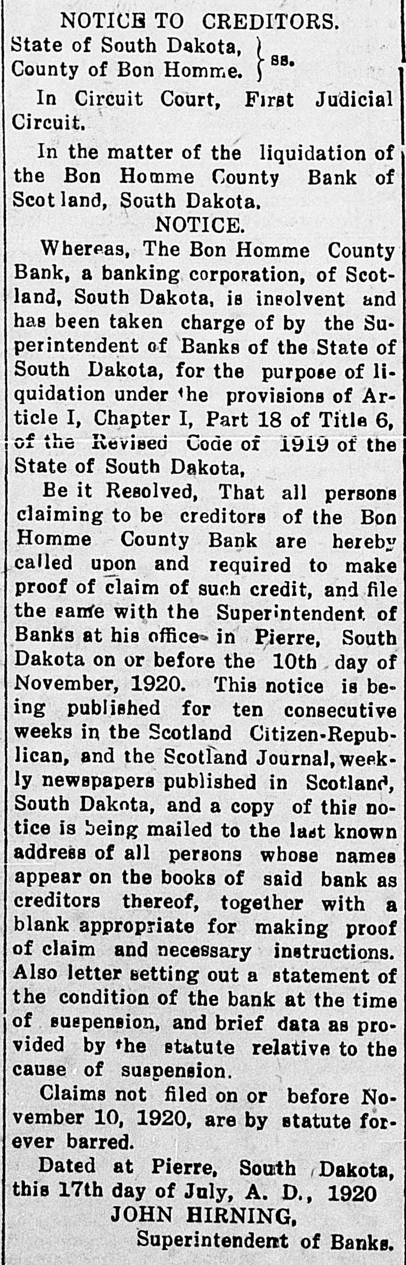NOTICE TO CREDITORS. State of South Dakota, SS. County of Bon Homme. {}} In Circuit Court, First Judicial Circuit. In the matter of the liquidation of the Bon Homme County Bank of Scotland, South Dakota. NOTICE. Whereas, The Bon Homme County Bank, a banking corporation, of Scotland, South Dakota, is insolvent and has been taken charge of by the Superintendent of Banks of the State of South Dakota, for the purpose of liquidation under the provisions of Article I, Chapter I, Part 18 of Title 6, of the Revised Code of 1919 of the State of South Dakota, Be it Resolved, That all persons claiming to be creditors of the Bon Homme County Bank are hereby called upon and required to make proof of claim of such credit, and file the same with the Superintendent of Banks at his office in Pierre, South Dakota on or before the 10th day of November, 1920. This notice is being published for ten consecutive weeks in the Scotland Citizen-Republican, and the Scotland Journal, weekly newspapers published in Scotland, South Dakota, and a copy of this notice is being mailed to the last known address of all persons whose names appear on the books of said bank as creditors thereof, together with a blank appropriate for making proof of claim and necessary instructions. Also letter setting out a statement of the condition of the bank at the time of suspension, and brief data as provided by the statute relative to the cause of suspension. Claims not filed on or before November 10, 1920, are by statute forever barred. Dated at Pierre, South Dakota, this 17th day of July, A. D., 1920 JOHN HIRNING, Superintendent of Banks.