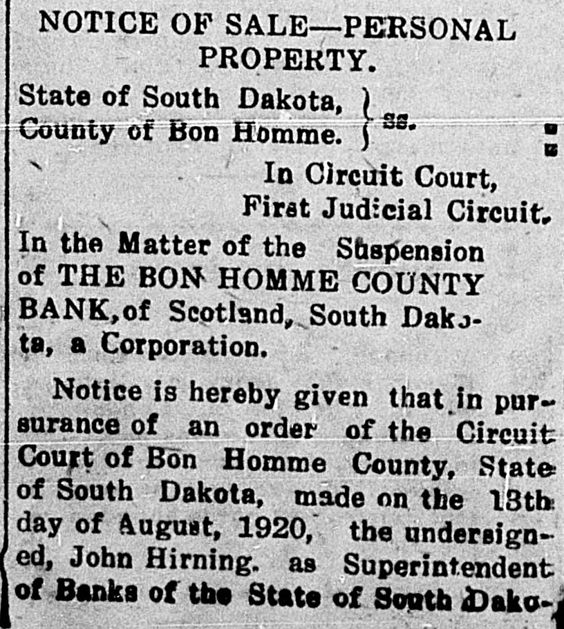 NOTICE OF SALE-PERSONAL PROPERTY. State of South Dakota, Ss. County of Bon Homme. In Circuit Court, First Judicial Circuit. In the Matter of the Suspension of THE BON HOMME COUNTY BANK, of Scotland, South Dakota, a Corporation. Notice is hereby given that in pursurance of an order of the Circuit Court of Bon Homme County, State of South Dakota, made on the 13th day of August, 1920, the undersigned, John Hirning. as Superintendent of Banks of the State of South Dako-