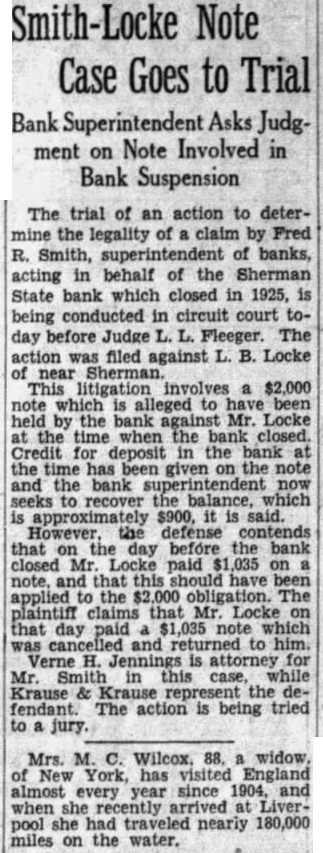 Smith-Locke Note Case Goes to Trial Bank Superintendent Asks Judgment on Note Involved in Bank Suspension The trial of an action to determine the legality of claim by Fred R. Smith, superintendent of banks, acting in behalf of the Sherman State bank which closed in 1925, is being in circuit court today before Judge L. L. Fleeger. The action was filed against L. B. Locke of This litigation involves a $2,000 note which is alleged to have been held by the bank against Mr. Locke at the time when the bank closed. Credit for deposit in the bank at the time has been given on the note and the bank superintendent now seeks to recover the balance, which is approximately $900, said. However, the defense contends that on the day before the bank closed Mr. Locke paid $1,035 on note, and that this have been applied the $2,000 obligation. The plaintiff claims that Mr Locke on that day paid $1,035 note which was and returned to him. Verne H. is attorney for Mr. Smith in this case, while Krause & Krause represent the defendant. The action is being tried to jury. Mrs. M. C. Wilcox. 88. widow, of New York, has visited England almost every year since 1904, and when she recently arrived at Liverpool she had traveled nearly 180,000 miles on the water.