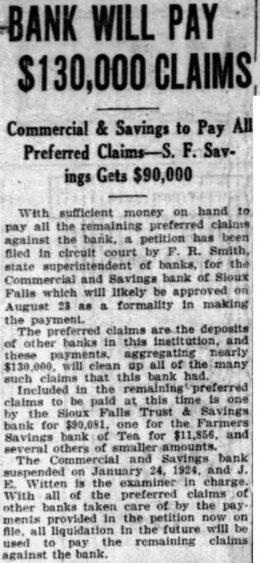 BANK WILL PAY $130,000 CLAIMS Commercial & Savings to Pay All Preferred Claims-S. F. Savings Gets $90,000 sufficient money on hand to pay all the remaining preferred the bank, petition has been against filed circuit court by R. Smith, in of banks, for the state Commercial and Savings bank of Sloux which will likely be approved on Falls 23 formality in making August the payment. The preferred claims are the deposits banks in this institution, and of other these payments, aggregating nearly will clean up all of the many such claims that this bank had. Included in the remaining preferred be paid at this time is one claims to by the Sioux Falls Trust & Savings bank for $90,081, one for the Farmers Savings bank of Tea for $11,856, and several others of smaller amounts. Commercial and Savings bank The suspended on January 24, 1924, and J. E. Witten is the examiner in charge. With all of the preferred claims of other banks taken care of by the pay ments provided in the petition now on file. all liquidation in the future will be used to the remaining claims pay against the bank.