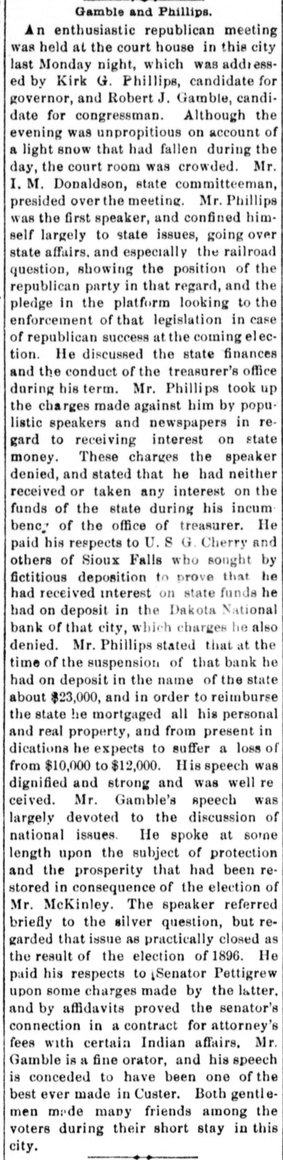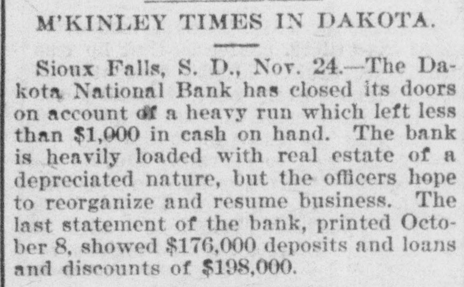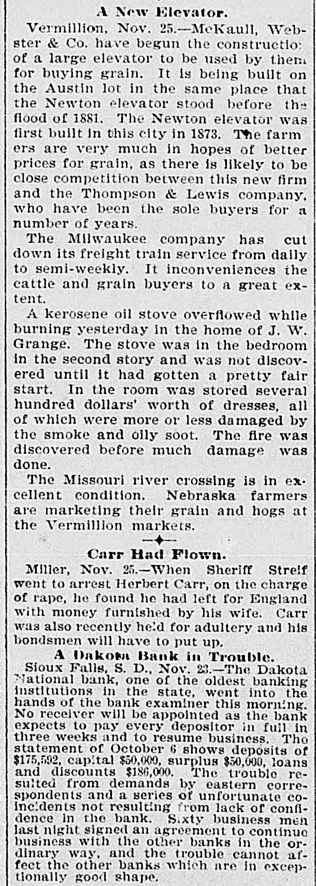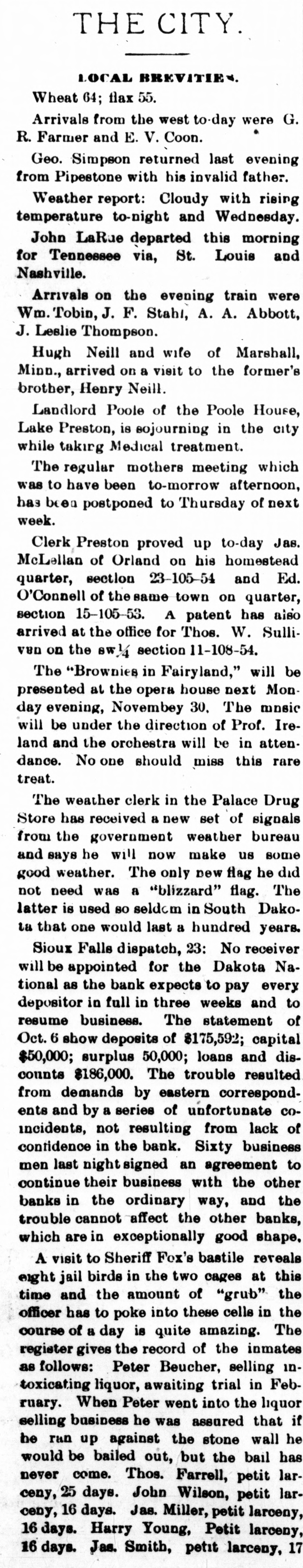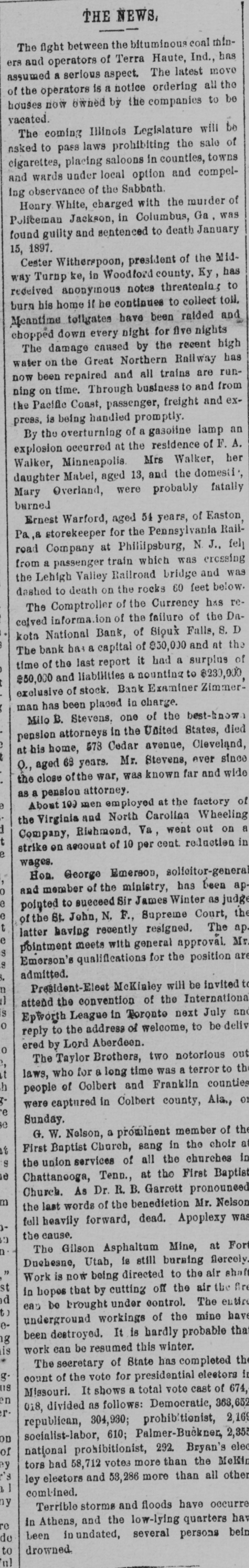 THE NEWS. Compiled From Late Dispatches. DOMESTIC. The visible supply of grain in the United States on the 23d was: Wheat, 59,971,000 bushels; corn, 18,150,000 bushels; oats, 12,208,000 bushels; rye, 2,657, 000 bushels; barley, 6,146,000 bushels. Mrs. Casper Laboy, of Nesquehoning, Pa., was stabbed to death and her husband fatally slashed by robbers. At Delmont, Pa., John Tarr, aged 25 years. shot and killed his wife and then committed suicide. They were not living together. Patrick Meagher, a justice of the peace at Gilberts, III., and his mother were suffocated by coal gas at their home. A temporary prison at Mena, Ark., was burned and Tom Casey and H. Hopkins, confined for disorderly conduct, perished in the flames. Miss Clara Barton, president of the Red Cross society, in her report of the work of the Armenian relief expedition in Asia Minor says that 50,000 Armenians will starve unless helped by May 1. The report of Gen. J. C. Breckinridge, inspector general of the army of the United States, speaks highly of the army as being in as good condition in respect to instruction, discipline, equipE ent and supplies as ever before in its history. For the first time in nearly 20 years the national republican party closed the campaign with all its debts paid and a surplus of $100.000 in its treasury. At Weir, Mass., Frederick Luther. an electric fireman, shot his boarding mistress, Mrs. Abby F. Barber. and then killed himself. No cause is known. Mrs. F. A. Walker and her daughter Mabel and Mary Overland. a domestic, were fatall, burned in Minneapolis by the overturning of a gasoline lamp. Mably & Co., one of the leading retail clothing firms in Detroit, failed for $400,000. The Dakota national bank of Sioux Falls, S. D., closed its doors with liabilities of $230,000. The board of publication of war records has submitted its annual report to the secretary of war. This work has been in progress for 21 years and is about completed. It has cost thus far $2,334,328. Seven sophomores of Princeton (N. J.) university have been suspended for the part they played in the hazing of 11 freshmen. Twenty-six banks in eastern and southeastern Nebraska have been burglarized with losses amounting to over $30,000 within the past two months. It is officially announced that Troop A, Ohio national guard, of Cleveland, will act as the military escort of President-elect McKinley at the inauguration ceremonies in Washington. Alf and Bob Holly brothers) were killed at a negro cake walk at Selma, Ala., by the Hayes brothers, Henry and Jack. A disastrous prairie fire swept over the Seminole country near Rochelle, o. T., and 16 persons were burned to death. The Davies county savings association at Gallatin, Mo., an old banking institution, closed its doors. Joseph Green and Mike Inhofer, two West Newton (Minn.) farmers, were killed instantly by the explosion of a thrashing engine. Rev. James Miller, pastor of Grace Methodist church at Bloomington, III., was murdered in Decatur, where he had gone to visit his son. Robbery was the motive. The differences between the window glass workers and the manufacturers, which has kept the factories of the country idle since May 30, were settled at a conference in Pittsburgh and 15,000 men will be at work again December 15. Baltimore Methodists erected a bronze tablet to mark the site of the Lovely Lane meeting-house, where the Methodist Episcopal church was organized in 1784. Mrs. Swearnier, the wife of a rancher living in Lewis county, Wash., cut the throats of her three little girls, aged respectively five years, three years and nine months, and then used the knife on herself. She was insane. The body of the late George W. G. Ferris, inventor of the Ferris wheel, was cremated at Pittsburgh in accordance with a request made by him before his death. Fire destroyed five of the best business houses in Atlama, Tex., the loss being $100,000.