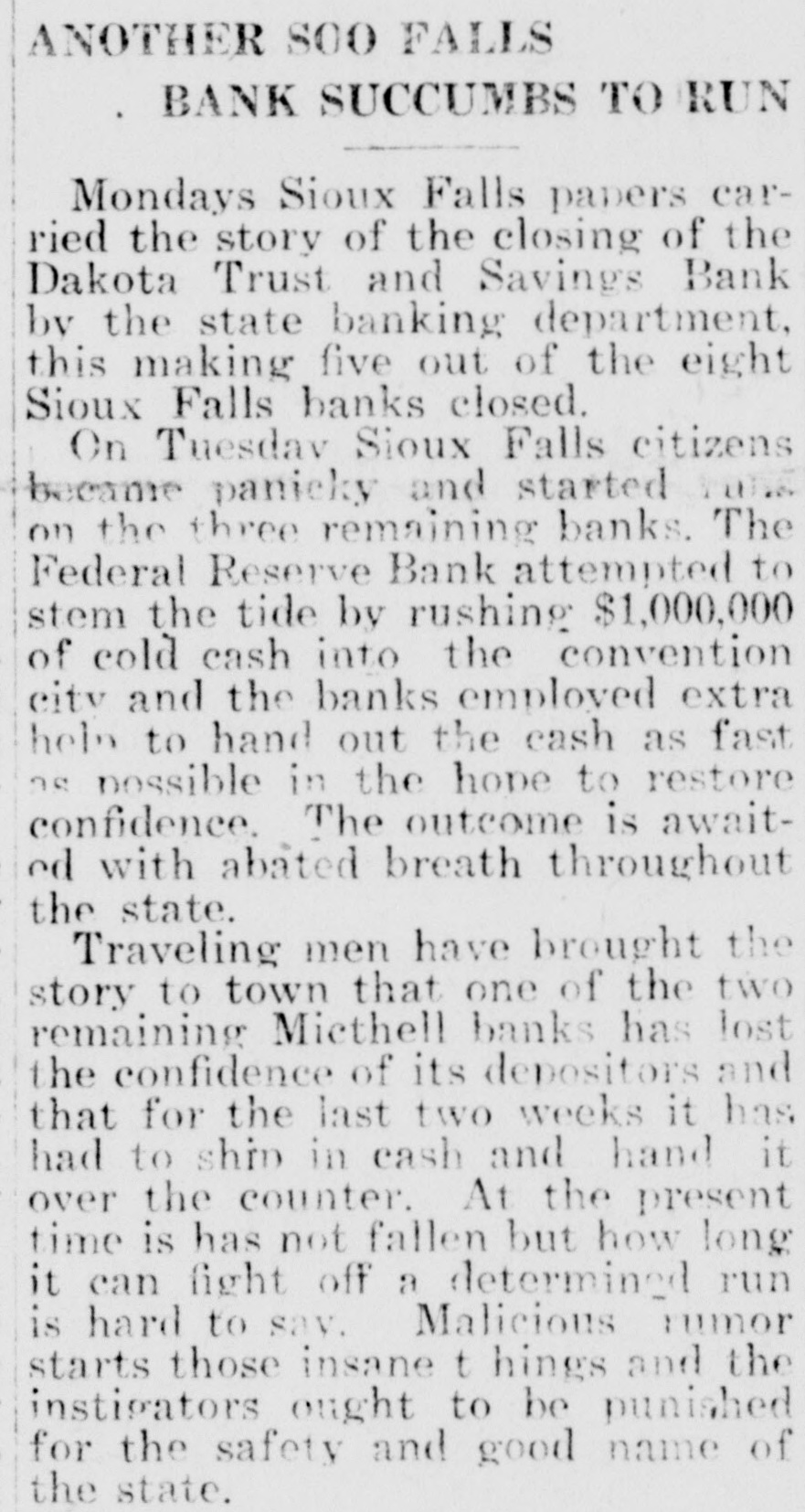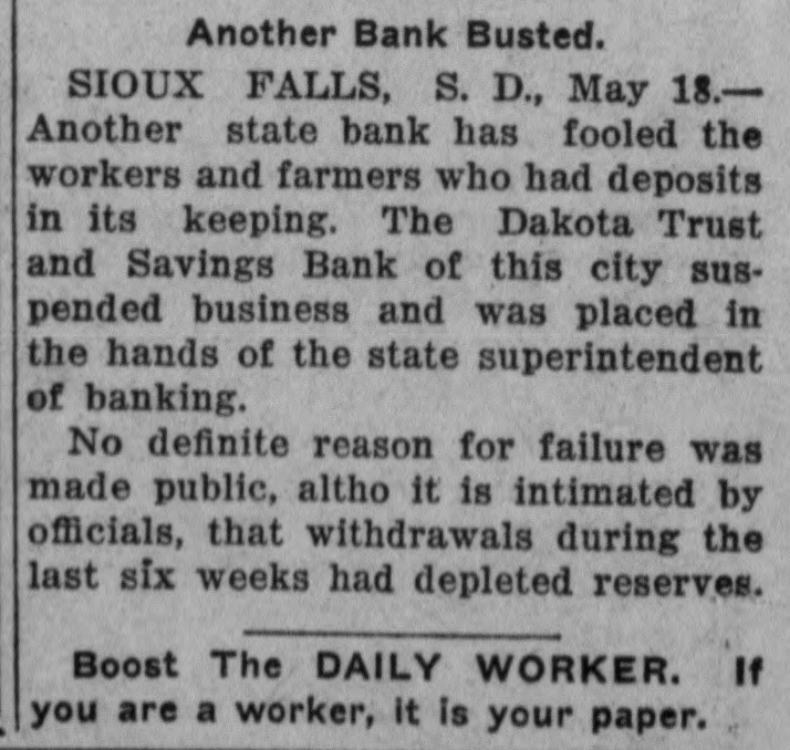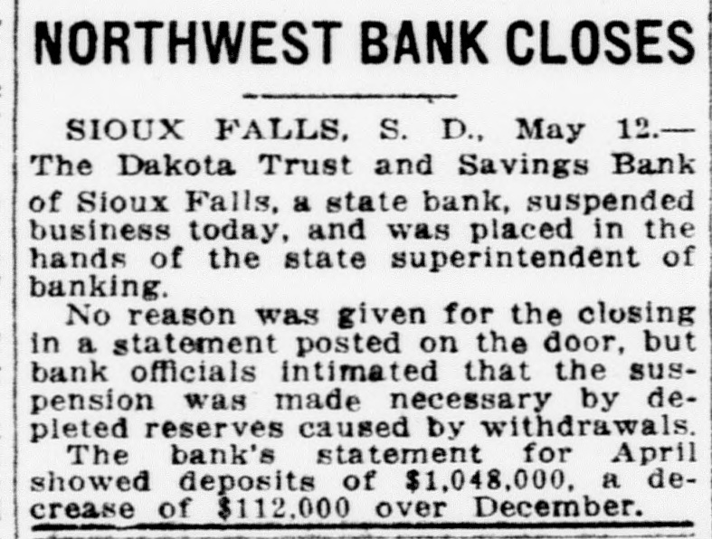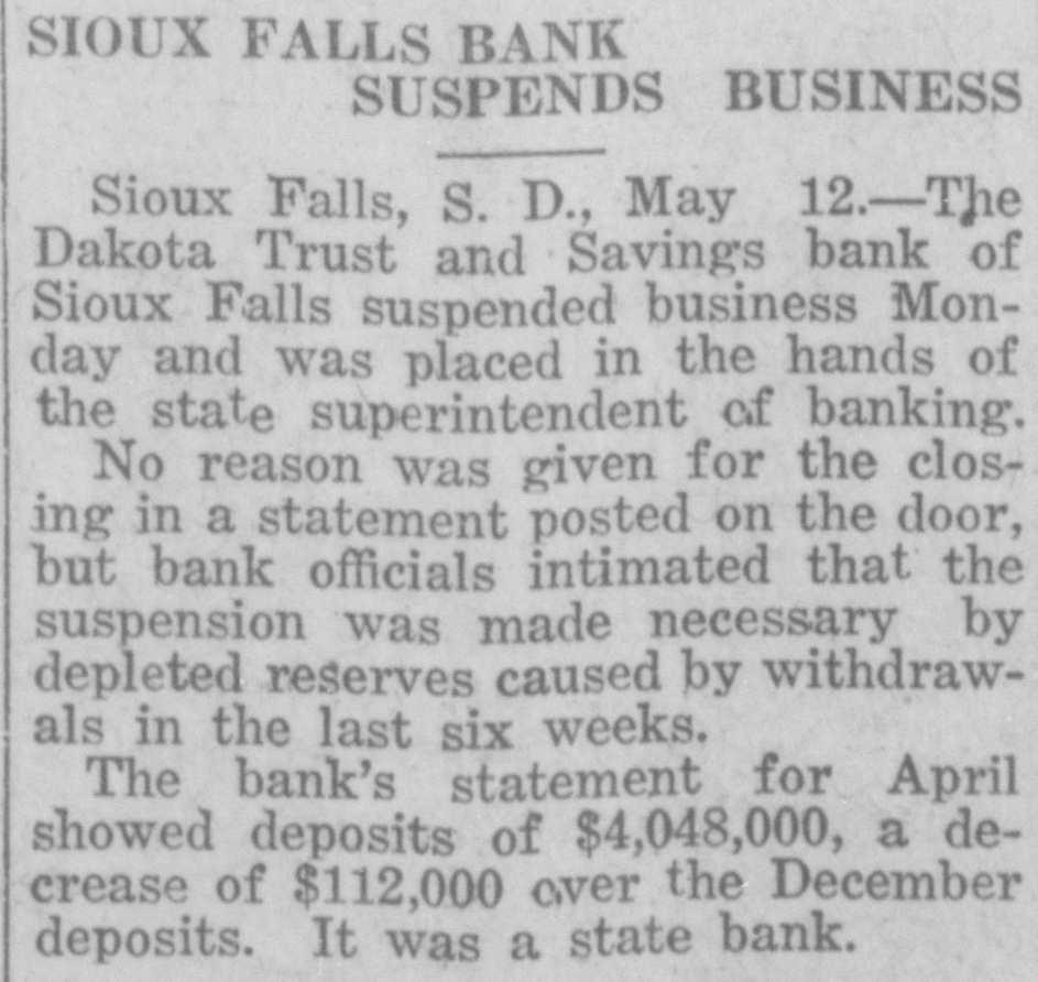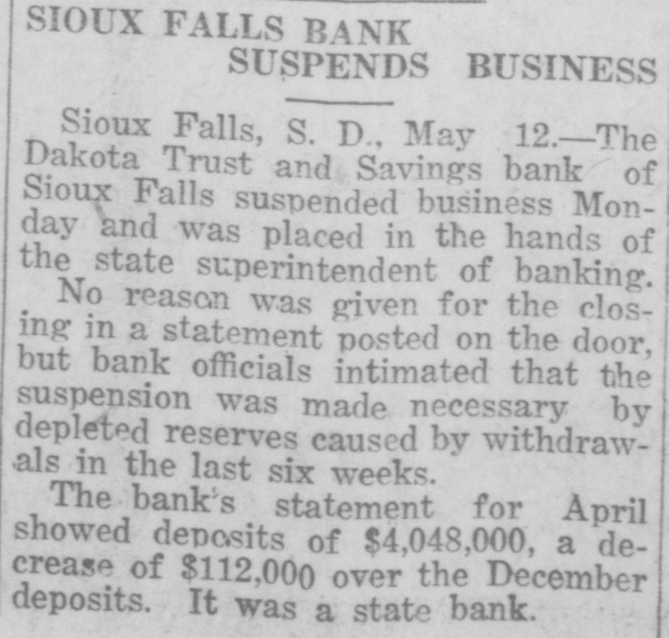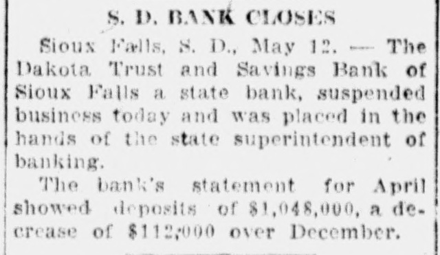 S. D. BANK CLOSES Sioux Falls, 8. D., May 12. - The Dakota Trust and Savings Bank of Sioux Falls a state bank, suspended business today and was placed in the hands of the state superintendent of banking. The bank's statement for April showed deposits of $1,048,000, a decrease of $112,000 over December.
