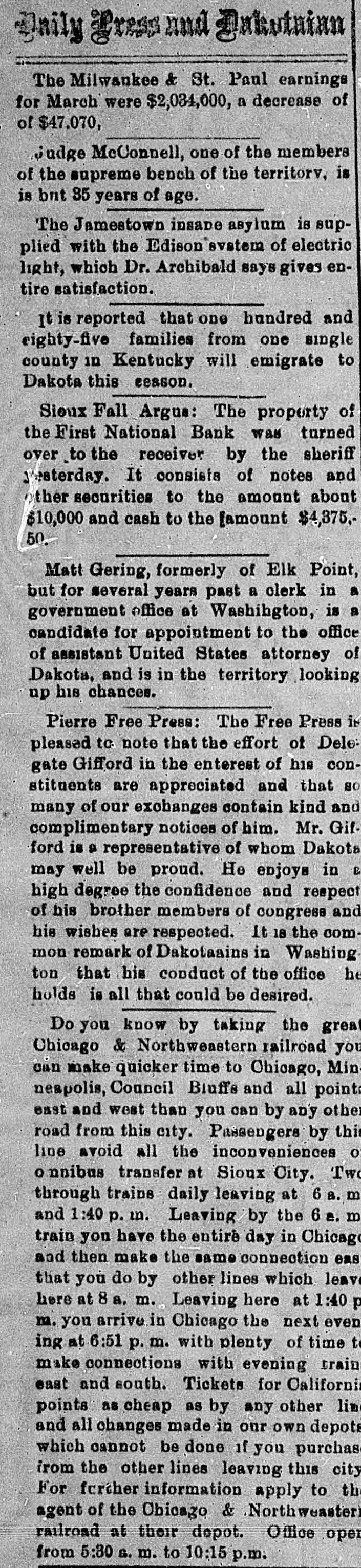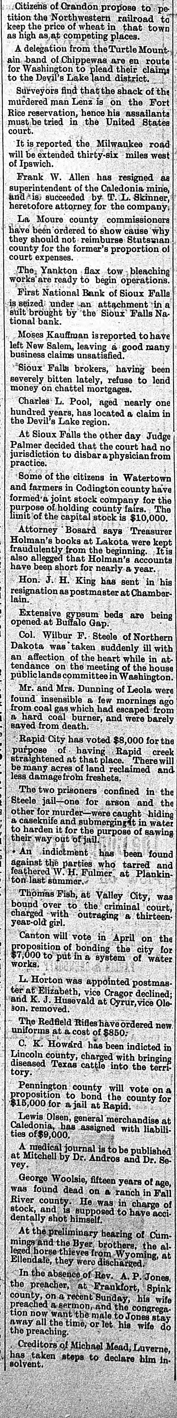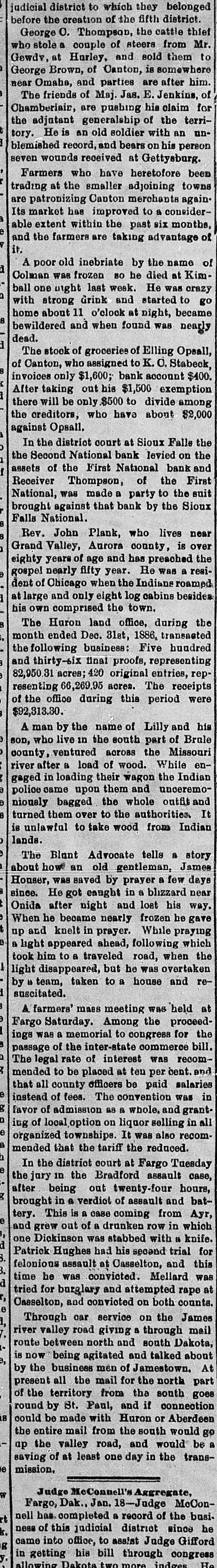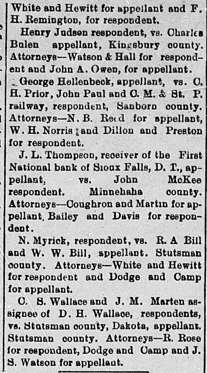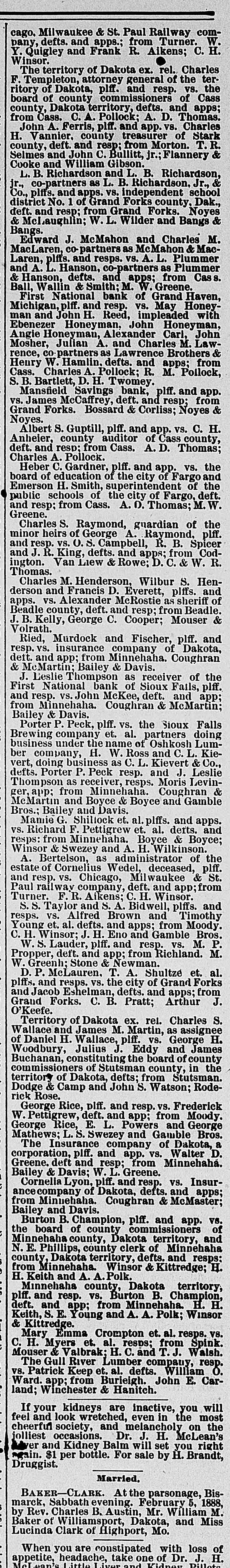 cago. Milwaukee & St Paul Railway company. defts. and apps. from Turner. W Y. Quigley and Frank R. Aikens: C.H. Winsor The territory of Dakota ex. rel. Charles F Templeton, attorney general of the ter ritory of Dakota. plff. and resp. vs. the board of county commissioners of Cass county, Dakota territory, defts. and apps: from Cass C. Pollock A. D. Thomas John A. Ferris, plff and app vs. Charles H. Vannier county treasurer of Stark county. deft and resp: from Morton. T.R. Selmes and John C. Bullitt, jr.: Flannery & Cooke and William Gibson L. B. Richardson and L B. Richardson, jr., co-partners as L. B. Richardson, Jr., & Co. plffs. and apps. vs. independent school district No. 1 of Grand Forks county Dak. deft. and resp; from Grand Forks. Noyes & McLaughlin; W. L. Wilder and Bangs & Bangs. Edward J. McMahon and Charles M MacLaren, co partners as McMahon & Mac Laren, plffs and resps. vs. A. L. Plummer and A. Hanson, co-partners as Plummer & Hanson, defts. and apps: from Cas s Ball, Wallin & Smith: M. W Greene. First National bank of Grand Haven, Michigan, plff. and resp. vs. May Honey man and John H. Reed. impleaded with Ebenezer Honeyman, John Honeyman Angie Honeyman. Alexander Carl. John Mosher, Julian A and Charles M. Lawrence, co partners as Lawrence Brothers Henry W Hamlin defts and apps: from Cass Charles A Pollock: R. M. Pollock, S.B. Bartlett, D.H. Twomey. Mansfield Savings bank. plff. and app vs. James McCaffrey, deft and resp: from Grand Forks. Bossard & Corliss: Noyes & Noves. Albert S. Guptill, plff. and app. vs. C. H. Anheier, county auditor of Cass county, deft. and resp: from Cass. A.D. Thomas: Charles A. Pollock. Heber C. Gardner. plff. and app. vs. the board of education of the city of Fargo and Emerson H. Smith superintendent of the public schools of the city of Fargo. deft. and resp: from Cass. A. Thomas; M.W Greene. Charles S. Raymond, guardian of the minor heirs of George A Ravmond. plff and resp. vs. U.S. Campbell, R. B. Spicer and J.R. King, defts and apps; from Cod ington. Van Liew & Rowe: D.C. & W. R. Thomas. Charles M. Henderson. Wilbur S. Henderson and Francis D. Everett, plffs. and apps. vs. Alexander McRostie as sheriff of Beadle county, deft and resp from Beadle J. B. Kelly, George C. Cooper; Mouser & Volrath. Ried, Murdock and Fischer, plff. and resp vs. insurance company of Dakota. dett. and from Minnehaha, Coughran & MeMartin Bailey & Davis. Leslie Thompson as receiver of the First National bank of Sioux Fails, plff. and resp. vs. John McKee, deft. and app from Minnehaha. Coughran & McMartin: Bailey & Davis. Porter P. Peck, plff. vs. the Sioux Falls Brewing company et. al. partners doing business under the name of Oshkosh Lumber company, H. W Ross and C. L. Kievert, doing business as C.L. Kievert & Co. defts. Porter P Peck resp. and J. Leslie Thompson as receiver, resp Moris Levinger,app: from Minnehaha Coughran & McMartin and Boyce & Boyce and Gamble Bros.: Bailey and Davis. Mamie G Shillock et. al. plffs. and apps vs Richard F Pettigrew et. al. derts. and resps from Minnehaha. Boyce & Boyce; Winsor & Swezey and A. H. Wilkinson. A. Bertelson. as administrator of the estate of Cornelius Wedel. deceased, plff. and resp.vs. Chicago, Milwaukee & St. Paul railway company, deft. and app: from Turner. Aikens: H. Winsor Taylor and A Bidwell plffs. and resps. vs. Alfred Brown and Timothy Young et. al. defts and apps: from Moody C. Winsor: J. H. Eno and Gamble Bros W. S. Lauder, plff. and resp. vs. M. P. Propper, deft and app: from Richland. M. W.Greenh: Stone & Newman. D.P. McLauren, T. A. Shultze et. al. plffs. and resps. vs. the city of Grand Forks and Jacob Eshelman, defts. and apps: from Grand Forks. C. B. Pratt: Arthur J. O'Keefe Territory of Dakota ex. rel. Charles S. Wallace and James M. Martin, as assignee of Daniel H. Wallace, plff. vs. George H. Woodbury, Julius J. Eddy and James Buchanan, constituting the board of county commissioners of Stutsman county, in the territor of Dakota, defts: from Stutsman. Dodge & Camp and John S. Watson; Roderick Rose. George Rice, plff. and resp. vs. Frederick W. Pettigrew, deft. and app; from Moody George Rice, E. L. Powers and George Mathews: .S. Swezey and Gamble Bros. The Insurance company of Dakota, corporation plff. and app. vs. Walter D. Greene deft and resp: from Minnehaha. Bailey & Davis: W. Greene. Cornella Lyon, plff and resp. vs. Insurncecompany of Dakota, defts. and apps: from Minnehaha. Coughran & McMaster; Bailey and Davis. Burton B. Champion, plff. and app. VS. the board of county commissioners of Minnehaha county, Dakota territory, and N. E Phillips, county clerk of Minnehaha county, Dakota territory, defts. and resps: from Minnehaha. Winsor & Kittredge; H. Keith and A. A. Polk. Minnehaha county, Dakota territory; plff. and resp. vs. Burton B. Champion deft. and app: from Minnehaha. H. H. Keith. S. E. Young and A. A. Polk; Winsor & Kittredge. Mary Emma Crompton et. al. resps. vs. C. H. Myers et. al. resps: from Spink. Mouser & Valbrak: H.C. and T.J. Walsh. The Gull River Lumber company, resp. V8 Patrick Keep et. al. defts. William o Ward. app from Burieigh. John E. Carland: Winchester & Hanitch. If your kidneys are inactive, you will feel and look wretched, even in the most cheerful society, and melancholy on the jolliest occasions Dr. J. H. McLean's Liver and Kidney Balm will set you right reain. per bottle. For sale by H. Brandt, Druggist. Married. BAKER CLARK. the parsonage, Bis marck, Sabbath evening. February 5. 1888. by Rev. Charles B. Austin, Mr William M. Baker of Williamsport, Dakota, and Miss Lucinda Clark of Highport, Mo When you are constipated with loss of H. appetite, headache take one of Dr. J. McLean's