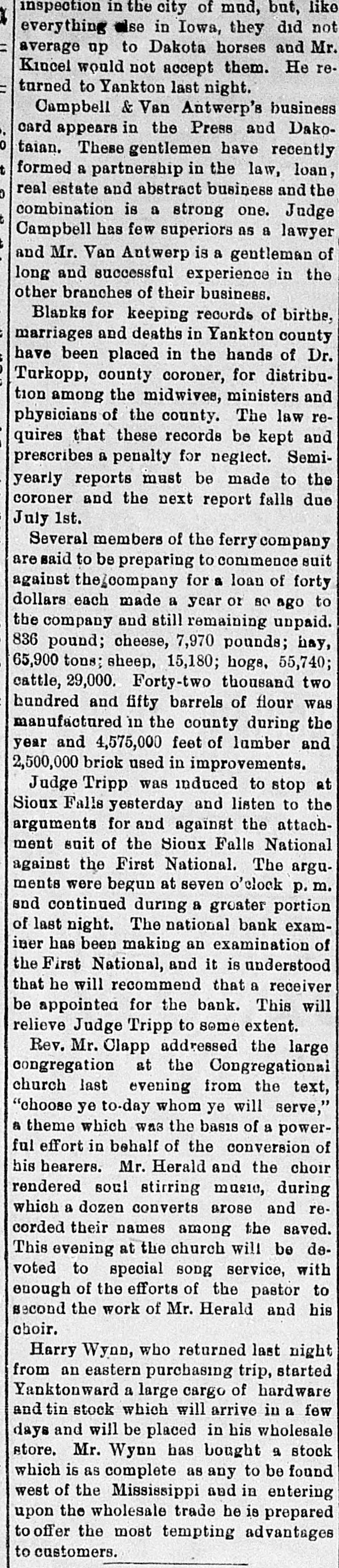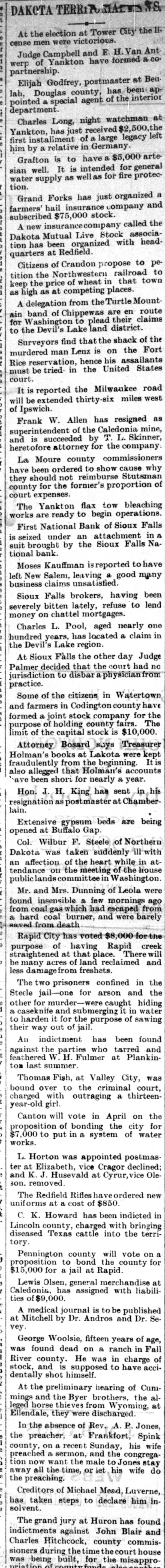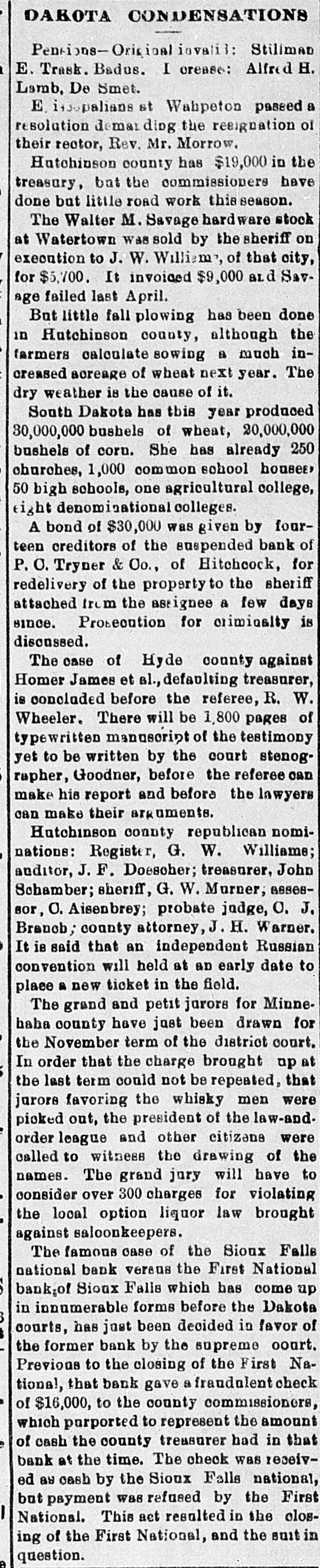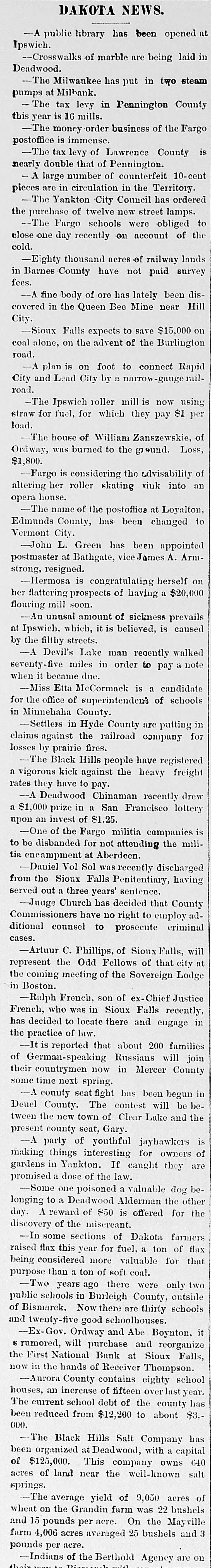 cago. Milwaukee & St Paul Railway company. defts. and apps. from Turner. W Y. Quigley and Frank R. Aikens: C.H. Winsor The territory of Dakota ex. rel. Charles F Templeton, attorney general of the ter ritory of Dakota. plff. and resp. vs. the board of county commissioners of Cass county, Dakota territory, defts. and apps: from Cass C. Pollock A. D. Thomas John A. Ferris, plff and app vs. Charles H. Vannier county treasurer of Stark county. deft and resp: from Morton. T.R. Selmes and John C. Bullitt, jr.: Flannery & Cooke and William Gibson L. B. Richardson and L B. Richardson, jr., co-partners as L. B. Richardson, Jr., & Co. plffs. and apps. vs. independent school district No. 1 of Grand Forks county Dak. deft. and resp; from Grand Forks. Noyes & McLaughlin; W. L. Wilder and Bangs & Bangs. Edward J. McMahon and Charles M MacLaren, co partners as McMahon & Mac Laren, plffs and resps. vs. A. L. Plummer and A. Hanson, co-partners as Plummer & Hanson, defts. and apps: from Cas s Ball, Wallin & Smith: M. W Greene. First National bank of Grand Haven, Michigan, plff. and resp. vs. May Honey man and John H. Reed. impleaded with Ebenezer Honeyman, John Honeyman Angie Honeyman. Alexander Carl. John Mosher, Julian A and Charles M. Lawrence, co partners as Lawrence Brothers Henry W Hamlin defts and apps: from Cass Charles A Pollock: R. M. Pollock, S.B. Bartlett, D.H. Twomey. Mansfield Savings bank. plff. and app vs. James McCaffrey, deft and resp: from Grand Forks. Bossard & Corliss: Noyes & Noves. Albert S. Guptill, plff. and app. vs. C. H. Anheier, county auditor of Cass county, deft. and resp: from Cass. A.D. Thomas: Charles A. Pollock. Heber C. Gardner. plff. and app. vs. the board of education of the city of Fargo and Emerson H. Smith superintendent of the public schools of the city of Fargo. deft. and resp: from Cass. A. Thomas; M.W Greene. Charles S. Raymond, guardian of the minor heirs of George A Ravmond. plff and resp. vs. U.S. Campbell, R. B. Spicer and J.R. King, defts and apps; from Cod ington. Van Liew & Rowe: D.C. & W. R. Thomas. Charles M. Henderson. Wilbur S. Henderson and Francis D. Everett, plffs. and apps. vs. Alexander McRostie as sheriff of Beadle county, deft and resp from Beadle J. B. Kelly, George C. Cooper; Mouser & Volrath. Ried, Murdock and Fischer, plff. and resp vs. insurance company of Dakota. dett. and from Minnehaha, Coughran & MeMartin Bailey & Davis. Leslie Thompson as receiver of the First National bank of Sioux Fails, plff. and resp. vs. John McKee, deft. and app from Minnehaha. Coughran & McMartin: Bailey & Davis. Porter P. Peck, plff. vs. the Sioux Falls Brewing company et. al. partners doing business under the name of Oshkosh Lumber company, H. W Ross and C. L. Kievert, doing business as C.L. Kievert & Co. defts. Porter P Peck resp. and J. Leslie Thompson as receiver, resp Moris Levinger,app: from Minnehaha Coughran & McMartin and Boyce & Boyce and Gamble Bros.: Bailey and Davis. Mamie G Shillock et. al. plffs. and apps vs Richard F Pettigrew et. al. derts. and resps from Minnehaha. Boyce & Boyce; Winsor & Swezey and A. H. Wilkinson. A. Bertelson. as administrator of the estate of Cornelius Wedel. deceased, plff. and resp.vs. Chicago, Milwaukee & St. Paul railway company, deft. and app: from Turner. Aikens: H. Winsor Taylor and A Bidwell plffs. and resps. vs. Alfred Brown and Timothy Young et. al. defts and apps: from Moody C. Winsor: J. H. Eno and Gamble Bros W. S. Lauder, plff. and resp. vs. M. P. Propper, deft and app: from Richland. M. W.Greenh: Stone & Newman. D.P. McLauren, T. A. Shultze et. al. plffs. and resps. vs. the city of Grand Forks and Jacob Eshelman, defts. and apps: from Grand Forks. C. B. Pratt: Arthur J. O'Keefe Territory of Dakota ex. rel. Charles S. Wallace and James M. Martin, as assignee of Daniel H. Wallace, plff. vs. George H. Woodbury, Julius J. Eddy and James Buchanan, constituting the board of county commissioners of Stutsman county, in the territor of Dakota, defts: from Stutsman. Dodge & Camp and John S. Watson; Roderick Rose. George Rice, plff. and resp. vs. Frederick W. Pettigrew, deft. and app; from Moody George Rice, E. L. Powers and George Mathews: .S. Swezey and Gamble Bros. The Insurance company of Dakota, corporation plff. and app. vs. Walter D. Greene deft and resp: from Minnehaha. Bailey & Davis: W. Greene. Cornella Lyon, plff and resp. vs. Insurncecompany of Dakota, defts. and apps: from Minnehaha. Coughran & McMaster; Bailey and Davis. Burton B. Champion, plff. and app. VS. the board of county commissioners of Minnehaha county, Dakota territory, and N. E Phillips, county clerk of Minnehaha county, Dakota territory, defts. and resps: from Minnehaha. Winsor & Kittredge; H. Keith and A. A. Polk. Minnehaha county, Dakota territory; plff. and resp. vs. Burton B. Champion deft. and app: from Minnehaha. H. H. Keith. S. E. Young and A. A. Polk; Winsor & Kittredge. Mary Emma Crompton et. al. resps. vs. C. H. Myers et. al. resps: from Spink. Mouser & Valbrak: H.C. and T.J. Walsh. The Gull River Lumber company, resp. V8 Patrick Keep et. al. defts. William o Ward. app from Burieigh. John E. Carland: Winchester & Hanitch. If your kidneys are inactive, you will feel and look wretched, even in the most cheerful society, and melancholy on the jolliest occasions Dr. J. H. McLean's Liver and Kidney Balm will set you right reain. per bottle. For sale by H. Brandt, Druggist. Married. BAKER CLARK. the parsonage, Bis marck, Sabbath evening. February 5. 1888. by Rev. Charles B. Austin, Mr William M. Baker of Williamsport, Dakota, and Miss Lucinda Clark of Highport, Mo When you are constipated with loss of H. appetite, headache take one of Dr. J. McLean's