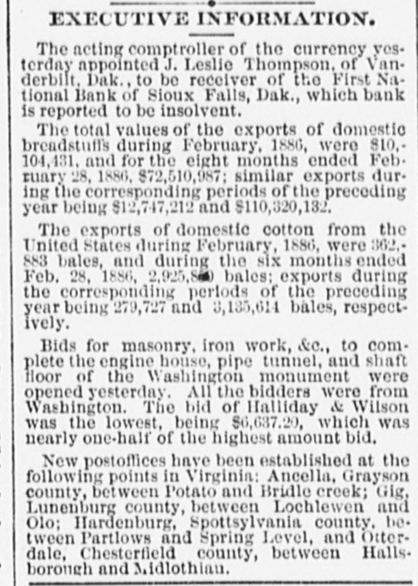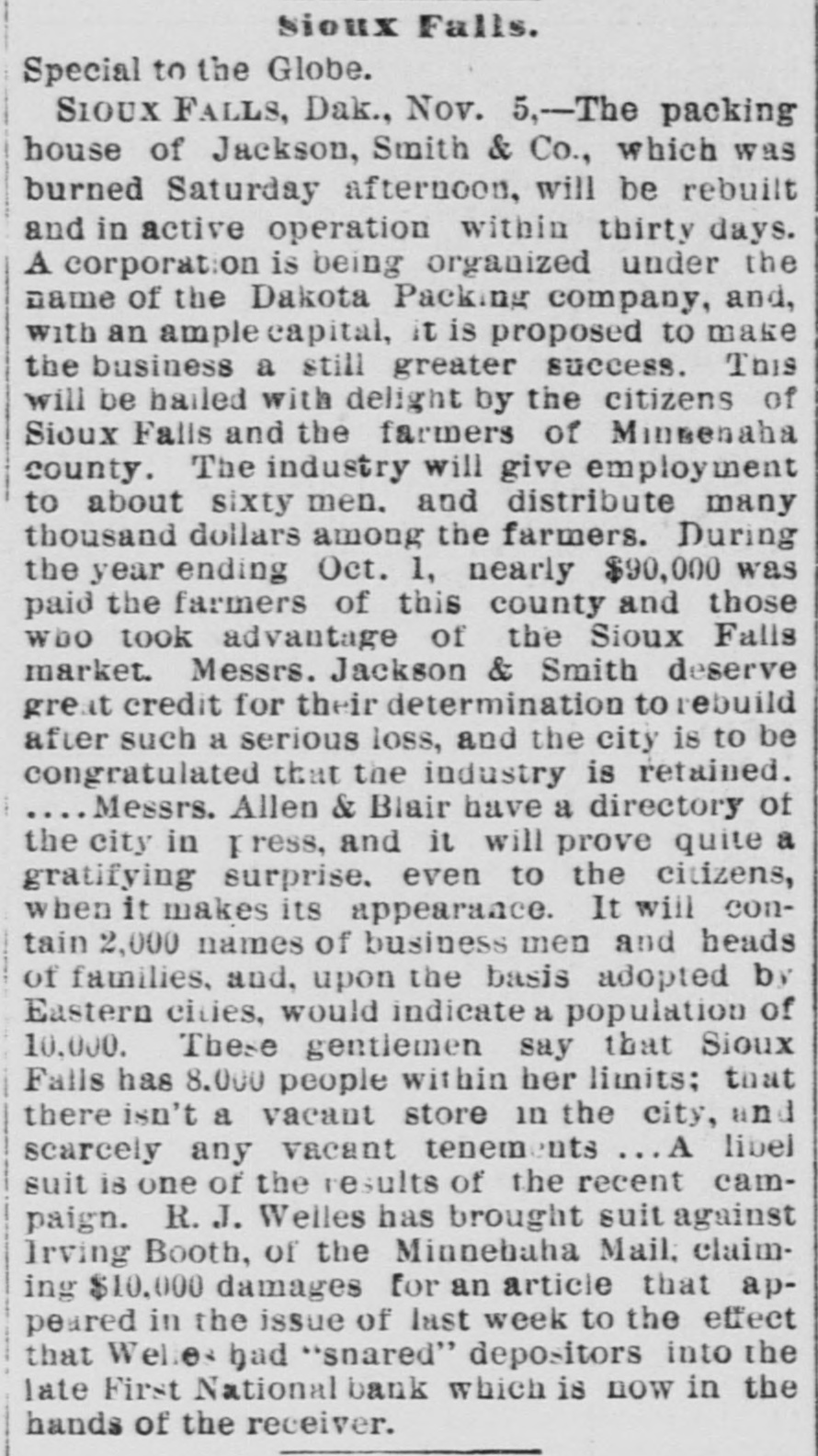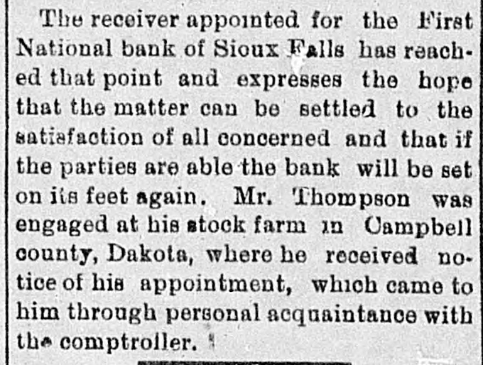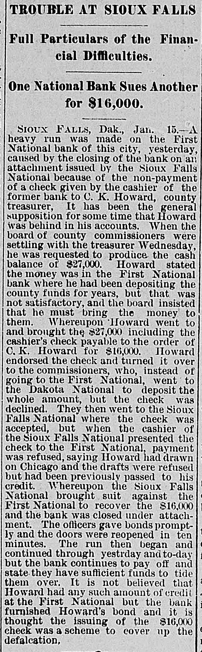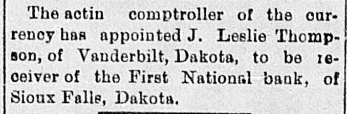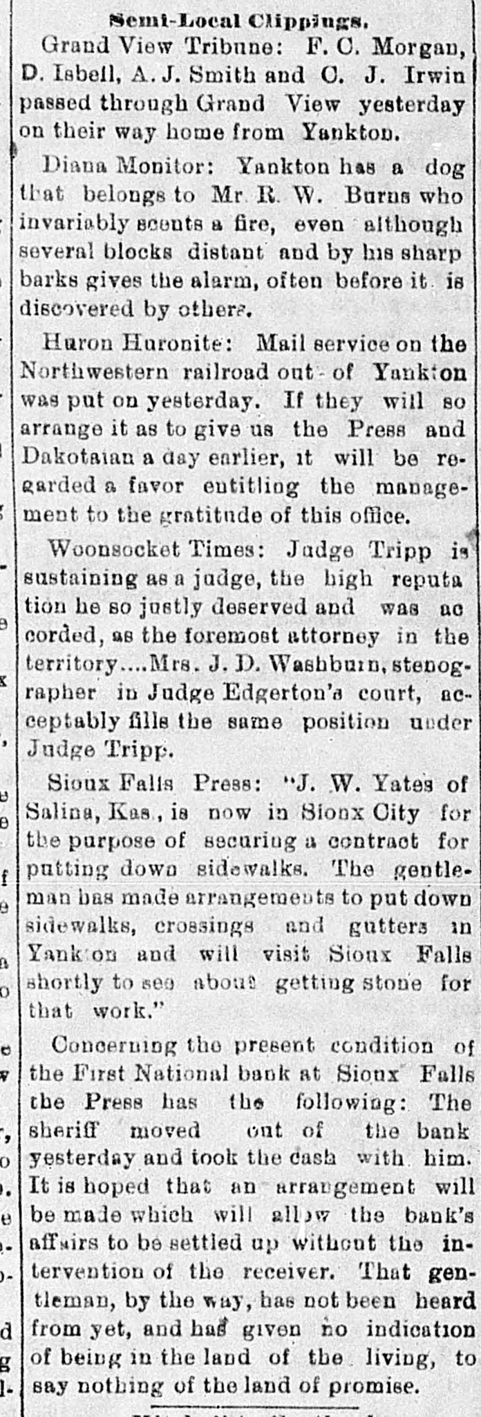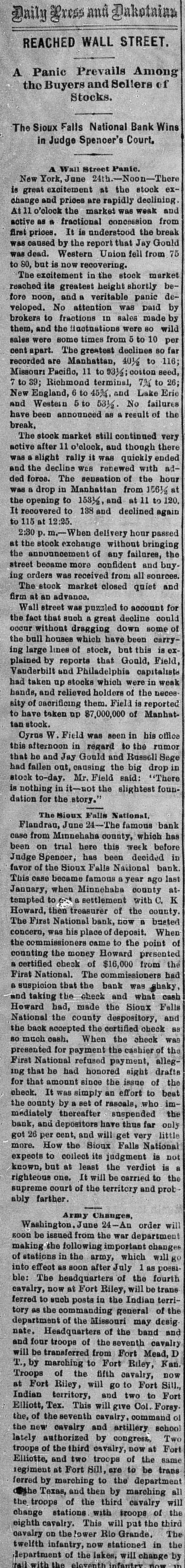 cago. Milwaukee & St Paul Railway company. defts. and apps. from Turner. W Y. Quigley and Frank R. Aikens: C.H. Winsor The territory of Dakota ex. rel. Charles F Templeton, attorney general of the ter ritory of Dakota. plff. and resp. vs. the board of county commissioners of Cass county, Dakota territory, defts. and apps: from Cass C. Pollock A. D. Thomas John A. Ferris, plff and app vs. Charles H. Vannier county treasurer of Stark county. deft and resp: from Morton. T.R. Selmes and John C. Bullitt, jr.: Flannery & Cooke and William Gibson L. B. Richardson and L B. Richardson, jr., co-partners as L. B. Richardson, Jr., & Co. plffs. and apps. vs. independent school district No. 1 of Grand Forks county Dak. deft. and resp; from Grand Forks. Noyes & McLaughlin; W. L. Wilder and Bangs & Bangs. Edward J. McMahon and Charles M MacLaren, co partners as McMahon & Mac Laren, plffs and resps. vs. A. L. Plummer and A. Hanson, co-partners as Plummer & Hanson, defts. and apps: from Cas s Ball, Wallin & Smith: M. W Greene. First National bank of Grand Haven, Michigan, plff. and resp. vs. May Honey man and John H. Reed. impleaded with Ebenezer Honeyman, John Honeyman Angie Honeyman. Alexander Carl. John Mosher, Julian A and Charles M. Lawrence, co partners as Lawrence Brothers Henry W Hamlin defts and apps: from Cass Charles A Pollock: R. M. Pollock, S.B. Bartlett, D.H. Twomey. Mansfield Savings bank. plff. and app vs. James McCaffrey, deft and resp: from Grand Forks. Bossard & Corliss: Noyes & Noves. Albert S. Guptill, plff. and app. vs. C. H. Anheier, county auditor of Cass county, deft. and resp: from Cass. A.D. Thomas: Charles A. Pollock. Heber C. Gardner. plff. and app. vs. the board of education of the city of Fargo and Emerson H. Smith superintendent of the public schools of the city of Fargo. deft. and resp: from Cass. A. Thomas; M.W Greene. Charles S. Raymond, guardian of the minor heirs of George A Ravmond. plff and resp. vs. U.S. Campbell, R. B. Spicer and J.R. King, defts and apps; from Cod ington. Van Liew & Rowe: D.C. & W. R. Thomas. Charles M. Henderson. Wilbur S. Henderson and Francis D. Everett, plffs. and apps. vs. Alexander McRostie as sheriff of Beadle county, deft and resp from Beadle J. B. Kelly, George C. Cooper; Mouser & Volrath. Ried, Murdock and Fischer, plff. and resp vs. insurance company of Dakota. dett. and from Minnehaha, Coughran & MeMartin Bailey & Davis. Leslie Thompson as receiver of the First National bank of Sioux Fails, plff. and resp. vs. John McKee, deft. and app from Minnehaha. Coughran & McMartin: Bailey & Davis. Porter P. Peck, plff. vs. the Sioux Falls Brewing company et. al. partners doing business under the name of Oshkosh Lumber company, H. W Ross and C. L. Kievert, doing business as C.L. Kievert & Co. defts. Porter P Peck resp. and J. Leslie Thompson as receiver, resp Moris Levinger,app: from Minnehaha Coughran & McMartin and Boyce & Boyce and Gamble Bros.: Bailey and Davis. Mamie G Shillock et. al. plffs. and apps vs Richard F Pettigrew et. al. derts. and resps from Minnehaha. Boyce & Boyce; Winsor & Swezey and A. H. Wilkinson. A. Bertelson. as administrator of the estate of Cornelius Wedel. deceased, plff. and resp.vs. Chicago, Milwaukee & St. Paul railway company, deft. and app: from Turner. Aikens: H. Winsor Taylor and A Bidwell plffs. and resps. vs. Alfred Brown and Timothy Young et. al. defts and apps: from Moody C. Winsor: J. H. Eno and Gamble Bros W. S. Lauder, plff. and resp. vs. M. P. Propper, deft and app: from Richland. M. W.Greenh: Stone & Newman. D.P. McLauren, T. A. Shultze et. al. plffs. and resps. vs. the city of Grand Forks and Jacob Eshelman, defts. and apps: from Grand Forks. C. B. Pratt: Arthur J. O'Keefe Territory of Dakota ex. rel. Charles S. Wallace and James M. Martin, as assignee of Daniel H. Wallace, plff. vs. George H. Woodbury, Julius J. Eddy and James Buchanan, constituting the board of county commissioners of Stutsman county, in the territor of Dakota, defts: from Stutsman. Dodge & Camp and John S. Watson; Roderick Rose. George Rice, plff. and resp. vs. Frederick W. Pettigrew, deft. and app; from Moody George Rice, E. L. Powers and George Mathews: .S. Swezey and Gamble Bros. The Insurance company of Dakota, corporation plff. and app. vs. Walter D. Greene deft and resp: from Minnehaha. Bailey & Davis: W. Greene. Cornella Lyon, plff and resp. vs. Insurncecompany of Dakota, defts. and apps: from Minnehaha. Coughran & McMaster; Bailey and Davis. Burton B. Champion, plff. and app. VS. the board of county commissioners of Minnehaha county, Dakota territory, and N. E Phillips, county clerk of Minnehaha county, Dakota territory, defts. and resps: from Minnehaha. Winsor & Kittredge; H. Keith and A. A. Polk. Minnehaha county, Dakota territory; plff. and resp. vs. Burton B. Champion deft. and app: from Minnehaha. H. H. Keith. S. E. Young and A. A. Polk; Winsor & Kittredge. Mary Emma Crompton et. al. resps. vs. C. H. Myers et. al. resps: from Spink. Mouser & Valbrak: H.C. and T.J. Walsh. The Gull River Lumber company, resp. V8 Patrick Keep et. al. defts. William o Ward. app from Burieigh. John E. Carland: Winchester & Hanitch. If your kidneys are inactive, you will feel and look wretched, even in the most cheerful society, and melancholy on the jolliest occasions Dr. J. H. McLean's Liver and Kidney Balm will set you right reain. per bottle. For sale by H. Brandt, Druggist. Married. BAKER CLARK. the parsonage, Bis marck, Sabbath evening. February 5. 1888. by Rev. Charles B. Austin, Mr William M. Baker of Williamsport, Dakota, and Miss Lucinda Clark of Highport, Mo When you are constipated with loss of H. appetite, headache take one of Dr. J. McLean's