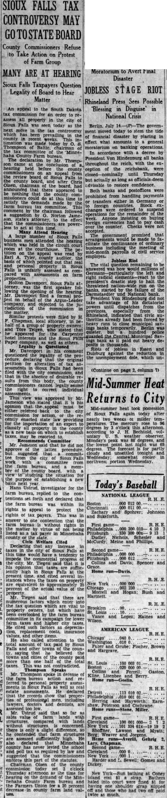 SIOUX FALLS TAX CONTROVERSY MAY TOSTATE BOARD County Commissioners Refuse to Take Action on Protest of Farm Group MANY ARE AT HEARING Sioux Falls Taxpayers Question Legality of Board to Hear Matter appeal to the South Dakota "Blessing in Disguise' in tax commission for an order to reNational Crisis assess all property in the city of Sioux was seen today as the next controversy moved today to stem the tide which has been in the of financial disaster by placing in county recent weeks. timation effect what amounts to general made today Thompson chairman on banking operations. the tax of the Minne- In accordance with decree haha Farm President Von Hindenburg all banks The by Thompthroughout the reich, with the exhearing held before the ception the reichsbank, were on appeal from until Thursday the review board Falls but actually as long as county board, after Olsen, the board, had advisable confidence. that appeared Both and postoffices were be nothing that the county prohibited handling payments could do this time satisfy the transfers either in Germany or demands made by the foreign countries. Stock tax committee. This comment changes ordered by the chairman followed operations for the remainder of the suggestion by JameAnyone insisting on buying attorney, the effect that the currencies pay are powercounter. Checks were to at this Attend Hearing The government promised that A number Falls would made fathe hearing cilitate the continuance of ordinary which was held the room at the The business including the civil meeting payrolls of service on the appeal was read Earl employes. county auditor, Jobless Riot of which pointed out that The vital to be and personal property was would millions unfairly assessed as the left pared assessments on farm right radical elementspresident's drastic step to halt Holton Sioux Falls threatened run on was the banks, by the failure the the National bank. President Von did on behalf of the take of his dictatorial company, and objected to the from risdiction the commission provinces, especially the matter. indicated that civic Similar were filled by H thorities already had been forced by Chapman, runs to close half group property Berlin and Tore who stated that quieter. appeared for Carpenter guarded Savhotel interests and the Sioux ings bank paid out heavy dePaper company well to Legality Questioned Riots of jobless in Essen and Mr. Davenport his comment against the questioned the the the unemployment dole, which uncedure. original tax (Continue on page 2, column 7) county Mid-Summer Heat cannot asume individual Returns to City heat took possession the city of Sioux Falls again today after providing nearly milder temperatures. The rose to county degrees by afternoon. establish according to untary weather observer Monday's peak was 88 degrees, and the last night was forecast partly commit- cloudy unsettled tonight Sioux Wednesday cooler in Falls northwest portion Wednesday. from memsituation for the purpose new Today's Baseball Hans Ustrud. investigator for the farm bureau, replied to the conNATIONAL LEAGUE tentions forth and declared that the farm bureau was within its Boston 000 Cincinnati rights to appeal to protect the Zachary Spohrer; Johnson rights of tax payers. This was and Sukeforth. answer to one contention that the without rights First the virtue not being Philadelphia 000 listed tax payer in Pittsburgh county the Dudley Nichols, Schesler and Civie Welfare Cited McCurdy: Meine and Phillips. Declaring that any increase in taxes the city Sioux Falls Second R.H.E. this time have tendency Philadelphia 000 impede the of Pittsburgh progress the city Mr. Tiegen said that is Collins and Davis; Spencer and his opinion that suffic- Grace. taxes are iently high in Sioux Falls at the Home run-Davis. present time, and cited New York 000 Chicago Morrell and Hogan; Bush and factors into R. H. Brooklyn Louis by the farm bureau Vance and Lopez; Haines and Wilson. taxes. He cited such factors depreciaAMERICAN LEAGUE tion, costs, insurance and other Chicago 040 He also called attention to the amount of tax Sioux Faber and Grube: Fischer, Brown Falls other towns of the counand Hargrave. saying that believed the St. Louis Boston Collins Ferrell: Gaston. defense of Kline, Lisenbee and Berry. Home R.H.E. declared Detroit proper- Philadelphia Herring Hayworth: Earnare Peterson and Home runs-Stone, Miller. with First Cleveland without concerned. New York Shoffner. and Myatt; Weaver and Jorgens. high. He Gehrig 2, Minnehaha Lary, Second game- R.H.E. Cleveland New Harder and L. Sewell; Gomez and Chairman Olsen of the county o'clock New bathing at Coney cost Bathers haled into court fined $1 for percent one silpped land val- off and those who had two off paid twice much.