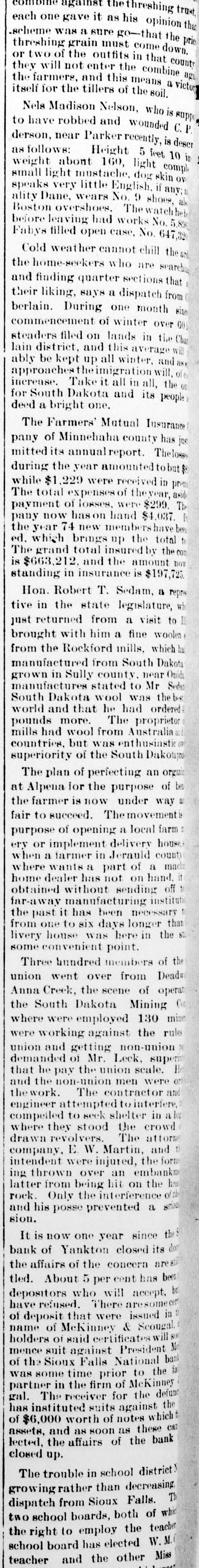 our 10 suamm am non uasur Nels Madison Nelson, who is to have robbed and wounded C. derson, near Parker recently, is as follows: Height 5 feet 10 weight about 160, light small light mustache, dog skin speaks very little English. if any; ality Dane, wears No. 9 shoes, Boston overshoes. The watchheb before leaving had works No. No. 'asno nado Peny Cold weather cannot chill the home-seekers ho are searchi and finding quarter sections that their liking, says a dispatch from berlain. During one month commencement of winter over steaders filed on lands in the lain district, and this average will ably be kept up all winter, and approaches theimigration will, increase. Take it all in all, the for South Dakota and its people deed a bright one. The Farmers' Mutual Insurance pany of Minnehaha county has mitted its annual report. Thelos during the year amounted tobut u! area $1.229 The total expenses of theyear, $299 элэм ] jo question pany now hason hand $4,037. мәц 14 JU+A our ed. which brings up the total The grand total insured the is $663,212. and the amount now s! u! statements Hon. Robert T. Sedam, a tive in the state legislature, just returned from a visit to brought with him a fine woolen from the Rockford mills, which manufactured from South Dakota grown in Sully county. near Onida " 04 stated South Dakota wool was the best world and that he had ordered equal more spunod mills had wool from Australiamd countries, but was enthusiastic on superiority of the South Dakotapro The plan of perfecting an at Alpena for the purpose of be 11 AUM Japun MOU s! Jennier am fair to succeed. The movements purpose of opening a local farm ery or implement delivery house when a farmer in Jerauld county where wants a part of a machin home dealer has not on hand. it obtained without sending off far-away manufacturing institution the past it has been necessary neqt Insure sams XIS of eno more livery house was here in the some convenient point. Three hundred members of union went over from Deadwo Anna Creek, the scene of the South Dakota Mining where were employed 130 miue were working against the rules union and getting non-union demanded of Mr. Leck, superity that he pay the union scale. and the non-union men were thework. The contractor and engineer attempted to interfere, competled to seek shelter in where they stood the crowd drawn revolvers. The attorney pun Marting M a 'Aunduios intendent were injured, the form un JOAO umorth But latter from being hit on the headth rock. Only the interference B essod siy pun sion. since and auo MOU si 41 bank of Yankton closed its door the affairs of the concern arestions tled. About 5 per cent has been depositors who will accept, have refused. There aresomecent of deposit that were issued in name of McKinney & Seougal holders of said certificates will mence suit against President of the Sioux Falls National bank was some time prior to the partner in the firm of McKinney gal. The receiver for the defune has instituted suits against the of $6,000 worth of notes which assets, and as soon as these lected, the affairs of the bank