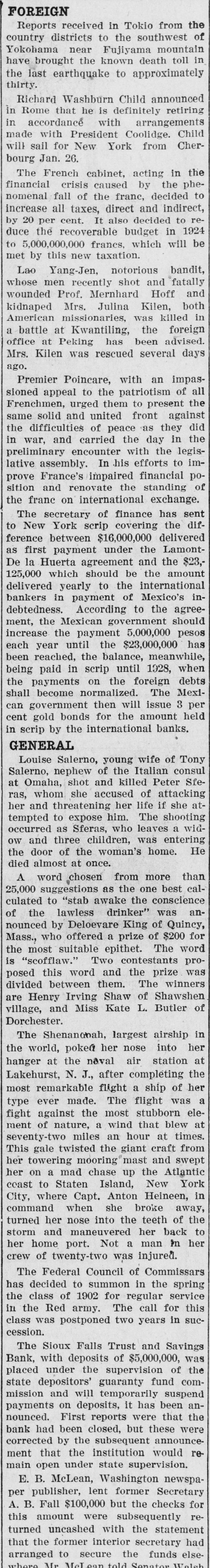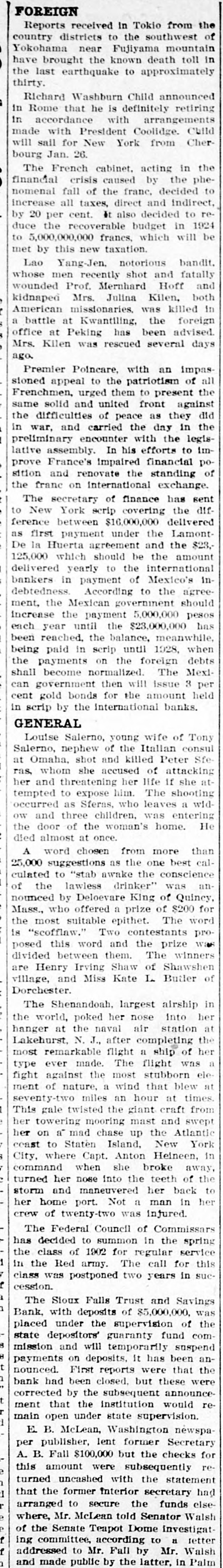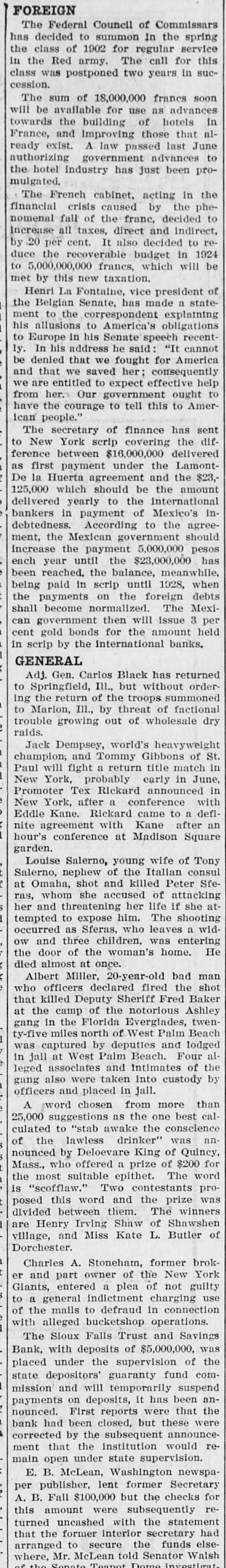cession. The sum of 18,000,000 available for use as will be francs advances soon towards the building of and those France, improving hotels that al- in ready exist. A law passed last June authorizing government advances to the hotel industry has just been promulgated. , The French cabinet, acting in the financial crisis caused by the fall of the decided increase nomenal all franc, phe- to taxes, direct and indirect, per cent. It also recoverable in 1924 duce to by 20 the budget decided to re5,000,000,000 francs, which will be met by this new taxation. Henri La Fontaine, vice president of Senate, has made to the correspondent ment the his Belgian explaining a stateallusions to America's his Senate address he said: "It ly. to Europe In his in speech obligations recent- cannot that we for we saved her; and be denied that fought consequently America we are entitled to expect effective Our government to from have the her. ought help courage to tell this to American people." secretary of finance has The sent to New York scrip payment under the ference as first between $16,000,000 covering delivered Lamont- the difagreement and the which should be the De 125,000 la Huerta amount $23,delivered yearly to the international payment of debtedness. bankers in Mexico's inAccording to the agreethe payment increase ment, the Mexican government 5,000,000 should pesos each year until the the been reached, balance, $23,000,000 meanwhile, has being paid in scrip until 1928, when on the foreign normalized. shall the payments become The Mexi- debts can government then will issue 3 per bonds for the held cent gold amount in scrip by the international banks. GENERAL Adj. Gen. Carlos Black has returned to Ill., but without ordering return of the Springfield, the troops summoned to Ill., by threat of out of trouble Marion, growing wholesale factional dry raids. world's and St. champion, Jack Dempsey, Tommy Gibbons heavyweight of a return title in probably in Paul New will York, fight early match June, Promoter Tex Rickard announced in after a conference Rickard came New Eddle York, Kane. to a with definite agreement with Kane after an hour's conference at Madison Square garden. young wife of Louise nephew Salerno, Tony Salerno, of the Italian consul at Omaha, shot and killed Peter ras, accused of her life if she ather and whom threatening she attacking Sfeto expose him. The as Sferas, who leaves tempted occurred shooting a widow and three children, was entering the door of the woman's home. He died almost at once. Albert Miller, 20-year-old bad man who officers declared fired the shot that killed Deputy Sheriff Fred Baker camp notorious gang at the in the Florida of the Everglades, Ashley twenty-five miles north of West was by and captured deputies Palm lodged Beach in jail at West Palm Beach. Four aland intimates the were into by leged gang also associates taken custody of officers and placed in jail. A word chosen from more than 25,000 suggestions as the one best calto awake the culated the lawless "stab conscience was of drinker" anDeloevare of a of for Mass., nounced who by offered prize King $200 Quincy, the most suitable epithet. The word Two and the was posed is "scofflaw." this word contestants prize prodivided between them. The are Shaw of Henry Irving Shawshen winners village, and Miss Kate L. Butler of Dorchester. Charles A. Stoneham, former broker part owner of the New York a of not Giants, and entered plea guilty to a use of the mails to defraud in general indictment charging connection with alleged bucketshop operations. The Sioux Falls Trust and Savings Bank, with deposits of $5,000,000, was the of the fund complaced state depositors' under guaranty supervision mission and will temporarily suspend payments on deposits, it has been announced. First reports were that the but these were announcebank corrected had by been the closed, subsequent ment that the institution would remain open under state supervision. E. B. McLean, Washington newspaper publisher, lent former Secretary A. B. Fall $100,000 but the checks for were restatement had this turned that the amount uncashed former interior with subsequently the secretary arranged to secure the funds else-