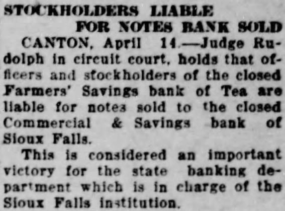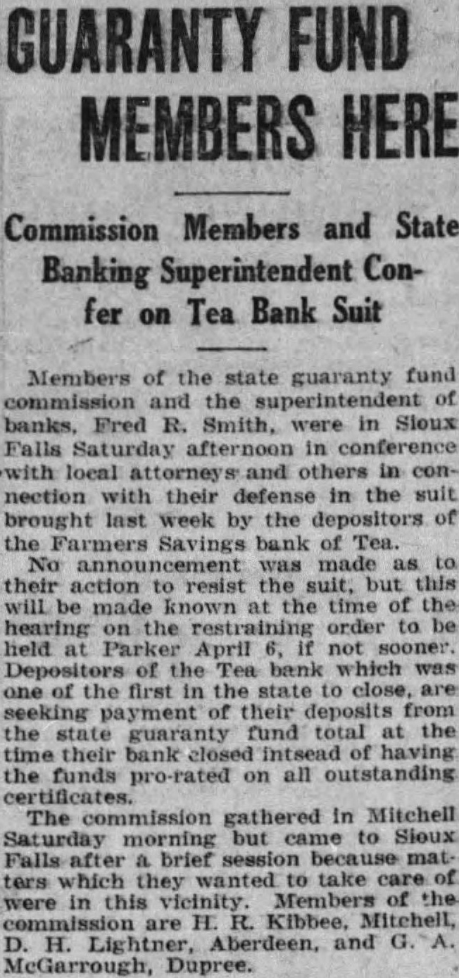 GUARANTY FUND MEMBERS HERE Commission Members and State Banking Superintendent Confer on Tea Bank Suit Members of the state guaranty fund and the of banks, Fred R. Smith, were in Sloux Falls in with in connection with their defense in the suit brought week by the of the Farmers Savings of Tea. No action resist the this will made the time of the order to held Parker April not the bank which was of the first in the state to close, are seeking payment of their deposits from the state guaranty fund total the their having the funds on all outstanding The commission gathered in Mitchell Saturday morning but to Sioux Falls brief matters they wanted to take care were in Members of the this are H. R. Kibbee, H. Lightner, Aberdeen, and McGarrough, Dupree.
