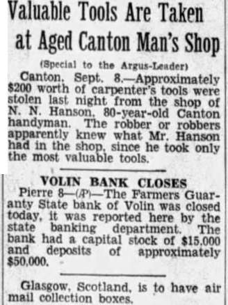 Valuable Tools Are Taken at Aged Canton Man's Shop (Special to the Argus-Leader) $200 Canton. Sept. .-Approximately worth of carpenter's tools last night from the shop Canton handyman. The robber robbers apparently knew what Mr Hanson had in shop, since he took only the most valuable tools. VOLIN BANK CLOSES Farmers Guaranty State bank of Volin was closed today, state reported here by the banking department. The bank had capital stock of deposits of approximately $50,000. Glasgow, Scotland. is to have air mail collection boxes.