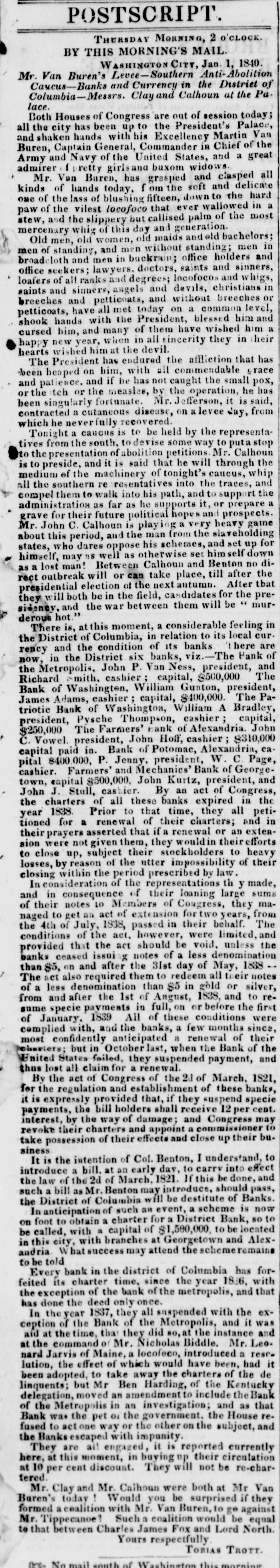 POSTSCRIPT. Thursday MORNING, 2 O'CLOCK. THIS MORNING'S MAIL. BY Jan. 1, Abolition 1840 WASHINGTON CITY Anti- District Columbia-Messr's Mr. Caucus-Bunks Van Buren's and Currency Clayar Calhoun in the at the Pa- of lace. Both Houses of Congress to the are out President's of session Palace, today; Van all and Buren, the shaken city Captain hands has been General, with up his United Commander Excellency States, in and Martin Chief a of great the Army and and buxom Van Baren, has grasped soft and delicate Mr. of hands today. f om the down to the admirer Navy pretty of girls the widows and clasped hard all a kinds the lass of blushing fifteen, ever wallowed most in one of of the vilest locofoco callised that palm of the paw and the slippery but and generation. / stew, whig of this day and bachelors; in Old men, old women, without and and men office holders men mercenary of standing, men in backram; old maids standing; and sinners, men broadcloth and doctors, saints seekers; lawyers. locofocos and whigs, office of all ranks and degrees; and devils. christians in loafers sinners, angels without breeches saints and and petticoats, and a common breeches have all met today on blessed him level, and or a petticoats, with the President, wished him shook cursed hands him, year, and many when in of all them sincerity have they in their happy wished new him at the devil. has that hearts The President has endured with all the commendable affliction race been heaped on and him, if he has not caught the small he pox, has and patience. tch or the measles, by Mr. the Jefferson, operation, it is said, been or the singularly a cutaneous fortunate. disease, on levee Jay, from which contracted he neverfully a caucus is recovered. to be held some by way the to representa- putastop tives Tonight from the south, of to abolition devise petitions. Mr. Calhoun the to the presentation and it is said that he will caucus, through whip medium is to preside, of the machinery of tonight's into the traces, and , all compelthem the southern to as walk re far resentatives into as he his supports path, and it, and to or support the prospects. prepare a administration for their future political hopes very heavy game Mr. grave John C. Calhoun is playing from a the slaveholding about this period, and the his man schemes, and set up down for . states, himself, who may dares as well oppose as otherwise Calhoun and set hims Benton no direct as a lost outbreak man! election will Between or of can the take next place, antumn. till for After after the that the presidential in the field, candidates be mur- preP they will and both the be war between them will hot. this moment, a local There is, at of Columbia, in relation banks to its here derous sidency, District of its considerable feeling cur- are in the rency and the District condition six banks, viz. president, The Pank and of now, in the John P. Van Ness, $500,000 The the Bank Richard Metropolis. of Washingten, mith. cashier cashier ; William capital, capital, Gunton, $400,000. president, The PaJames triotic Adams, Bank of Washington, William cashier A Bradley, capital, , president, Pysche Farmers' Thompson, Bank of Alexandria. John $250,000 John Hoff, cashier cac. Vowel. in. Bank of Potomac, W. C capital paid president, The president, Alexandria, $310,000 George- Page, pital $400.000, P. Jenny, Mechanics' Bank of cashier. Farmers' $500,000, and John Kurtz, president, and town, capital By an act of Congress, the charters of all these that time, they all petiJohn J. Stull, Prior cashier to banks expired in and the in year 1838. renewal of their charters; extentioned for a asserted that if a renewal or their an efforts , sion their were prayers not given them, they stockholders would in to heavy to close up, subject of the their utter impossibility of their losses, within the period prescribed th of the representations y sums closing consideration by reason by law. made, In consequence of their loaning large they maand in notes 10 Members of Congress, from of their act of extension rtwo years, The naged to of 1838, passed in their the of the act, however, were the that the act denomination provided conditions 4th get July, an should be void. behalf. limited, unless and issui g notes of a less 1838 banks ceased and after the 31st day of May, their than $5, also on required them to redeem all or silver, notes The act denomination than $5 in gold to of a less after the 1st of August, the first from and payments in full, on or were sume specie 1839 All of these January, conditions 1838, before months and since, reof with, and the banks, a few of their complied confidently anticipated a renewal Bank of the most but in October when the and ( charters; United States failed, they suspended payment, thus lost the all act claim of Congress for a renewal. of the 21 of March, these banks, 1821, for By the expressly regulation provided and establishment that, if they of suspend 12 per specie cent. it is the bill holders shall receive the way of damage; and Congress may to revoke their of their effects and close take interest, payments, possession by charters and appoint a commissioner p their business intention of Col. Benton, I understand, into effect to It is the a bill. at an early day, to carry be done, and the 2d of March, 1821. If this should the law bill of as Mr. Benton may introduce, of District a of Columbia will be scheme is such introduce the destitute Banks. pass, now In anticipation of charter such an for event, a District a Bank, so to on foot to obtain with a a capital of $1,500,000, to and be located be called, with branches at Georgetown this city, What success may attend the andria. to be told Columbia schemeremains has Alex- forbank in the district of with Every charter time, since the year 1836, that feited the exception its of the bank of the metropolis, and has done the deed 1837, only they once. all suspended with the exIn the of year the Bank of the Metropolis, and it was