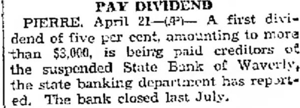 PAY DIVIDEND PIERRE. April 21-(4)- A first dividend of five per cent. amounting to more than $3,000, is being paid creditors of the suspended State Bank of Waverly, the state banking department has reported. The bank closed last July.