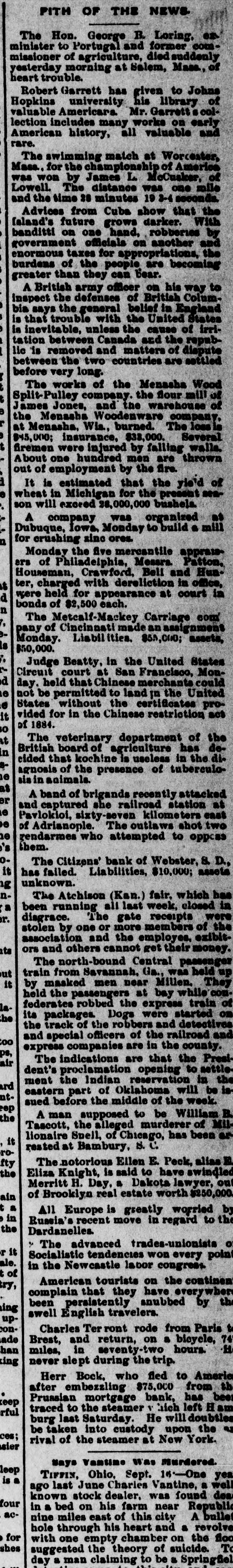 FITH OF THE NEWS. The Hon. George B. Loring, en. minister to Portugal and former commissioner of agriculture, died suddenly yesterday morning at Salem, Mass., of heart trouble. Robert Garrett has given to Johns Hopkins university his library of valuable Americars. Mr. Garretts 8 collection includes many works on early rare. American history, all valuable and The swimming match at Worcester, Mass., for the championship of America was won by James L. McCusker, of Lowell. The distance was one mile and the time 28 minutes 19 3-4 seconds. Advices from Cuba show that the faland's future grows darker. With banditti on one hand, robberies by government officials on another and enormous taxes for appropriations, the burdens of the people are becoming greater than they can bear. A British army officer on his way to inspect the defenses of British Columbia says the general belief in England is that trouble with the United States is inevitable, unless the cause of irritation between Canada and the republic is removed and matters of dispute between the two countries are settled before very long. The works of the Menasha Wood Split-Pulley company. the flour mill of James Jones, and the warehouse of the Menasha Woodenware company. at Menasha, Wis., burned. The loss is $45,000; insurance, $38,000. Several firemen were injured by falling walls. About one hundred men are thrown out of employment by the fire. It is estimated that the yie'd of wheat in Michigan for the present season will exceed 28,000,000 bushels. A company was organized Dubuque, Iowa, Monday to build a mill at for crushing zinc ores. Monday the five mercantile appraisars of Philadelphia, Messra. Patton. Houseman, Crawford, Bell and Hunter, charged with dereliction in office, were held for appearance at court in bonds of $2,500 each. # The Metcalf-Mackey Carriage com' pany of Cincinnati made an assignment $50,000. Monday. Liabilities. $55,000; assets, Judge Beatty, in the United States Circuit court at San Francisco, Mond day. held that Chinese merchants could e not be permitted to land in the United . States without the certificates proit vided for in the Chinese restriction act of 1884. 0 t The veterinary department of the in British board of agriculture has decided that kochine is useless in the die agnosis of the presence of tuberculosin in animals. at er A band of brigands recently attacked © and captured she railroad station at Pavlokioi, sixty-seven kilometers east : of Adrisnople. The outlaws shot two he them. rendarmes who attempted to opposs o The Citizens' bank of Webster, 8. D., it has unknown. failed. Liabilities, $10,000; assets au nThe Atchison (Kan.) fair, which has a been running all last week, closed in r. disgrace. The gate receipts were stolen by one or more members of the association and the employes, exibitits ors and others cannot get their money. The north-bound Central passenger ut train from Savannah. Ga., was held up it by masked men near Millen. They held the passengers at bay while conlafederates robbed the express train of he its packages. Dogs were started the track of the robbers and on detectives too and special officers of the railroad and pe, express companies are in the county. air The indications are that the President's proclamation opening to nettle. p.m ment the Indian reservation in the nteastern part of Oklahoma will be isdea sued before the middle of the week. the A man supposed to be William B. Tascott, the alleged murderer of Milit lionaire Spell, of Chicago, has been an rorested at Bambury, S. C. fty The notorious Ellen E. Peck, alias E. the Eliza Knight, is said to have swindled Merritt H. Day, a Dakota lawyer, out ain of Brooklyn real estate worth $250,000. a All Europe is greatly worried in the Russia's Dardanelles. recent move in regard to by the , The advanced trades-unionists r it it ale. Socialistic tendencies won every o point of in the Newcastle labor congress. $ American tourists on the continent complain that they have everywher ing been persistently snubbed by the swell English travelers. upconCharles Ter ront rode from Paris t ade Brest, and return, on a bicycle, 74 H han miles, in seventy-two hours. king never slept during the trip. Herr Bock. who fled to America after embezzling $75,000 from th keep Prussian mortgage bank, has beer traced to the steamer 1 hich left H am burg last Saturday. He will lldoubtles 7 ces; be taken into custody upon the sier rival of the steamer at New York. Mays Vantine was Murdered. leep is . TIFFIN, Ohio, Sept. 16:One ago last June Charles Vantine, a well yea four known stock dealer, was found dea acin a bed on his farm near Republic nine miles east of this city A bullet hole through his heart and a revolve for . with one empty chamber on the shes suggested the theory of suicide. To fioo day a man claiming to be a Springfiel