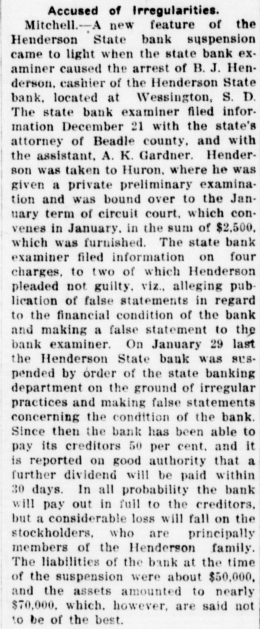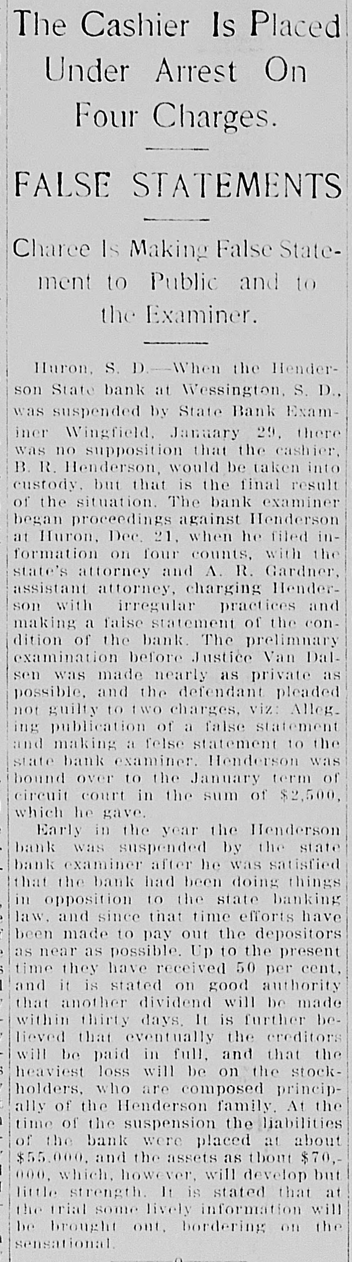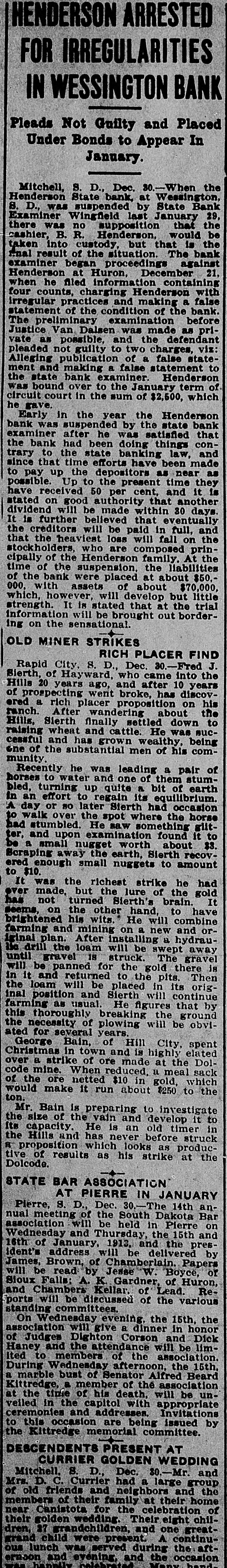 N.P. Heinz, of Aurora county, was found insane by the insanity commission and has been taken to the state insane hospital at Yankton. Mike Stadler, of Kimball county, has sold his entire herd of pure bred cattle. said to be the finest in the state, to R. C. Drake, of Plankinton. Articles of incorporation have been filed with the secretary of state for the Niobrara and Sioux City Railway Co., with a capital of $1,000,000. Farmers in the vicinity of Oelrich will use dynamite to loosen the soil on the theory that better crops can be grown if this method is followed. The Standard Oil company has selected McIntosh, in Corson county, its distributing point for that section of the state. A big building will be erected at once. M. F. Meyers, editor of the American Co-Operative Journal, of Chicago, addressed a big farmers' meeting at Hoven on the question of co-operative elevators and like enterprises The Minneapolis and St. Louis railway has granted a free freight rate on seed grain to the commissioners of McPherson county and bonds have been issued by the county to secure enough to supply the farmers. The drouth of last season in the western part of the state is now declared to be a blessing in disguise. It is said the stimulating effect which it had on irrigation and dry farming methods will more than make up for the losses occasioned. A newspaper printed in the language of the Sioux is being published by the Indians on the Cheyenne River reservation. A bananna tree at the state college at Brookings is about to bear its first crop of fruit since it was brought from tropical climes. Over 400 Knights of Columbus attended the big meeting of that order under the auspices of the Mount Marty Council at Yankton. The schools at Yankton have reopened foilowing a threatened epidemic of scarlet fever which caused the board to close them for a short period. The grand lodge of the Degree of Honor of South Dakota has incorporated under the laws of the state. It has been in the state for about 13 years. Harry Chambers and Clarence Middleton, two well known young men of Watertown, have been arrested charged with assaulting E. D. Wilson, of Noblesville. Ind. Miss Irene Tastad and Richard Rasmussen, of Woonsocket, sweethearts under parental displeasure, have disappeared and it is believed that they have eloped. All efforts to locate them have failed. A big good roads movement has been launched in Perkins county. It will begin its efforts by securing the construction of a good road from the county seat 40 miles to the nearest railroad point. Financial difficulties besetting the Betts Construction Co., of Huron, has caused the state association of Elks to take over the fine new building at Rapid City which that company was building for the order. The National Life Insurance Co., of Montpelier, Vt., the Bankers' Accident of Des Moines, the Jefferson Fire of Philadelphia, and the Ply. mouth Casualty of Minneapolis have withdrawn from the state. Reports from Berlin, Germany, are to the effect that Miss Cordelia Lee, a South Dakota girl, is making a big success in musical circles there. The same regulations regarding registration are to apply in South Dakota in the future for all municipal and local elections as for the state elections. The Henderson State bank, at Wessington, closed for some weeks because of inability to realize on overdue loans, may be placed in the hands of a receiver. Residents between Philip and Faith are petitioning for a mail line connecting those towns. At present mail has to travel 500 miles to get a distance of 60 miles. Indications are that the commission plan of government will be voted in at Watertown Saturday by a big majority. The campaign has been a vigorous one. Mystery surrounds the death of Mr. and Mrs. Chris Jensen, of Hurley, who were found dead in their home by neighbors. It is thought that they may have been overcome by coal gas. The success of the state builders meeting in session at Aberdeen exceeds all expectations and many present pronounce it one of the most significant gatherings ever held in the state. Weather and crop prophets throughout the state are predicting the great-