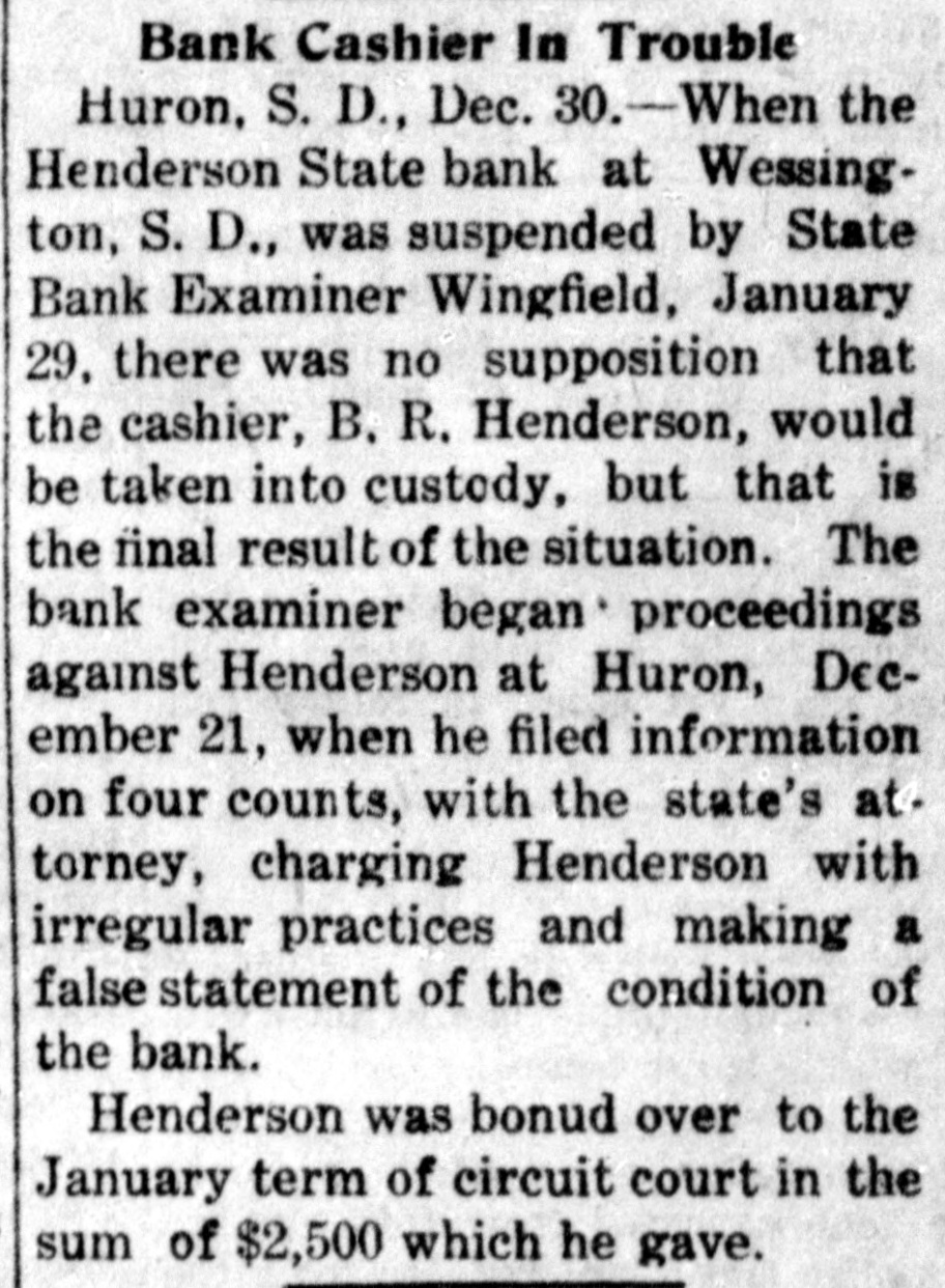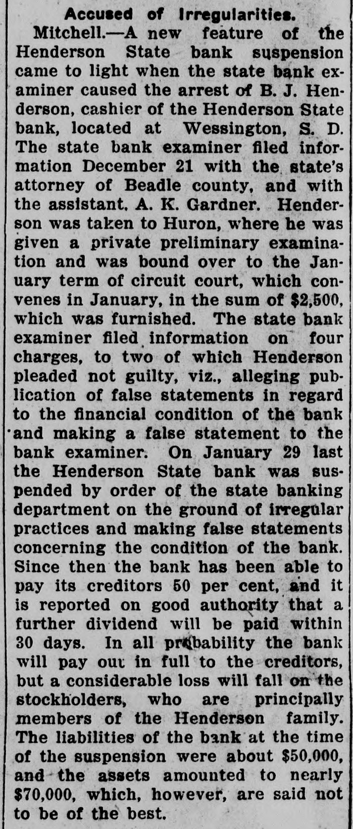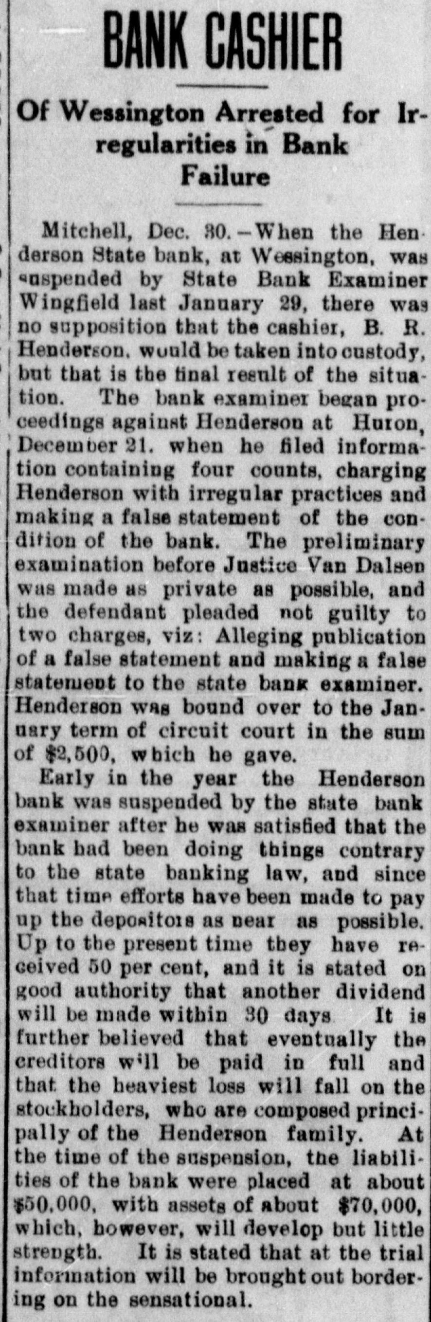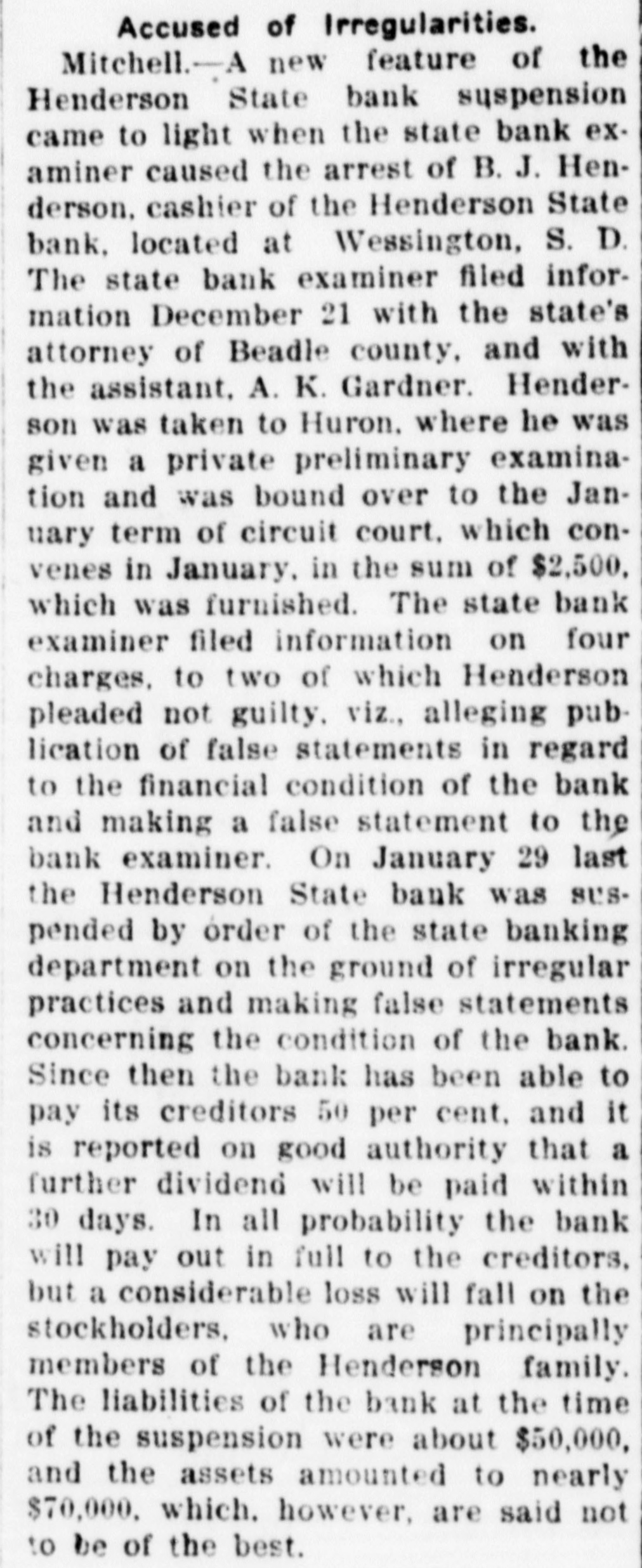 N.P. Heinz, of Aurora county, was found insane by the insanity commission and has been taken to the state insane hospital at Yankton. Mike Stadler, of Kimball county, has sold his entire herd of pure bred cattle. said to be the finest in the state, to R. C. Drake, of Plankinton. Articles of incorporation have been filed with the secretary of state for the Niobrara and Sioux City Railway Co., with a capital of $1,000,000. Farmers in the vicinity of Oelrich will use dynamite to loosen the soil on the theory that better crops can be grown if this method is followed. The Standard Oil company has selected McIntosh, in Corson county, its distributing point for that section of the state. A big building will be erected at once. M. F. Meyers, editor of the American Co-Operative Journal, of Chicago, addressed a big farmers' meeting at Hoven on the question of co-operative elevators and like enterprises The Minneapolis and St. Louis railway has granted a free freight rate on seed grain to the commissioners of McPherson county and bonds have been issued by the county to secure enough to supply the farmers. The drouth of last season in the western part of the state is now declared to be a blessing in disguise. It is said the stimulating effect which it had on irrigation and dry farming methods will more than make up for the losses occasioned. A newspaper printed in the language of the Sioux is being published by the Indians on the Cheyenne River reservation. A bananna tree at the state college at Brookings is about to bear its first crop of fruit since it was brought from tropical climes. Over 400 Knights of Columbus attended the big meeting of that order under the auspices of the Mount Marty Council at Yankton. The schools at Yankton have reopened foilowing a threatened epidemic of scarlet fever which caused the board to close them for a short period. The grand lodge of the Degree of Honor of South Dakota has incorporated under the laws of the state. It has been in the state for about 13 years. Harry Chambers and Clarence Middleton, two well known young men of Watertown, have been arrested charged with assaulting E. D. Wilson, of Noblesville. Ind. Miss Irene Tastad and Richard Rasmussen, of Woonsocket, sweethearts under parental displeasure, have disappeared and it is believed that they have eloped. All efforts to locate them have failed. A big good roads movement has been launched in Perkins county. It will begin its efforts by securing the construction of a good road from the county seat 40 miles to the nearest railroad point. Financial difficulties besetting the Betts Construction Co., of Huron, has caused the state association of Elks to take over the fine new building at Rapid City which that company was building for the order. The National Life Insurance Co., of Montpelier, Vt., the Bankers' Accident of Des Moines, the Jefferson Fire of Philadelphia, and the Ply. mouth Casualty of Minneapolis have withdrawn from the state. Reports from Berlin, Germany, are to the effect that Miss Cordelia Lee, a South Dakota girl, is making a big success in musical circles there. The same regulations regarding registration are to apply in South Dakota in the future for all municipal and local elections as for the state elections. The Henderson State bank, at Wessington, closed for some weeks because of inability to realize on overdue loans, may be placed in the hands of a receiver. Residents between Philip and Faith are petitioning for a mail line connecting those towns. At present mail has to travel 500 miles to get a distance of 60 miles. Indications are that the commission plan of government will be voted in at Watertown Saturday by a big majority. The campaign has been a vigorous one. Mystery surrounds the death of Mr. and Mrs. Chris Jensen, of Hurley, who were found dead in their home by neighbors. It is thought that they may have been overcome by coal gas. The success of the state builders meeting in session at Aberdeen exceeds all expectations and many present pronounce it one of the most significant gatherings ever held in the state. Weather and crop prophets throughout the state are predicting the great-