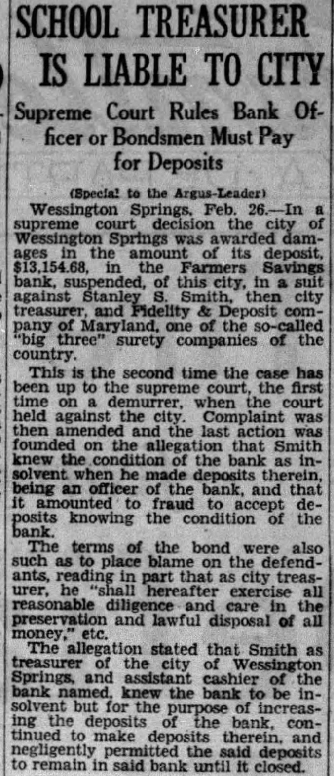 SCHOOL TREASURER IS LIABLE TO CITY Supreme Court Rules Bank Officer or Bondsmen Must Pay for Deposits (Special to the Springs. Feb. supreme the Springs was the amount of its deposit, the Farmers Savings bank, suspended, of this city, in against Stanley city and Fidelity of one of the surety of the country. This is the second time the case has up to the supreme court, the first time demurrer, when the court against the city. Complaint was then and the last action was on the allegation that Smith knew the the bank as inhe being an of the bank. and that it to to accept posits knowing the bank. The terms of the bond were also such to place on the defendants, part that as city treasurer, he hereafter all reasonable care in the and lawful disposal of all The allegation stated that Smith as treasurer of city of Wessington Springs, cashier bank knew the to be but the ing deposits the bank, continued to make deposits therein. and negligently the said deposits to remain in said bank until it closed.