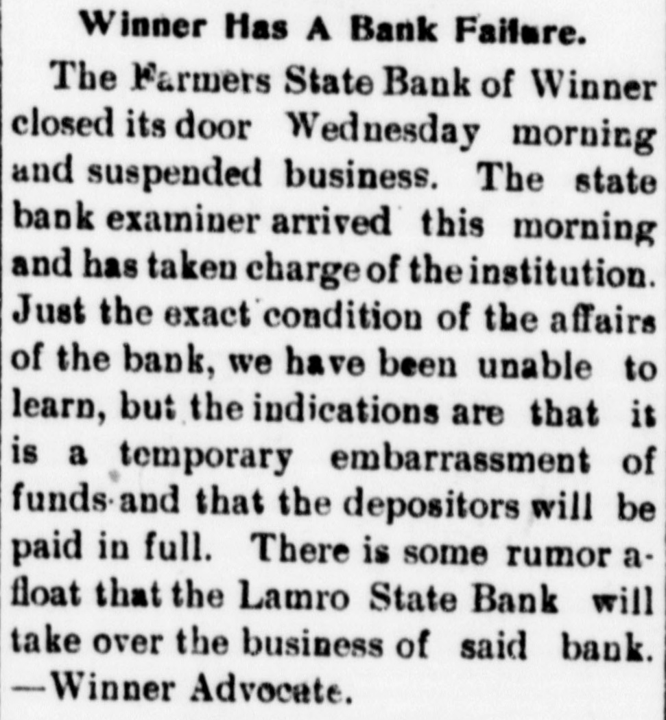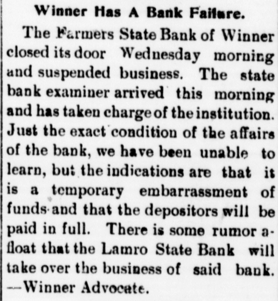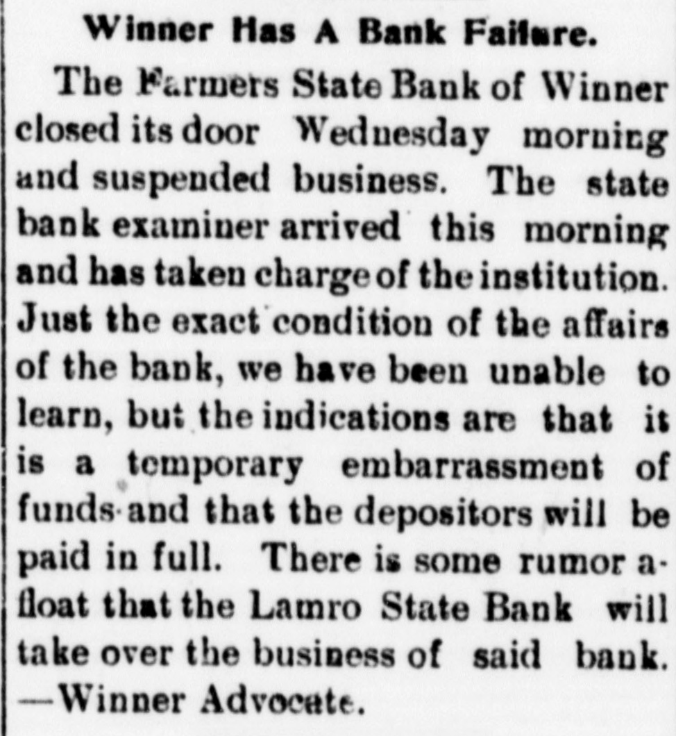 Winner Has A Bank Failure. The Farmers State Bank of Winner closed its door Wednesday morning and suspended business. The state bank examiner arrived this morning and has taken charge of the institution. Just the exact condition of the affairs of the bank, we have been unable to learn, but the indications are that it is a temporary embarrassment of funds and that the depositors will be paid in full. There is some rumor afloat that the Lamro State Bank will take over the business of said bank. - Winner Advocate.