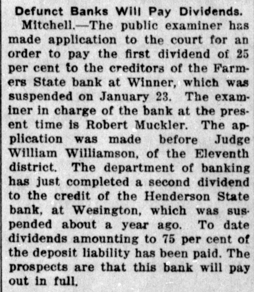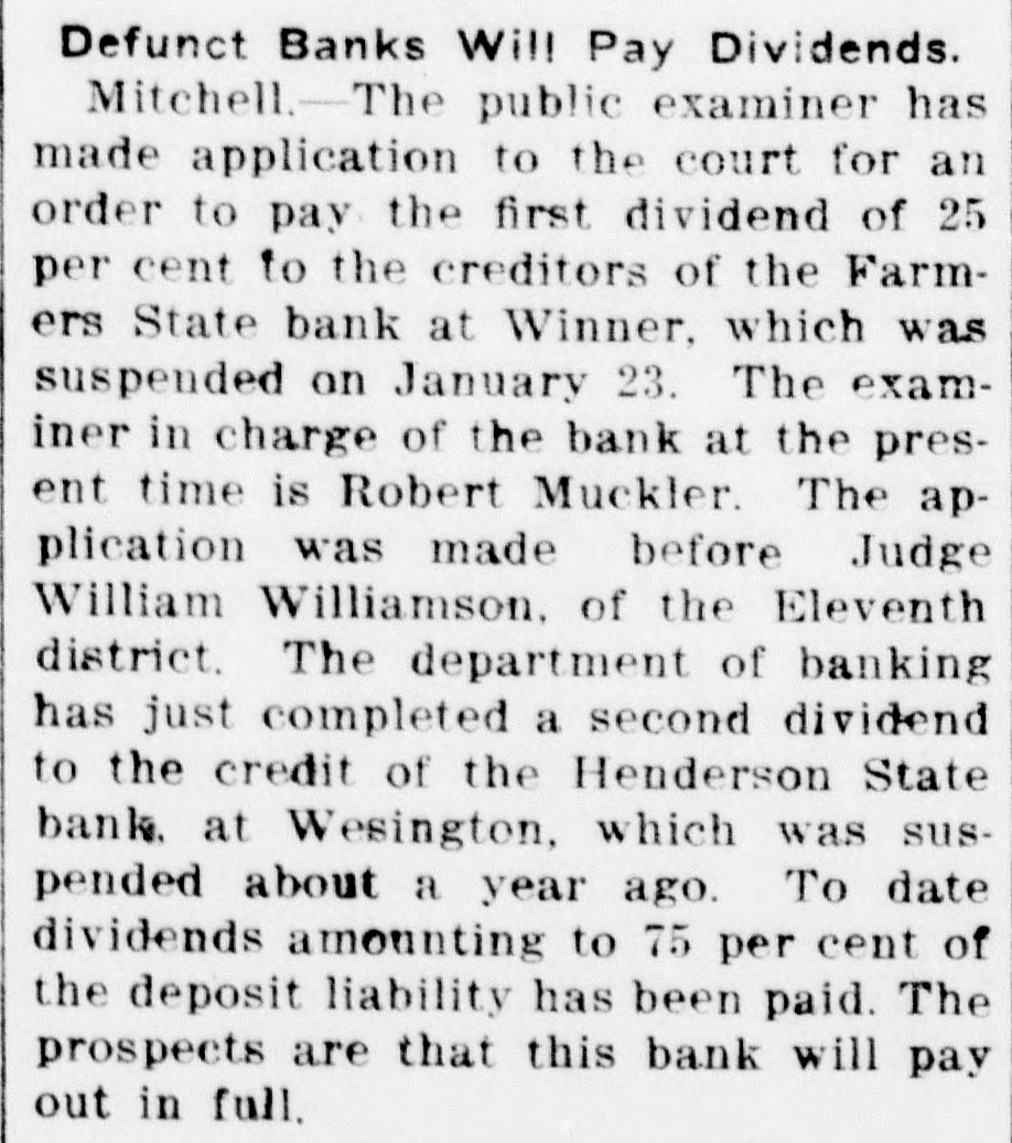 Defunct Banks Will Pay Dividends. Mitchell.-The public examiner has made application to the court for an order to pay the first dividend of 25 per cent to the creditors of the Farmers State bank at Winner, which was suspended on January 23. The examiner in charge of the bank at the present time is Robert Muckler. The application was made before Judge William Williamson, of the Eleventh district. The department of banking has just completed a second dividend to the credit of the Henderson State bank, at Wesington, which was suspended about a year ago. To date dividends amounting to 75 per cent of the deposit liability has been paid. The prospects are that this bank will pay out in full.
