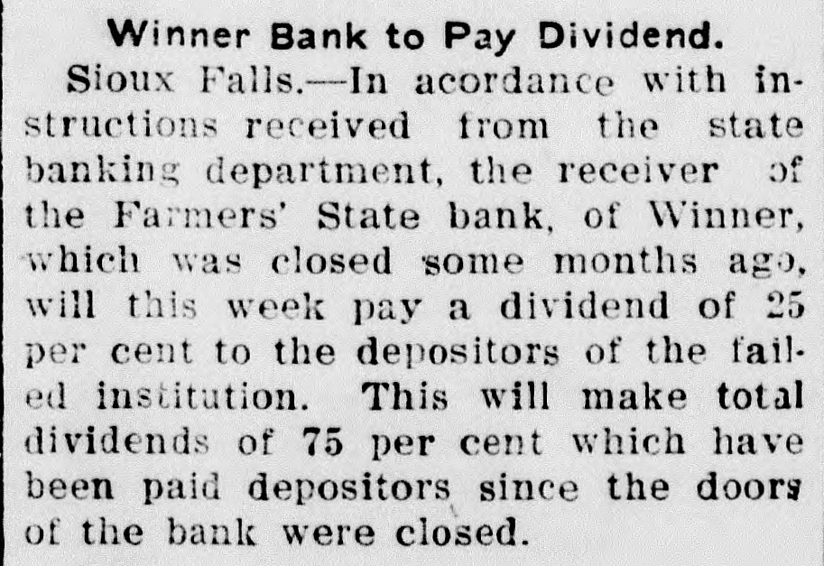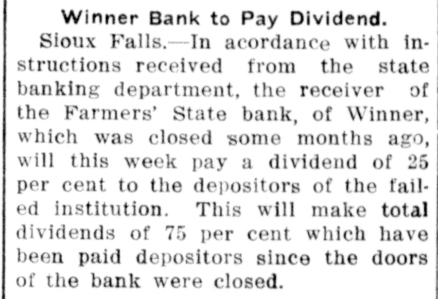 DAKOTA STATE NEWS DE SMET Arrangements are being completed for the 27th annual observance of the Kingsbury county old settlers day, which will be held here on Wednesday June 10. The Canova band and a band from Hetland have been engaged to furnish music for the occasion One of the the between grame ball 8 eq IIIA rectires Willow Lakes and the Howard teams for a purse of $126 Another feature will be a street parade of industrial floats. IPSWICH-The automobile owners of Edmunds county held a meeting and or ganized a county automobile association The following officers were elected: President, Charles W. Christian Roscoe: secretary-treasurer. John Haerter, Hosmer. An executive committee of two from each of the five county commissioner districts was selected and a general campaign for road improvement in all parts of the county was inaugurated. MONTROSE-John Kelley and Patrick O'Dea. of McCook county, were seriously hurt by being thrown from a buggy when their horses were frightened by a passing automobile. Kelley had 10 ribs broken, his collarbone broken and his breastbone crushed. O'Dea had a bone in one of his feet broken and was badly bruised and cut. CUSTER-Procuring poison in some unknown manner, Edward L. Ruddock, a Custer county young man who recently was adjudged to be insane and who was being cared for by his half brother, swallowed it and ended his life. The young man for some time had been depressed and had frequently threatened to kill himself. DEADWOOD-Governor Byrne has appointed George B. Porter special census enumerator for Deadwood, the appointment being under the provisions of the act which authorizes such appointment for the purpose of determining the population for fixing the number of legal saloons the B up BRIDGEWATER-Bridgewater will celuI manuer Sujsnos B up to Ains ebrate addition to the regular program for the day a Chautauqua course will be opened. Sufficient funds have been pledged to finance the double attraction which will draw a large number of people here on that occasion. GETTYSBURG-Rev. R. A. Bruce, of Brookings, gave the graduating address here and Rev. J. T. Brotner-Smith gave the baccalaureate sermon. The graduates are Ethel Kempf, Geneva Schofield, Gladys Benson and Roy Weaver CANTON-Peter Quartel, of internationJO senst B sp standers Rospell B se Pame la Rev. Geo. Edw. Lewis, pastor of the Congregational church He sang Sunday to two of the largest gatherings ever gathered in Canton for religious purposes. He will sing in the Congregational church each each night this week and again at the opera house Sunday morning and Sunday evening. SIOUX FALLS-Col C. A B Fox, of this city, upon his return from the annual encampment of the Grand Army of the Republic, department of South Dakota, held at Redfield, where he was elected commander of the department for the coming year. was tendered a reception by the members of Joe Hooker post, G. A. R., and the Women's Relief corps WATERTOWN-The 33d annual convention of the South Dakota Medical association convened here Tuesday. The program covers four days. Sessions for business and for professional discussion will be interspersed with entertainment furnished by the physicians of Watertown and the Commercial club. PARKSTON-The Women's Relief corns, recently organized here, has installed the following officers: President, Miss Margretha J. Stamp; vice presidents, Mrs. Lydia Mowry, Mrs. Melinda Welch; chaplain, Mrs. Martha Adkins; secretary, Mrs. Mamie Olds; treasurer, Mrs. Florence Peckham. CRESBARD-The officers and directors of the Old Settlers' association of Faulk county have fixed Thursday, June 18, as the time for the annual picnic and celebration of the association. The picnic and celebration will be held in what is known as the Horning grove, near Cresbard. BUTLER-Mr. and Mrs. John Bushler, pioneer residents of Day county, recently celebrated their golden wedding anniversary. Mr. Bushler is 67 years of age, while his wife is 64. Both are enjoying good health. They were among the earl lest settlers of Day county. ESTELLINE-The annual convention of the Hamlin County Sunday School association will be held in Estelline on Tuesday and Wednesday, June 16 and 17. Among the speakers will be George W. Miller, general secretary of the State Sunday School association. week for the State Normal school located here opened with an out of door performance the sq ''+I 1 nox SV., 10 Coburn players, of New York. Many visitors attended from neighboring towns. WATERTOWN-Joe Collins, of Castlewood, who sustained the loss of his heel by getting it caught in the rear wheel of a motorcycle he was riding through the streets of Watertown, died Monday JO COLOME-While plowing in an old corn field Mark Murphy, a homesteader living some miles from here, made an interestperficed the JO the up "puy,, Sup remains of a young bird, evidently not more than two weeks old at the time of its death. It is perfectly formed, only the missing befus 1 WINNER-The receiver of the Farmers' State bank, of Winner, which was closed more than a year ago, has been authorized by the state bank department to pay another 25 per cent dividend. This will make a total of 75 per cent in dividends which has been paid since the bank failed.