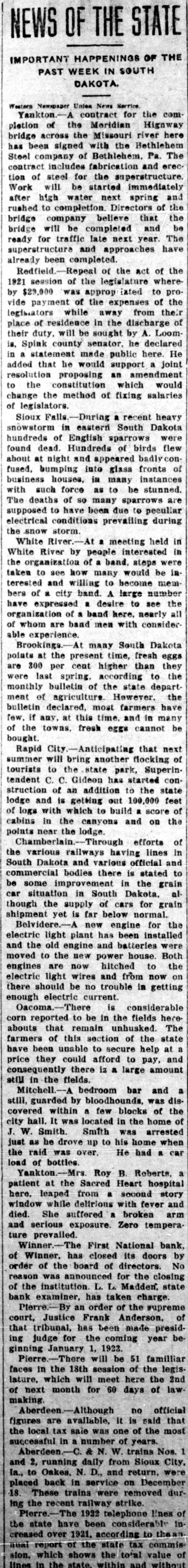 NEWS OF THE STATE IMPORTANT HAPPENINGS OF THE PAST WEEK IN SOUTH DAKOTA. Western Newspaper Union News Service. Yankton.-A contract for the completion of the Moridian Hignway bridge across the Missouri river here has been signed with the Hethlehem Steel company of Bethlehem, Pa. The contract includes fabrication and erection of steel for the superstructure. Work will be started immediately after high water next spring and rushed to completion. Directors of the bridge company believe that the bridge will be completed and be ready for traffic late next year. The superstructure and approaches have already been completed. Redfieid.-Repeal of the act of the 1921 session of the legislature whereby $23,000 was approp inted to provide payment of the expenses of the legislators while away from their place of residence in the discharge of their duty, will be sought by A. Loomis, Spink county senator, he declared in a statement made public here. He added that he would support a joint resolution proposing an amendment to the constitution which would change the method of fixing salaries of legislators. Sioux Falls.-During a recent heavy snowstorm in eastern South Dakota hundreds of English sparrows were found dead. Hundreds of birds flew about at night and appeared badlyconfused, bumping into glass fronts of business houses, in many instances with such force as to be stunned. The deaths of so many sparrows are supposed to have been due to pecullar electrical conditions prevailing during the snow storm. White River.-At a meeting held in White River by people interested in the organization of a band, steps were taken to see how many would be interested and willing to become members of at. city band. A large number have expressed a desire to see the organization of a band here. nearly all of whom are band men with considerable experience. Brookings.-A many South Dakota points at the present time, fresh eggs are 300 per cent higher than they were last spring. according to the monthly bulletin of the state department of agriculture. However, the bulletin declared, most farmers have few. if any. at this time, and in many of the towns. fresh eggs cannot be bought. Rapid City.Anticipating that next summer will bring another flocking of tourists to the state park, Superintendent C. C. Gideon has started construction of an addition to the state lodge and is getting out 100,000 feet of logs with which to build a score of cabins in the canyons and on the points near the lodge. Chamberlain.--Through efforts of the various railways having lines in South Dakota and various official and commercial bodies there is stated to be some improvement in the grain car situation in South Dakota, although the supply of cars for grain shipment yet is far below normal. Belvidere.-A new engine for the electric light plant has been installed and the old engine and batteries were moved to the new power house. Both engines are now hitched to the electric light wires and from now on there should be no trouble in getting enough electric current. Oacoma.-There is considerable corn reported to be in the fields hereabouts that remain unhusked. The farmers of this section of the state have been unable to secure help at a price they could afford to pay, and consequently there is a large amount still in the fields. Mitchell.-A bedroom bar and a still, guarded by bloodhounds, was discovered within a few blocks of the city hall. It was located in the home of J. W. Smith. Smith was arrested just as he drove up to his home when the raid was over. He had a car load of bottles. Yankton.-Mrs. Roy B. Reberts, a patient at the Sacred Heart hospital here. leaped from a second story window while delirious with fever and died. She suffered a broken arm and serious exposure. Zero temperature prevailed. Winner.-The First National bank, of Winner, has closed its doors by order of the board of directors. No reason was announced for the closing of the institution. L. L. Madden, state bank examiner, has taken charge. Pierre.-By an order of the supreme court, Justice Frank Anderson, of that tribunal, has been made presiding judge for the coming year beginning January 1, 1923. Pierre-There will be 51 familliar faces in the 18th session of the legislature, which will meet here the 2nd of next month for 60 days of lawmaking. Aberdeen.-Although no official figures are available, it is said that the local tax sale was one of the most successful in a number of years. Aberdeen.-C. & N. W. trains Nos.1 and 2, running daily from Sioux City, Ia., to Oakes, N. D., and return, were placed back in service on December 18 These trains were removed durIng the recent railway strike. Pierre-The 1922 telephone Enes of