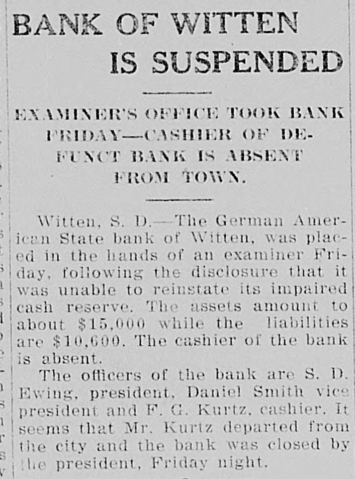 BANK OF WITTEN IS SUSPENDED EXAMINER'S OFFICE TOOK BANK PRIDAY-CASHIER OF DEFUNCT BANK IS ABSENT FROM TOWN. Witten, S. D.-The German American State bank of Witten, was placed in the hands of an examiner Friday, following the disclosure that it was unable to reinstate its impaired cash reserve. The assets amount to about $15,000 while the liabilities are $10,600. The cashier of the bank is absent. The officers of the bank are S. D. Ewing, president, Daniel Smith vice president and F. G. Kurtz, cashier. It seems that Mr. Kurtz departed from the city and the bank was closed by the president, Friday night.
