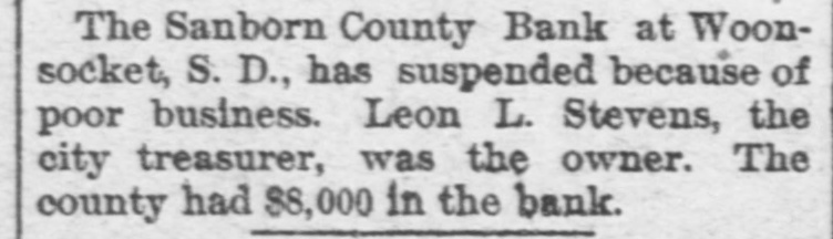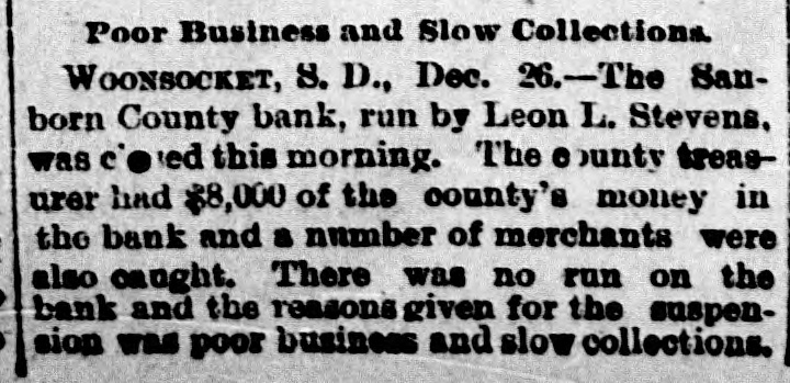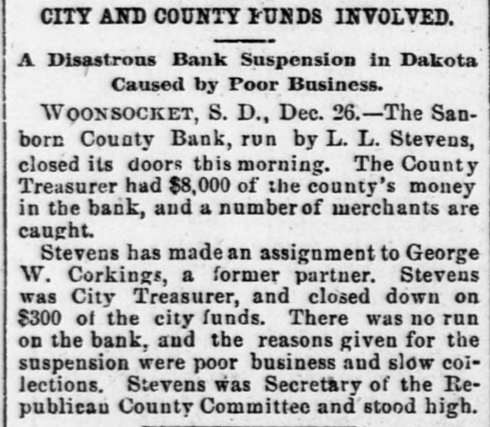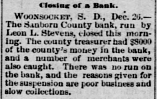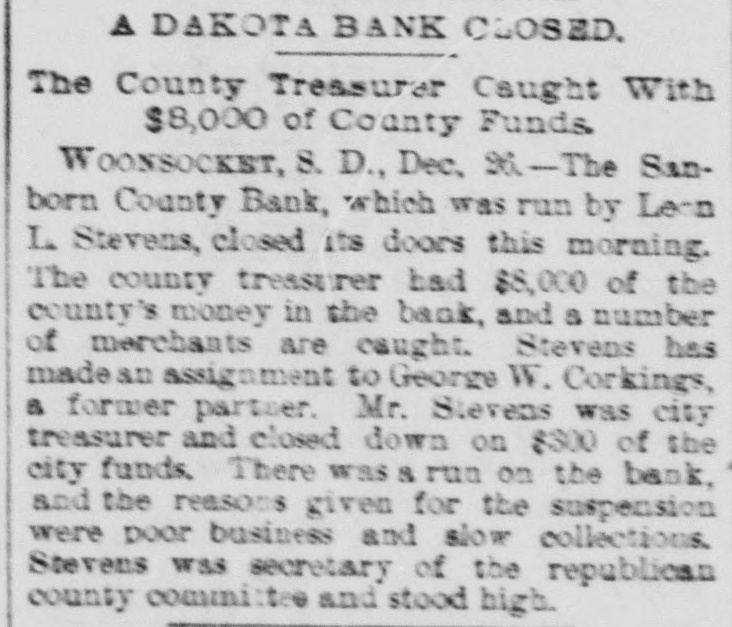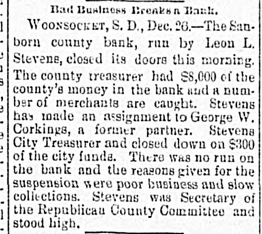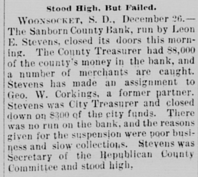 Stood High, But Failed. WOONSOCKET, S. D., December 26.The Sanborn County Bank, run by Leon E. Stevens, closed its doors this morning. The County Treasurer had $8,000 of the county's money in the bank, and a number of merchants are caught. Stevens has made an assignment to Geo. W. Corkings, a former partner. Stevens was City Treasurer and closed down on $300 of the city funds. There was no run on the bank, and the reasons given for the suspension were poor business and slow collections. Stevens was Secretary of the Republican County Committee and stood high,