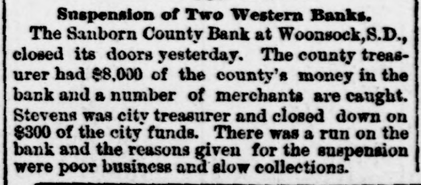 Suspension of Two Western Banks. The Sanborn County Bank at Woonsock,S.D., closed its doors yesterday. The county treasurer had $8,000 of the county's money in the bank and a number of merchants are caught. Stevens was city treasurer and closed down on $300 of the city funds. There was a run on the bank and the reasons given for the suspension were poor business and slow collections.