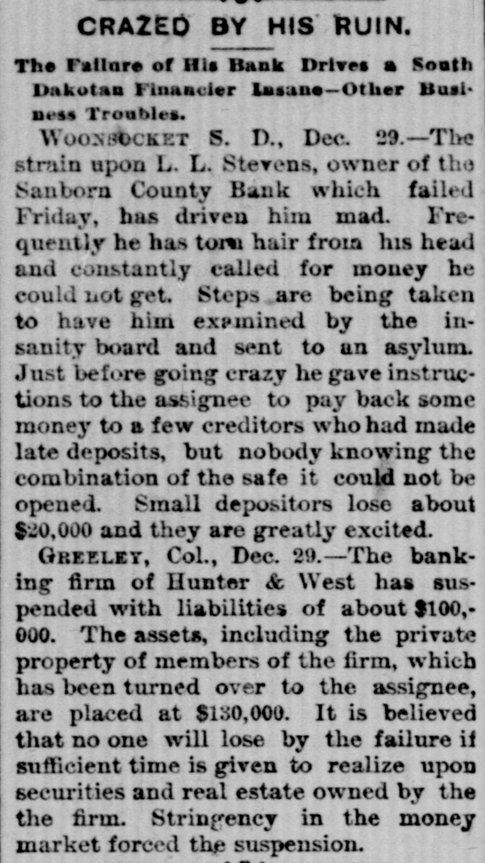 CRAZED BY HIS RUIN. The Failure of His Bank Drives a South Dakotan Financier Insane-Other Business Troubles. WOONSOCKET S. D., Dec. 29.-The strain upon L. L. Stevens, owner of the Sanborn County Bank which failed Friday, has driven him mad. Frequently he has torn hair from his head and constantly called for money he could not get. Steps are being taken to have him examined by the insanity board and sent to an asylum. Just before going crazy he gave instructions to the assignee to pay back some money to a few creditors who had made late deposits, but nobody knowing the combination of the safe it could not be opened. Small depositors lose about $20,000 and they are greatly excited. GREELEY, Col., Dec. 29.-The banking firm of Hunter & West has suspended with liabilities of about $100,000. The assets, including the private property of members of the firm, which has been turned over to the assignee, are placed at $130,000. It is believed that no one will lose by the failure if sufficient time is given to realize upon securities and real estate owned by the the firm. Stringency in the money market forced the suspension.