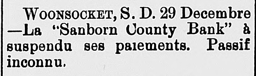 WOONSOCKET, S. D. 29 Decembre -La "Sanborn County Bank" à suspendu ses paiements. Passif inconnu.