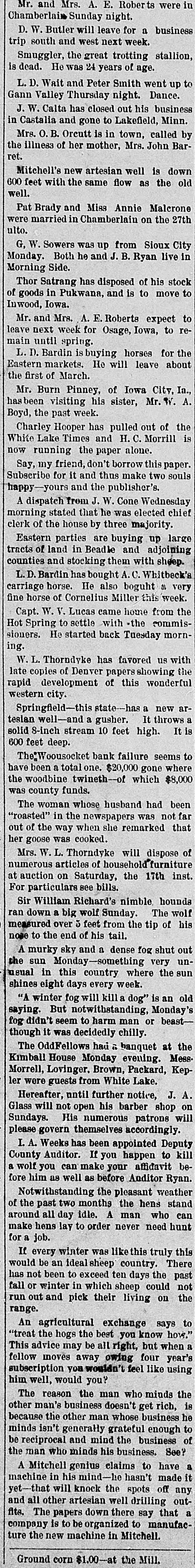 Mr. and Mrs. A. E. Roberts were in Chamberlain Sunday night. D. W. Butler will leave for a business trip south and west next week. Smuggler, the great trotting stallion, is dead. He was 24 years of age. L. D. Wait and Peter Smith went up to Gann Valley Thursday night. Dance. J. W. Calta has closed out his business in Castalia and gone to Lakefield, Minn. Mrs. O. B. Orcutt is in town, called by the illness of her mother, Mrs. John Barret. Mitchell's new artesian well is down 600 feet with the same flow as the old well. Pat Brady and Miss Annie Malcrone were married in Chamberlain on the 27th ulto. G, W. Sowers was up from Sioux City Monday. Both he and J. B. Ryan live in Morning Side. Thor Satrang has disposed of his stock of goods in Pukwana, and is to move to Inwood, Iowa. Mr. and Mrs. A. E. Roberts expect to leave next week for Osage, Iowa, to re- main until spring. L. D. Bardin is buying horses for the Eastern markets. He will leave about the first of March. Mr. Burn Pinney, of Iowa City, Ia., has been visiting his sister, Mr. V. A. Boyd, the past week. Charley Hooper has pulled out of the White Lake Times and H. C. Morrill is now running the paper alone. Say, my friend, don't borrow this paper. Subscribe for it and thus make two souls happy-yours and the publisher's. A dispatch from J. W. Cone Wednesday morning stated that he was elected chief clerk of the house by three majority. Eastern parties are buying up large tracts of land in Beadle and adjoining counties and stocking them with sheep. L. D. Bardin has bought A. C. Whitbeck's carriage horse. He also boguht a very fine horse of Cornelius Miller this week. Capt. W. V. Lucas came home from the Hot Spring to settle with the commis- sioners. He started back Tuesday morn- ing. W. L. Thorndyke has favored us with late copies of Denver papers showing the rapid development of this wonderful western city. Springfield-this state-has a new ar- tesian well-and a gusher. It throws a solid 8-inch stream 10 feet high. It is 600 feet deep. The Woousocket bank failure seems to have been a total one. $20,000 gone where the woodbine twineth-of which $8,000 was county funds. The woman whose husband had been "roasted" in the newspapers was not far out of the way when she remarked that her goose was cooked. Mrs. W. L. Thorndyke will dispose of numerous articles of household furniture at auction on Saturday, the 17th inst. For particulars see bills. Sir William Richard's nimble hounds ran down a big wolf Sunday. The wolf measured over 5 feet from the tip of his nose to the end of his tail. A murky sky and a dense fog shut out the sun Monday-something very un- usual in this country where the sun shines eight days every week. "A winter fog will kill a dog" is an old saying. But notwithstanding, Monday's fog didn't seem to harm man or beast- though it was decidedly chilly. The OddFellows had a banquet at the Kimball House Monday evening. Mess. Morrell, Lovinger, Brown, Packard, Kep- ler were guests from White Lake. Hereafter, until further notice, J. A. Glass will not open his barber shop on Sundays. His numerous patrons will please govern themselves accordingly. I. A. Weeks has been appointed Deputy County Auditor. If you happen to kill a wolf you can make your affidavit be- fore him as well as before Anditor Ryan. Notwithstanding the pleasant weather of the past two months the hens stand around all day idle. A man who can make hens lay to order never need hunt for a job. If every winter was like this truly this would be an ideal sheep country. There has not been to exceed ten days the past fall or winter in which sheep could not run out and pick their living on the range. An agricultural exchange says to "treat the hogs the best you know how." This advice may be all right, but when a fellow moves away owing four year's subscription you wouldn't feel like using him well, would you? The reason the man who minds the other man's business doesn't get rich, is because the other man whose business he minds isn't generally grateful enough to be reciprocal and mind the business of the man who minds his business. See? A Mitchell genius claims to have a machine in his mind he hasn't made it yet-that will knock the spots off any and all other artesian well drilling out- fits. The papers down there say that a company is to be organized to manufac- ture the new machine in Mitchell. Ground corn $1.00-at the Mill.